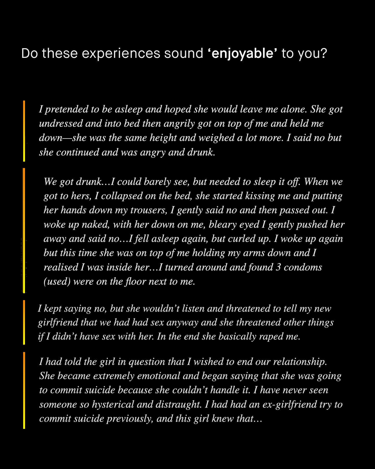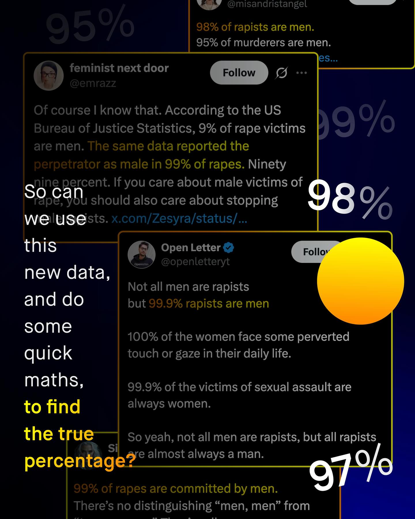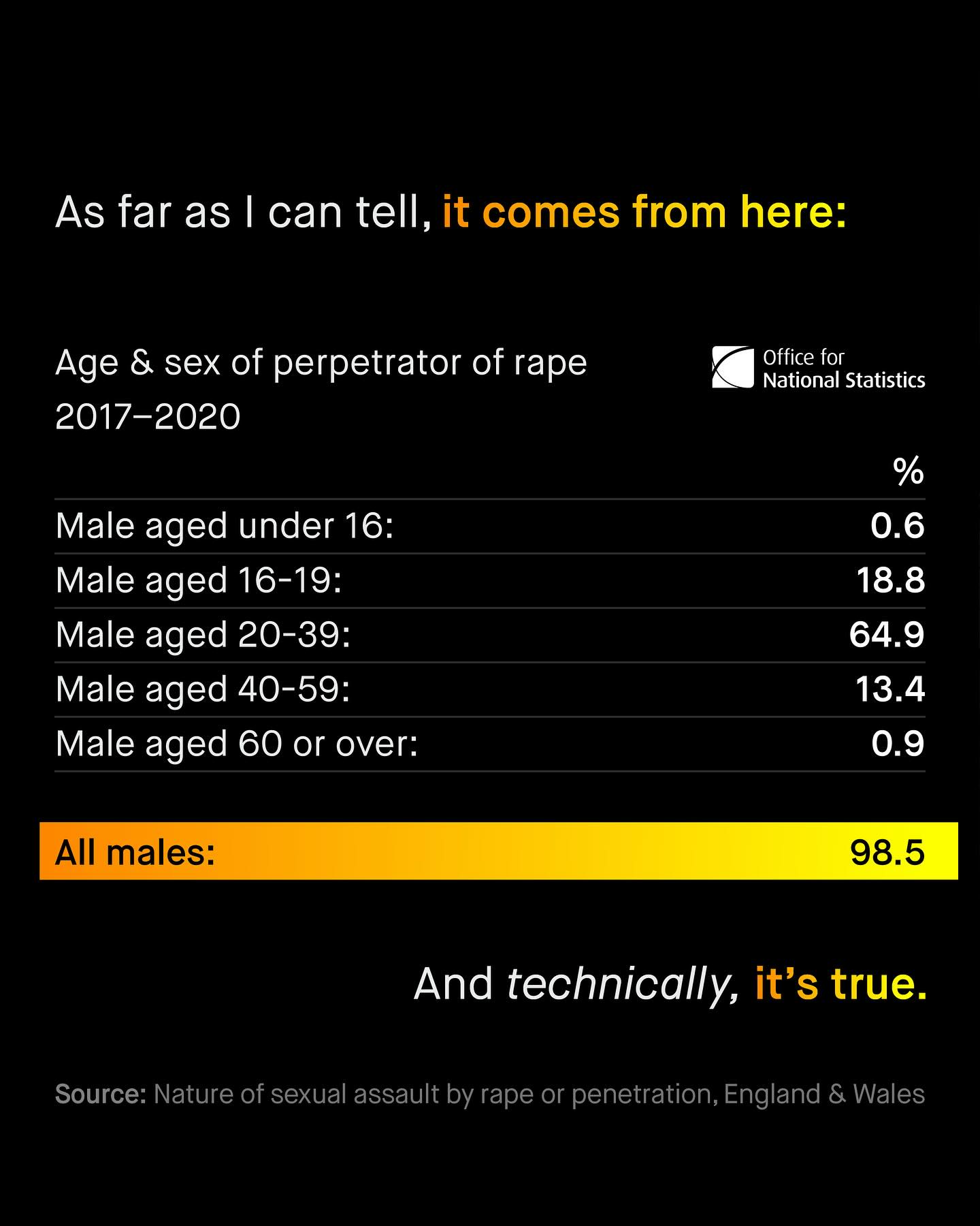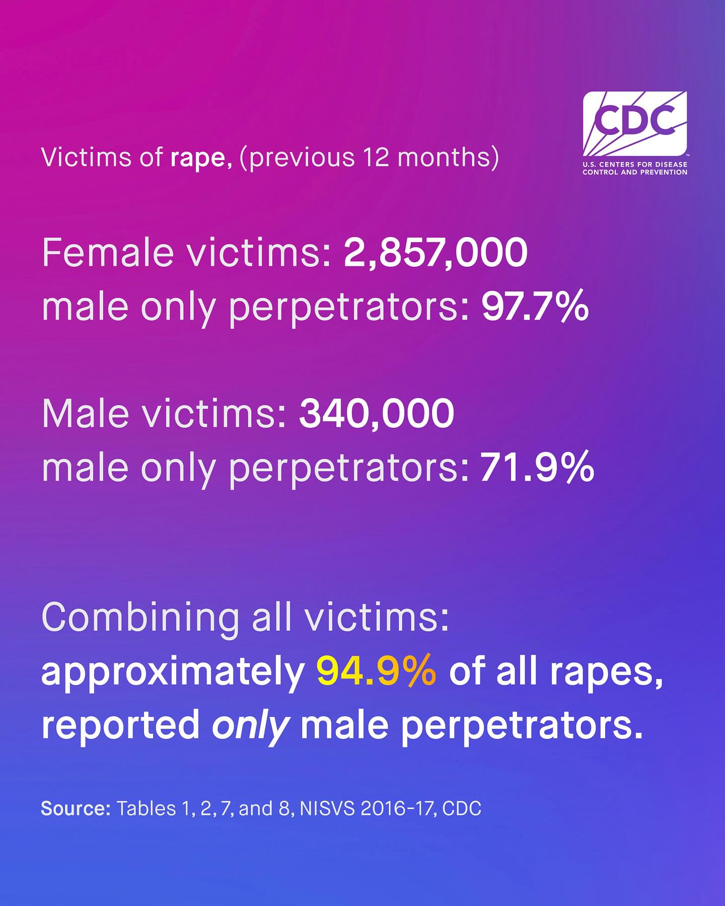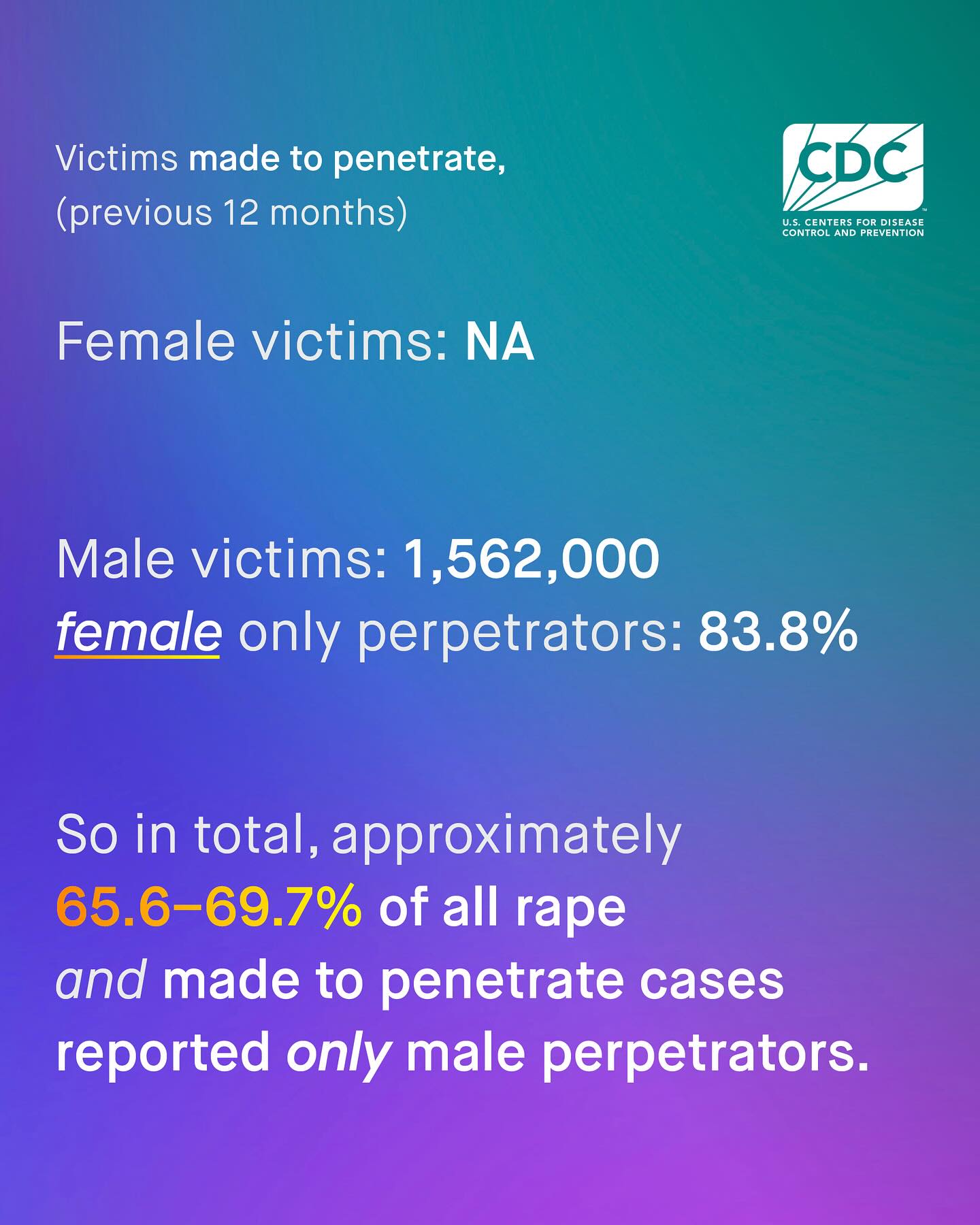 It’s a claim we’ve all heard before, and is the new calling card of TERFs; spat out across social media, newspaper headlines, and comment sections alike. Sometimes its “99%”, or “98%”, or similar, either way, the narrative is the same; that ‘rape’ is one way, and one way only, and it’s men as a group who are the problem. Intuitively it seems true. And it is true. But when you understand how we define what ‘rape’ is, both legally and academically, you’ll see why. That is, for a crime to be considered ‘rape’, the perpetrator must have a penis, and that, in simple terms explains the ’99% are men’ claim. For how can a woman commit a crime that is defined in such a way? And more so, what does this mean for the men and boys who are forced, pressured, or coerced, incapacitated or otherwise, into having sex, with a woman? Well, those male victims are awkwardly classed as ‘made to penetrate’, and in the U.K. we don’t capture that data, and simply do not know how many male victims there are. The CDC however, does capture this data, and presents a far truer, more inclusive, progressive and shocking view of sexual violence, that finds that male victims are not an insignificant rounding error, and neither are female perpetrators. No matter how you slice the pie, no victim of sexual violence, no matter how few, of either sex, should be erased or left behind. So let me show you the full picture. What do you think? ~ Artwork by Feminist Collages Manchester NISVS 2016/17 Sibohan Weare ONS Washington Post
