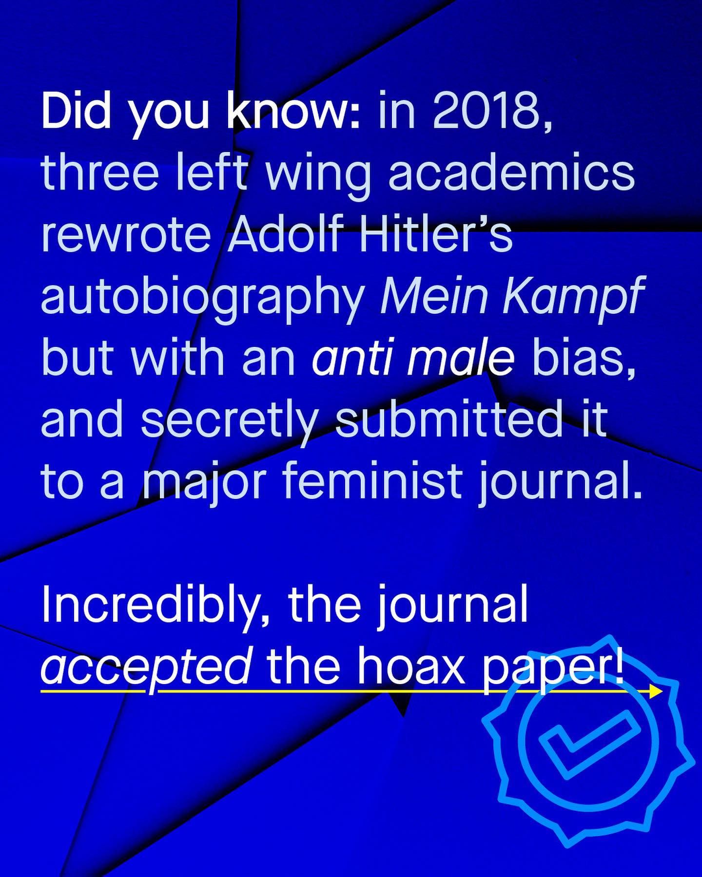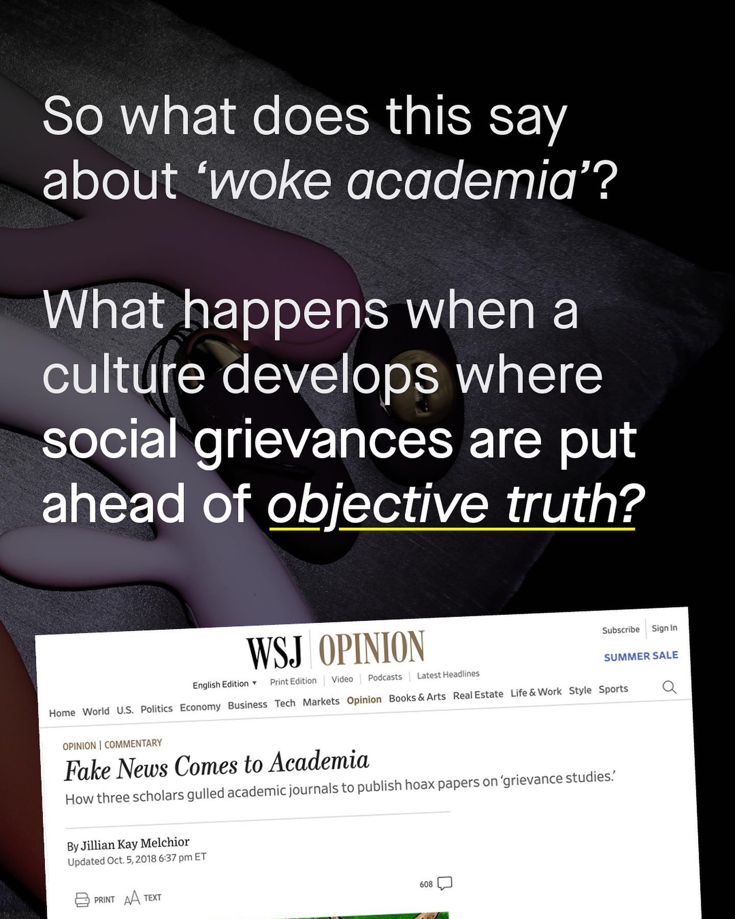 A new culture of academia is going mainstream, one where only certain conclusions are allowed. One where being politically fashionable and looking good, is more important than empiricism and objective truth. Where society turns its head away from the painful and unpopular realities of life. And votes for what’s easy. Why? Because sometimes the truth hurts; is not always popular or comfortable. It won’t always win you awards, applause, fame and Instagram likes. Hey – did you know that when accounting for time worked, job sector, level of experience and parental leave, Western women are paid *the same* as men? We don’t care. That’s far too boring a reality to fit on my garish t shirt, and these outrageous placards have a strict word count. So the battle between what looks good and what is evidently correct, wages its everlasting arm wrestle. A battle strung through pop culture, the news, media, politics and splattered across our social media feeds. …But what happens when frustrated academics play the machine at its own game? When they write entirely made up and factually unsound articles, that provide the politically fashionable conclusions so many want to read? Well, in 2018 we found out… ~ Short documentary here https://tinyurl.com/4t89jxtj Images by Brandi Redd, Charles Deluvio, Annie Spratt and Unseen Histories, from Unsplash. Illustration by Nareerat Jaikaew from the Noun Project.