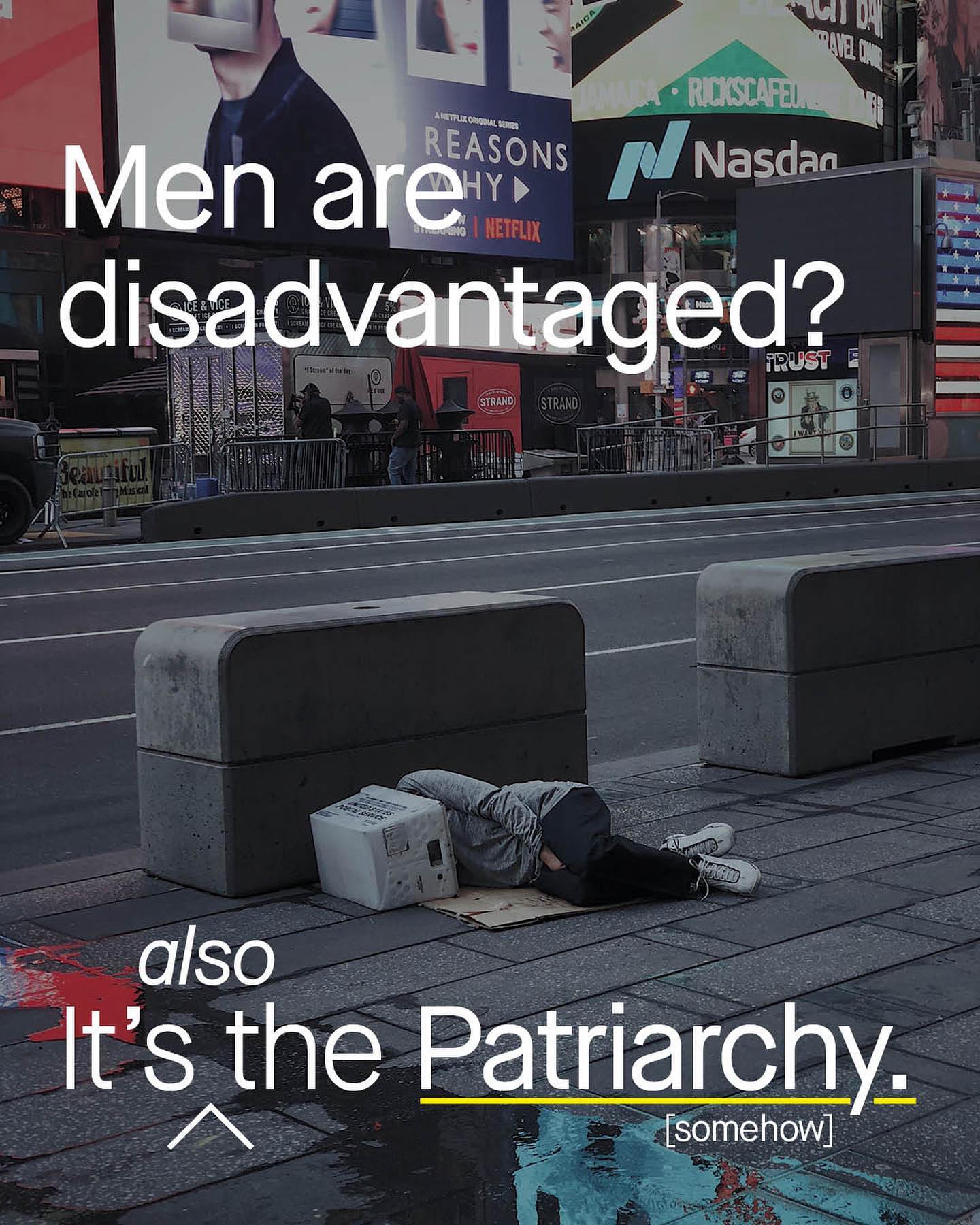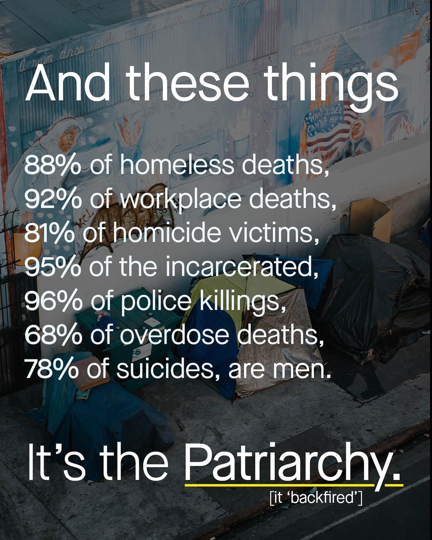 Is there nothing the patriarchy doesn’t fuck up? It’s hurting women, it’s hurting men, it’s putting men in power, it’s turfing them out onto the streets. If a man does something bad, its ya boy enacting the patriarchy. If a woman does something bad, boom, patriarchy made her do it. Point to a male CEO – that’s an easy one – you’re pointing to patriarchy. Point to a homeless man, and you’re still pointing to patriarchy, somehow. So the broken record repeats, and repeats, and repeats. Domestic abuse? Patriarchy. Sexual violence? Patriarchy Suicide? Patriarchy. Fathers without rights? Patriarchy. Such absolute, indisputable and monocausal thinking, is not scientific – in fact, it’s symptomatic of a religious cult. And yet it’s found its way into legislation, domestic violence strategies, political discourse, and even the APA’s psychotherapy guidelines for men and boys. The US has four tax funded departments for women’s health, and none for men. Even when I pointed this out, I had comments calling this ‘patriarchy’ too. So now, a political structure that advantages women – is a patriarchy? Get outta here. Such a concept is so vague and meaningless, it is both everywhere and no where. And so the feminist movement, like an angry gorilla trying to fight mist, smashes nothing. Meanwhile the highly technical worlds of economics, anthropology, psychology, human biology, and the precise scientific tools that come with them, are ignored. We can’t reach for them to understand domestic abuse, the pay gap, or sexual violence. We darn’t because we’re scared, intimidated and cowed into subservience. So toe the line, don’t ask questions and follow the approved script. Sounds awfully familiar. ~ Images by Mackenzie Marco, Giorgio Trovato, Jon Tyson, Laila Gebhard, Nazar Strutynsky, Philipp Lansing and Sigmund V from Unsplash. Homeless Deaths Work Place Deaths Police Killings Homicide Victims Incarcerated US Suicides Overdoses