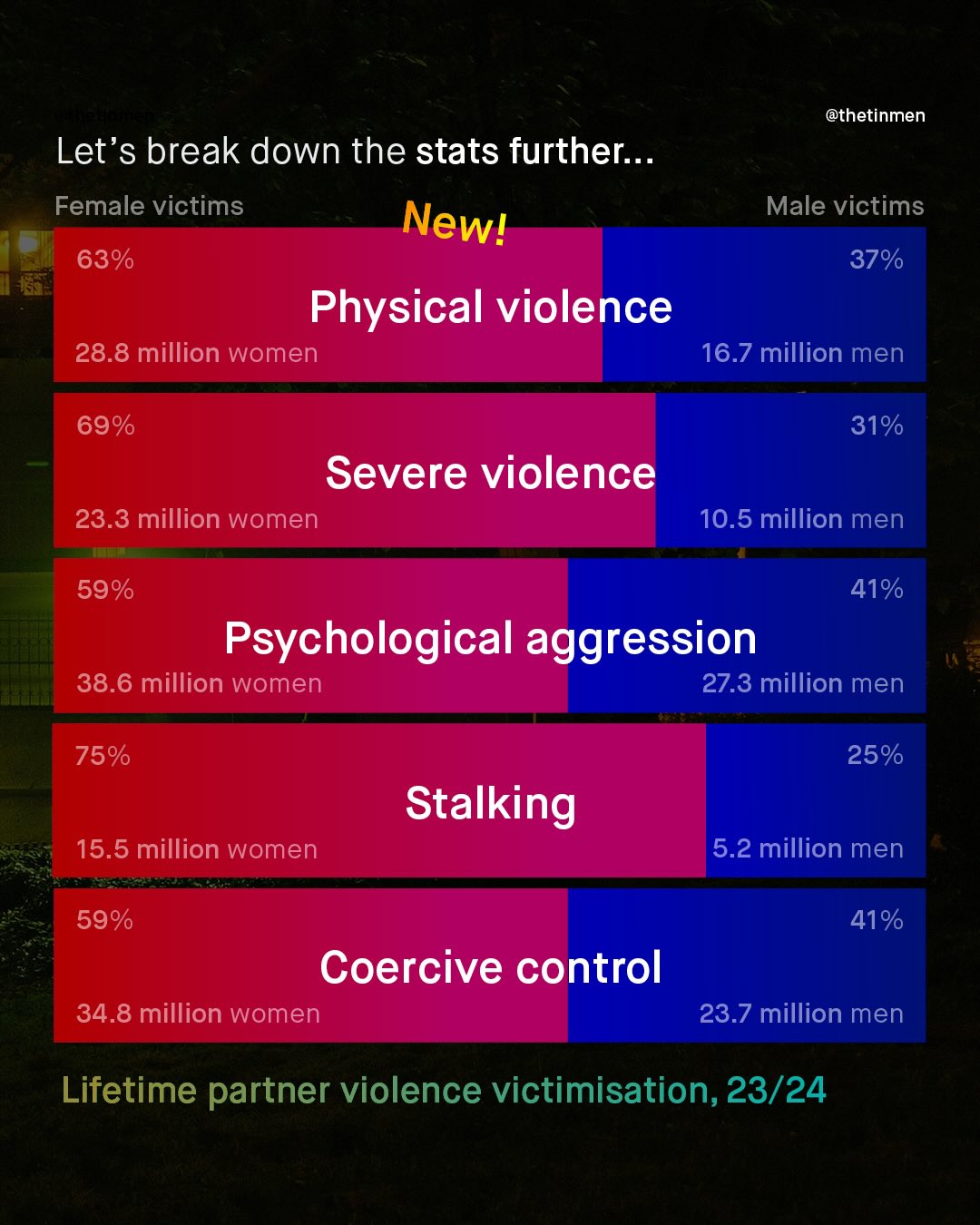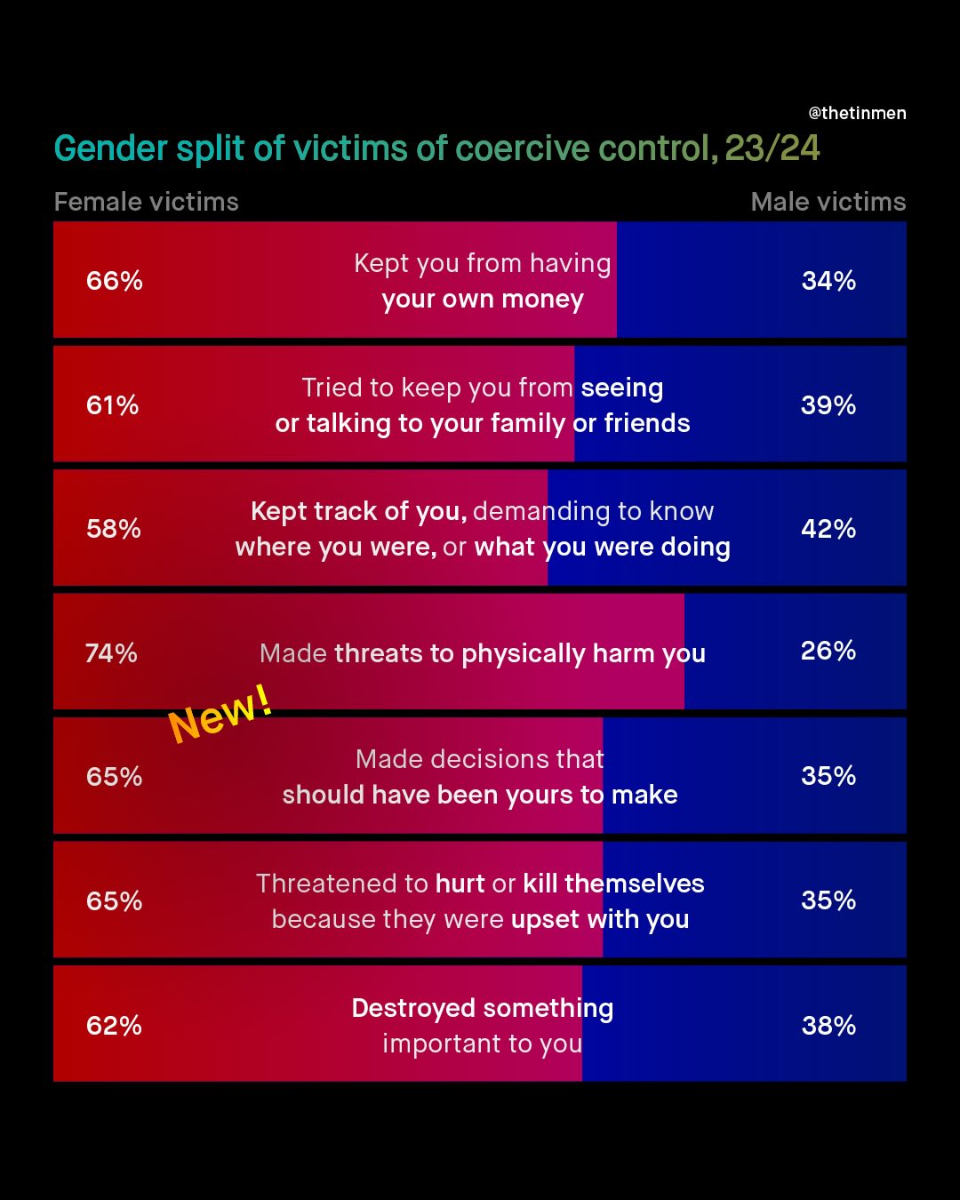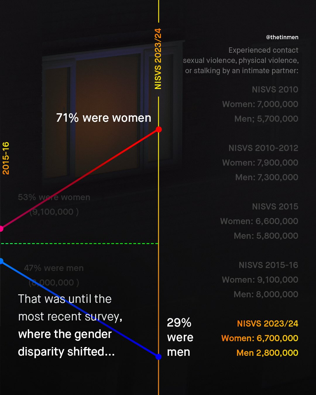 Every few years, the CDC releases their National Intimate Partner and Sexual Violence Survey (NISVS); which is arguably America’s largest, and highest quality survey on intimate partner violence. In the previous release, from 2015/16, and in every NISVS published prior (2010, 2010-12, and 2015), the data revealed near gender parity in victimisation of intimate partner violence; a shocking, and deeply unpopular finding, that you will have seen on TheTinMen. But in the new survey, released just a few weeks ago, things have changed; with the cumulative victims of those who experienced sexual violence, physical violence, and/or stalking by an intimate partner, shifting from near 50:50, to become 70:30, with women as the majority. How this breaks down into physical violence, coercive control, and psychological aggression, is closer to parity, at roughly 60:40, but still, the shift in the latest survey is clear, and worth discussing. The CDC have noted they have changed the survey questions, emphasising coercive control, and psychological aggression, as well as changing to an online, rather than phone-based survey as previously used. Furthermore, we all know that since the last survey (in 2015/16) a huge societal shift has happened, with #MeToo making violence against women a national conversation in 2017, which certainly will have encouraged more women to disclose their abuse too. Whatever the reason, what is most important, is that even though this new data shows men as ‘just’ 30% of IPV victims overall, this still represents millions of American men, who should not be waved away as insignificant. So what do you think of the stats? How can you explain this rather dramatic shift? And how do we support all victims, no matter the gender, and no matter how few? What do you think? ~ NISVS 23/24 https://tinyurl.com/9zxy3y8w
