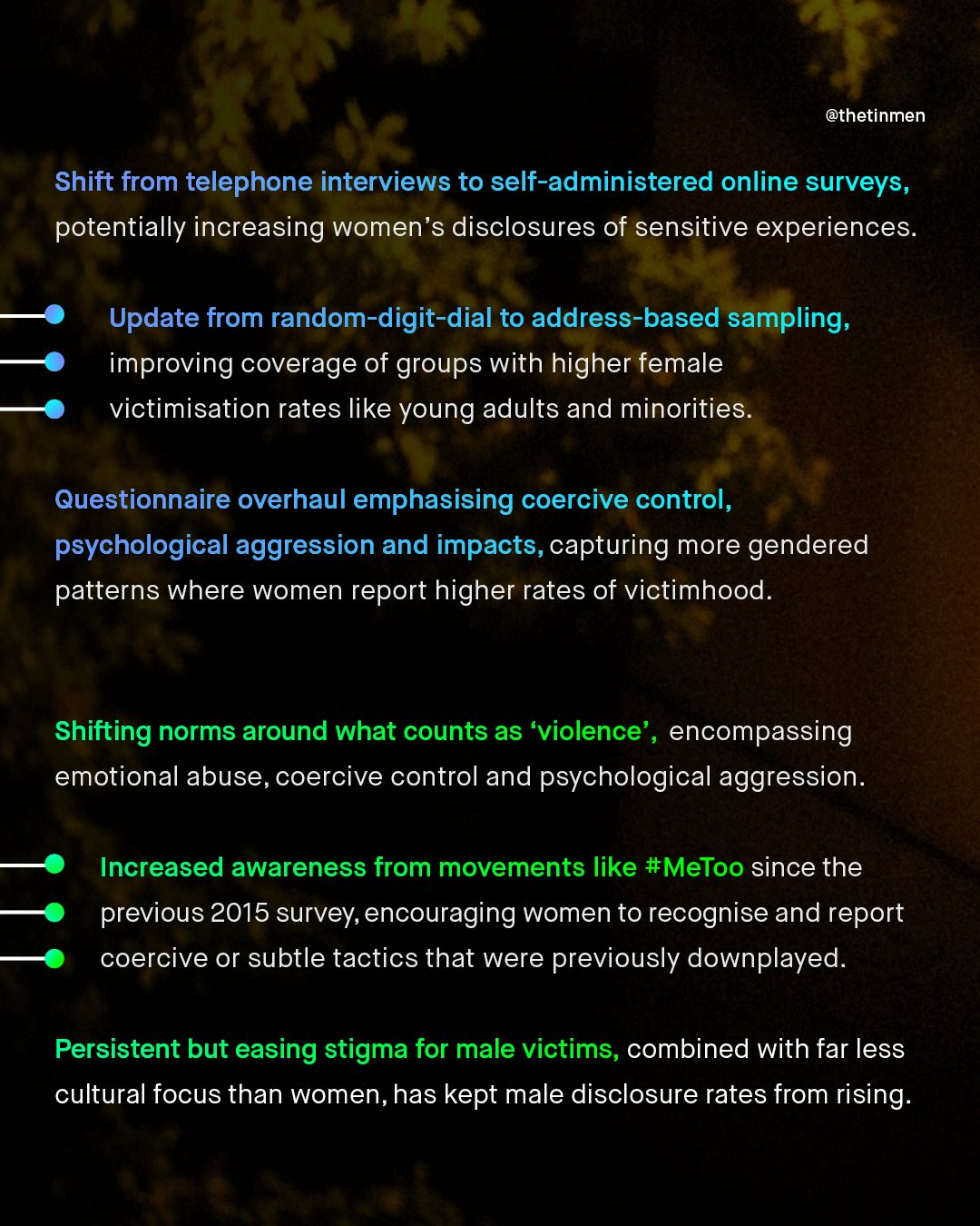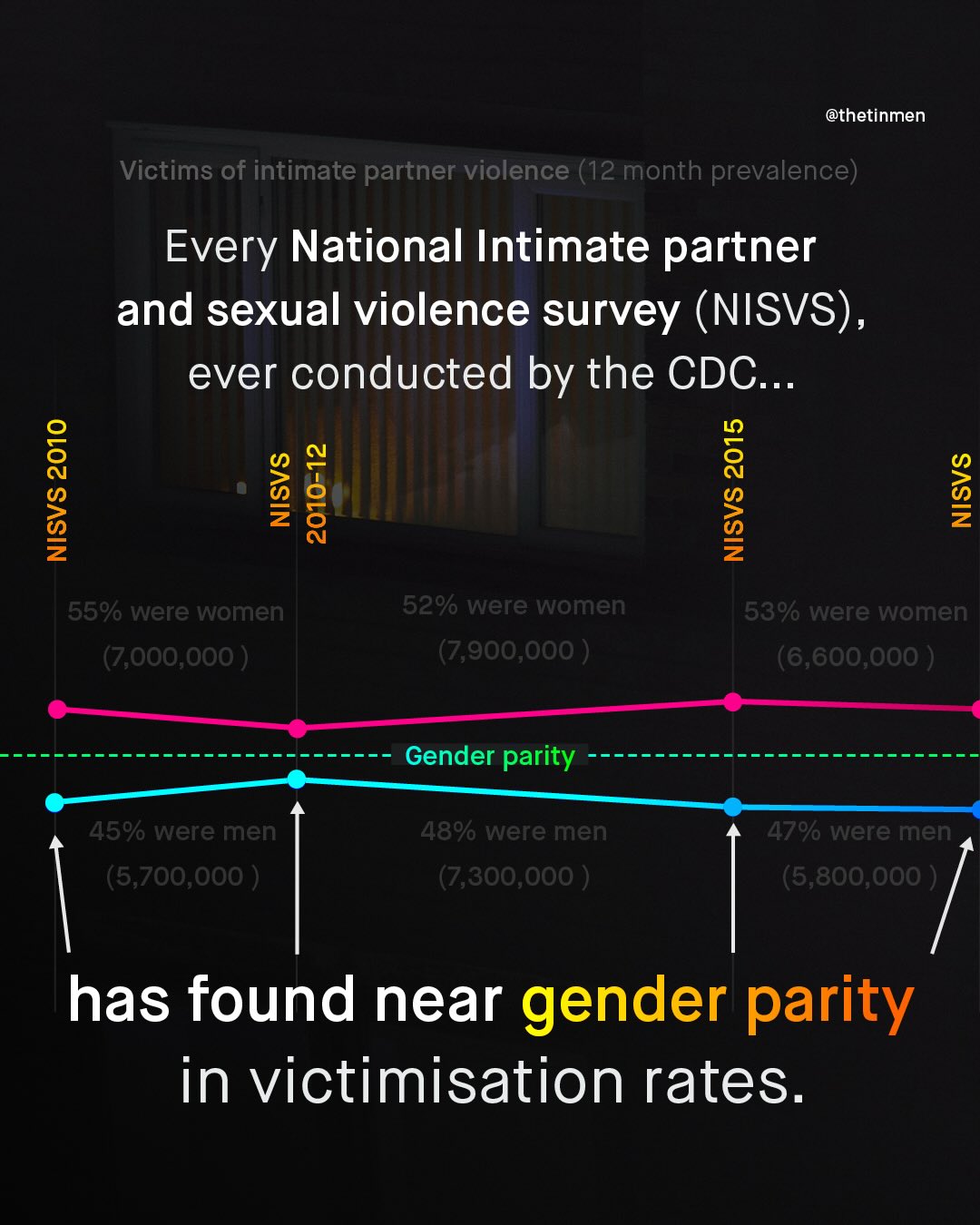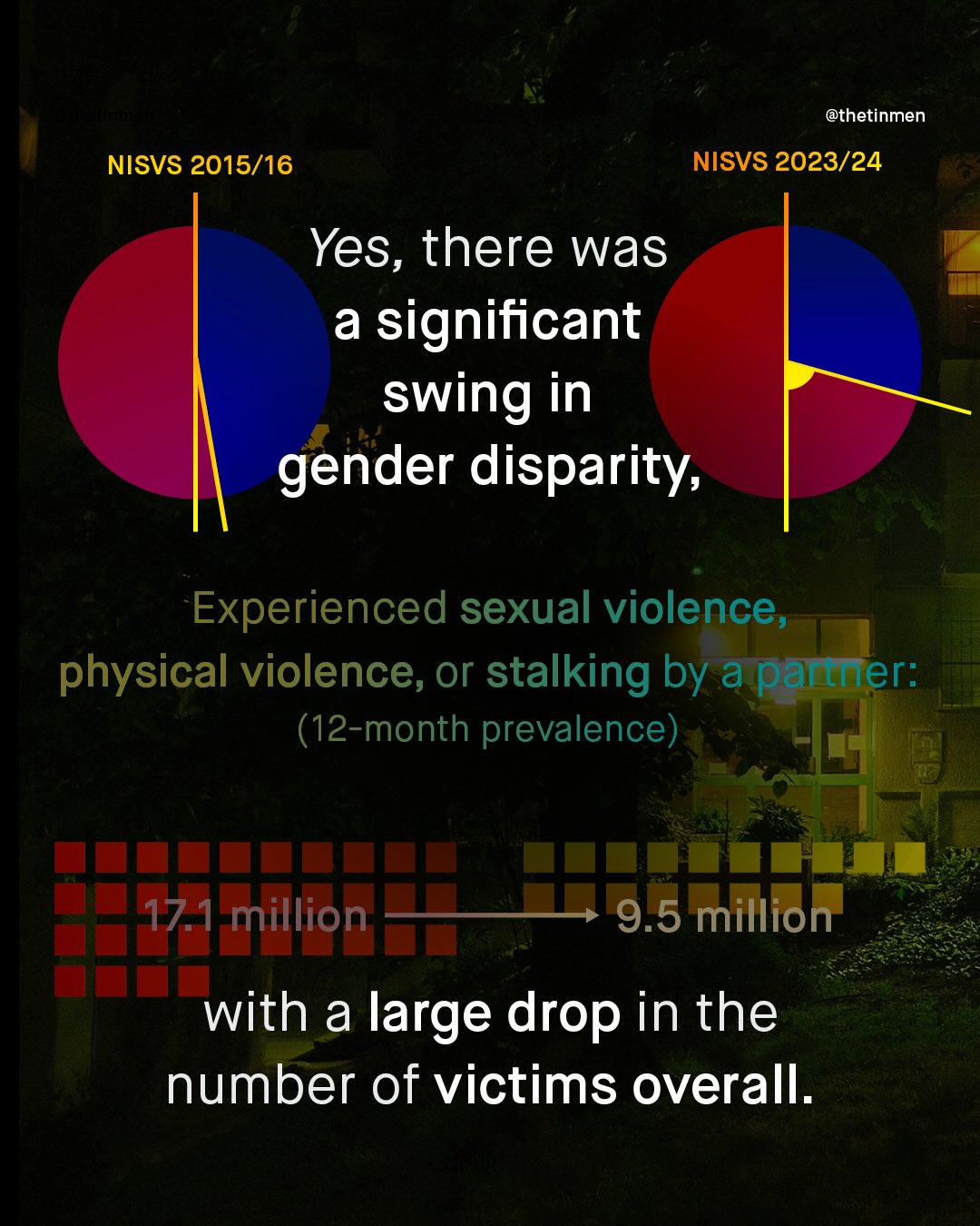 Every few years, the CDC releases their National Intimate Partner and Sexual Violence Survey (NISVS); which is arguably America’s largest, and highest quality survey on intimate partner violence. In the previous release, from 2015/16, and in every NISVS published prior (2010, 2010-12, and 2015), the data revealed near gender parity in victimisation of intimate partner violence; a shocking, and deeply unpopular finding, that you will have seen on TheTinMen. But in the new survey, released just a few weeks ago, things have changed; with the cumulative victims of those who experienced sexual violence, physical violence, and/or stalking by an intimate partner, shifting from near 50:50, to become 70:30, with women as the majority. How this breaks down into physical violence, coercive control, and psychological aggression, is closer to parity, at roughly 60:40, but still, the shift in the latest survey is clear, and worth discussing. The CDC have noted they have changed the survey questions, emphasising coercive control, and psychological aggression, as well as changing to an online, rather than phone-based survey as previously used. Furthermore, we all know that since the last survey (in 2015/16) a huge societal shift has happened, with #MeToo making violence against women a national conversation in 2017, which certainly will have encouraged more women to disclose their abuse too. Whatever the reason, what is most important, is that even though this new data shows men as ‘just’ 30% of IPV victims overall, this still represents millions of American men, who should not be waved away as insignificant. So what do you think of the stats? How can you explain this rather dramatic shift? And how do we support all victims, no matter the gender, and no matter how few? What do you think? ~ NISVS 23/24 https://tinyurl.com/9zxy3y8w