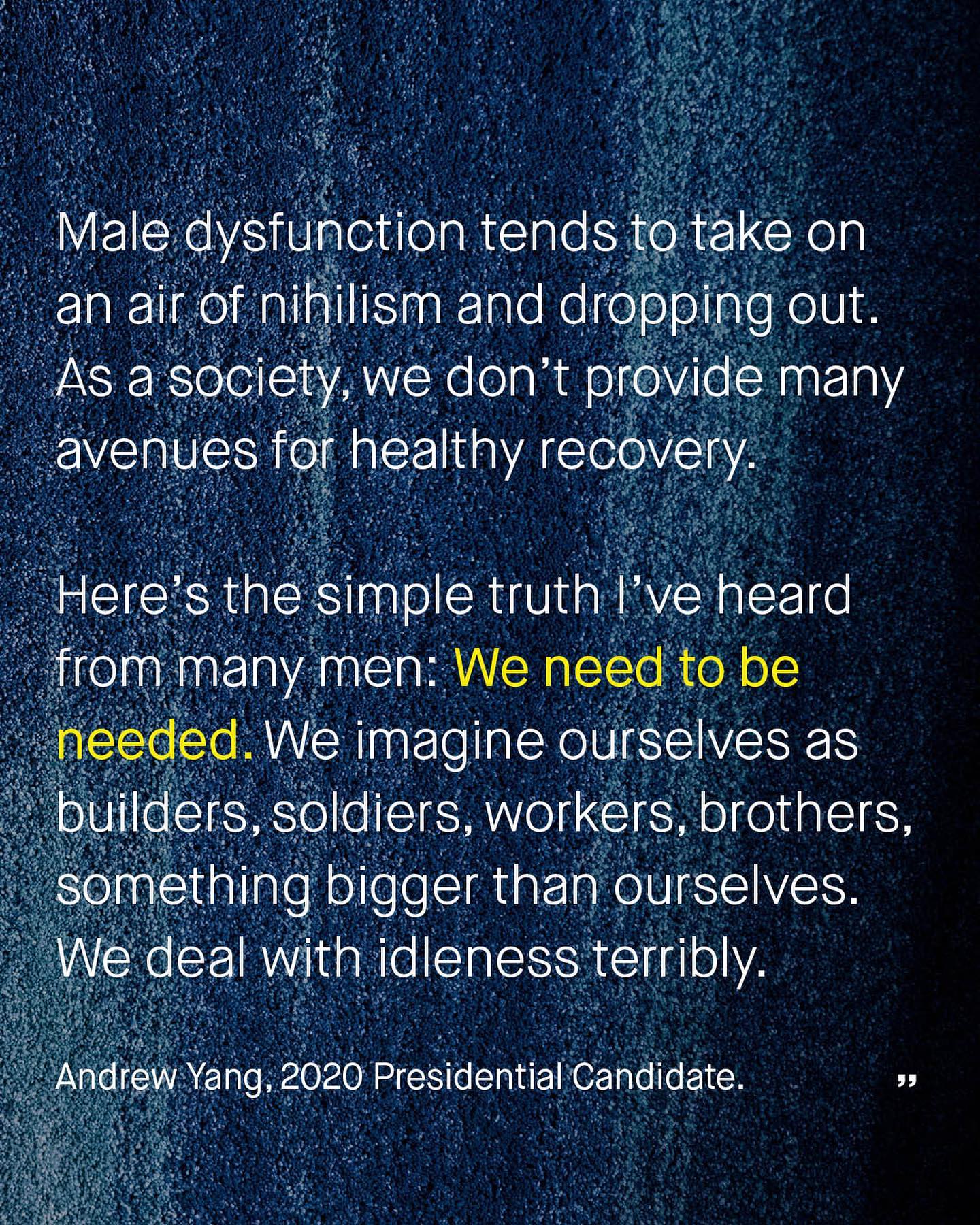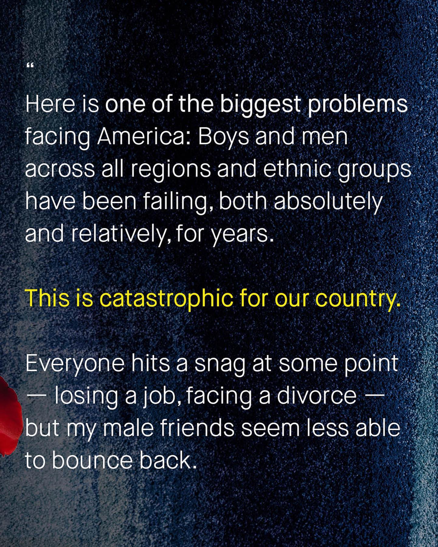 We’re repeatedly told our society is one built by men, for men, and to their own advantage. To live as a man is to live on ‘easy mode’ - an astute observation based on nothingness. Because the tax funded committees, initiatives, political strategies and Governmental departments – that are all there to support women – do not exist for men. Not one. Despite men living shorter and sicker lives, there is no ‘Office on Mens Health’. Regardless of men making up more than 90% of workplace deaths, the is no ‘Men’s Bureau’ within the Department for Labor. Right now – automation is causing an epidemic of male unemployment across America, but the programme for ‘Work and Opportunities for Men’ is not a thing, like it is for women. And even though men are the primary victim of violent crimes, the Office on Violence against Men, exists only in your imagination. No. Joe Biden did not announce the ‘Biden Agenda for Men’, neither did Obama, nor does the UK Government have any public strategy for ‘Tackling Violence Against Men & Boys’. It’s a strange ‘patriarchy’ we live in, considering there are no politicians who openly advocate for our men and boys, and not one gendered law to help them. And so the obscene theory of patriarchy falls flat on its face like a clown slipping on a banana skin – but the world is too afraid to laugh. But then comes @andrewyang A former presidential candidate and founder of the Forward Party, who finally IS talking about men and boys, a refreshing and reassuring voice that we all desperately need. Finally a voice to talk about men’s lacking education, employment, wellbeing and the deaths of despair that are paid as a consequence… And this is what he’s got to say: ~ Read the full WaPo article here https://tinyurl.com/2p8uvkt2 End of Men, the Atlantic https://tinyurl.com/2p8fcnrx Images by Sam Burriss, Harry Cao, Jason Leung, Nathan Dumlao. Tyrel James and Zhengtao Tang from Unsplash #ttmmenshealth