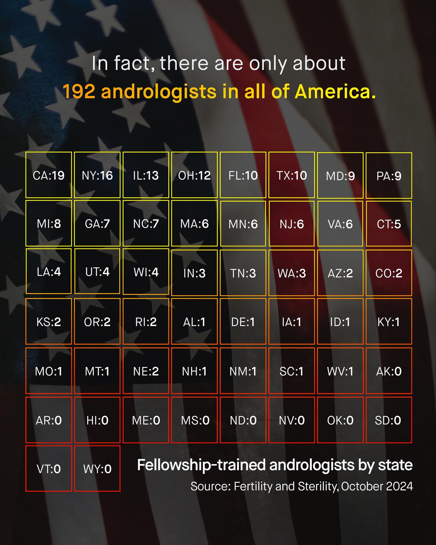 So often on social media, you will hear advocacy for increasing funding, research, and general awareness around women’s reproductive health. You will hear talk of endometriosis, and PCOS, of gynaecology being underfunded or misunderstood, or women being poked and prodded by unqualified and undertrained, patriarchs of medicine, or something-or-other to do with male bodies being ‘the default’. Most of this advocacy for women’s reproductive health is noble, important, and something we should get behind. But my support falls at the wayside when these voices enviously compare women’s reproductive health to that of men’s, as if the latter, the privileged gender, have it great, at the expense of women. And so, much needed and important advocacy for women, becomes the same stick is it so often becomes, to hit men with, smearing discourse with propaganda and lies. Because – as bad as women’s reproductive health is, it is incomparably better than mens. Men, who despite making up 50% of infertility issues, have only 1% of reproductive specialists dedicated to them. The very word that describes this field of study, that of male reproduction; is itself seen as a typo, an unknown word to so many, and that includes those who insist such a thing is “centred”. Because we’ve all heard of ‘gynaecology’, but what about ’andrology’? Andrology - the study of the male reproductive system. Well, let’s take a look – #menshealth #sexualhealth #malehealth ~ Andrologists by state https://tinyurl.com/2nnr4wp9 [1] [2]