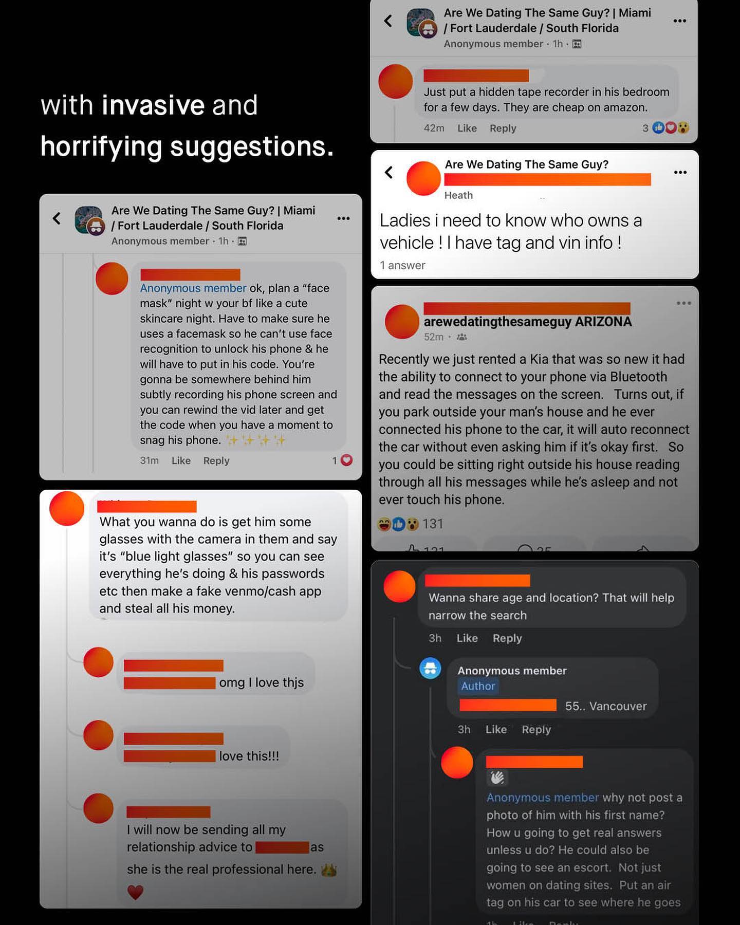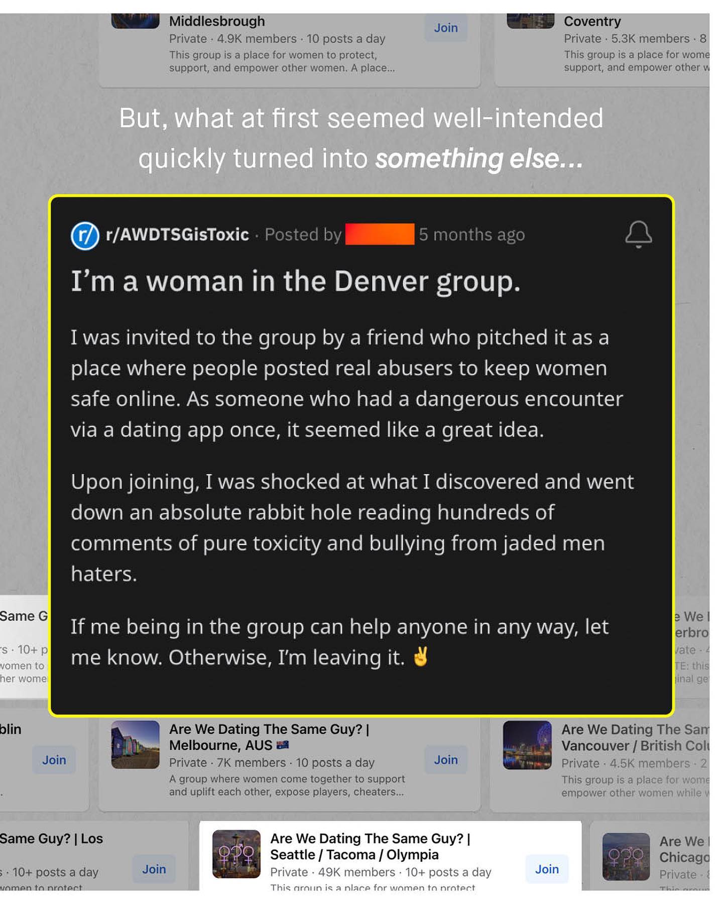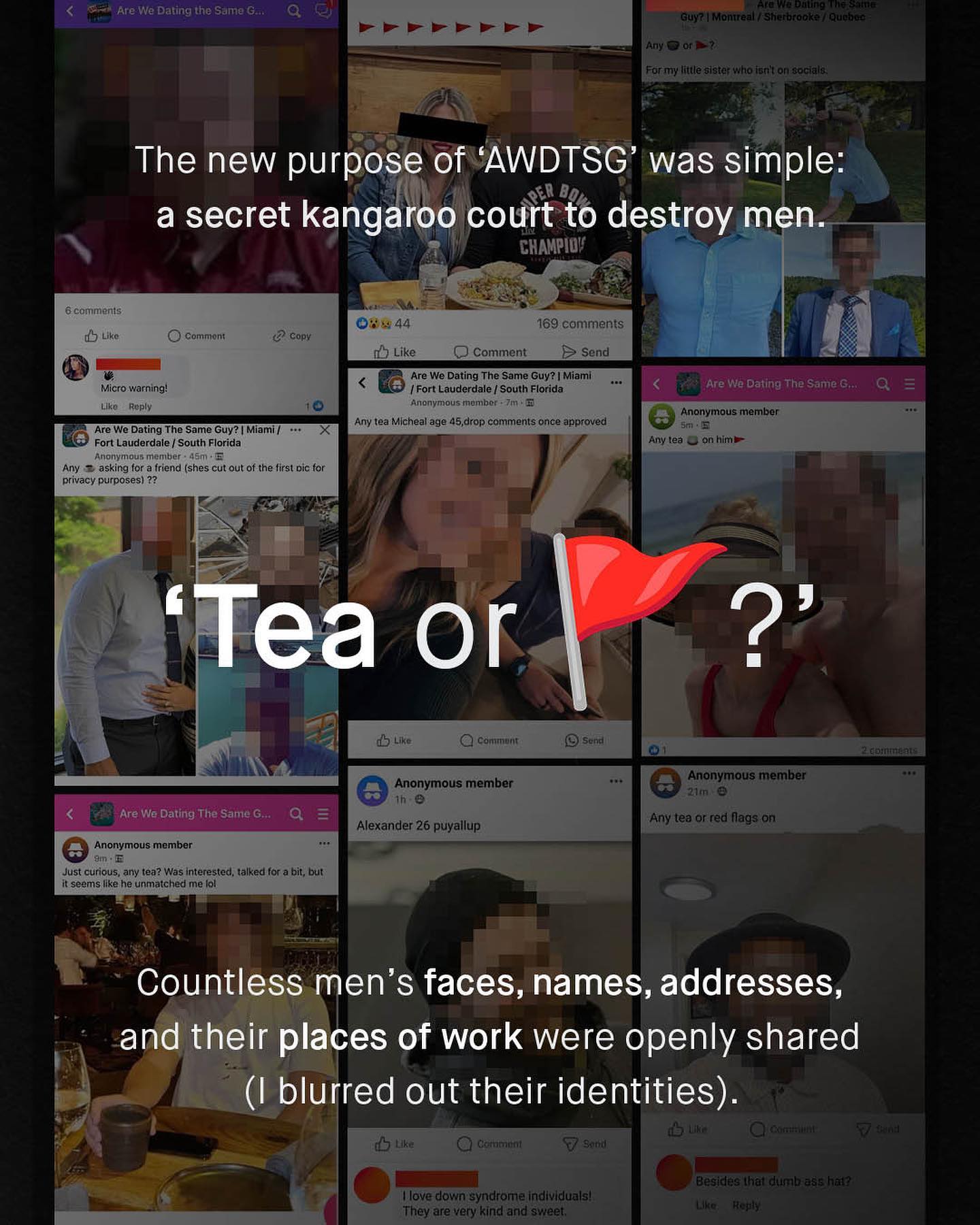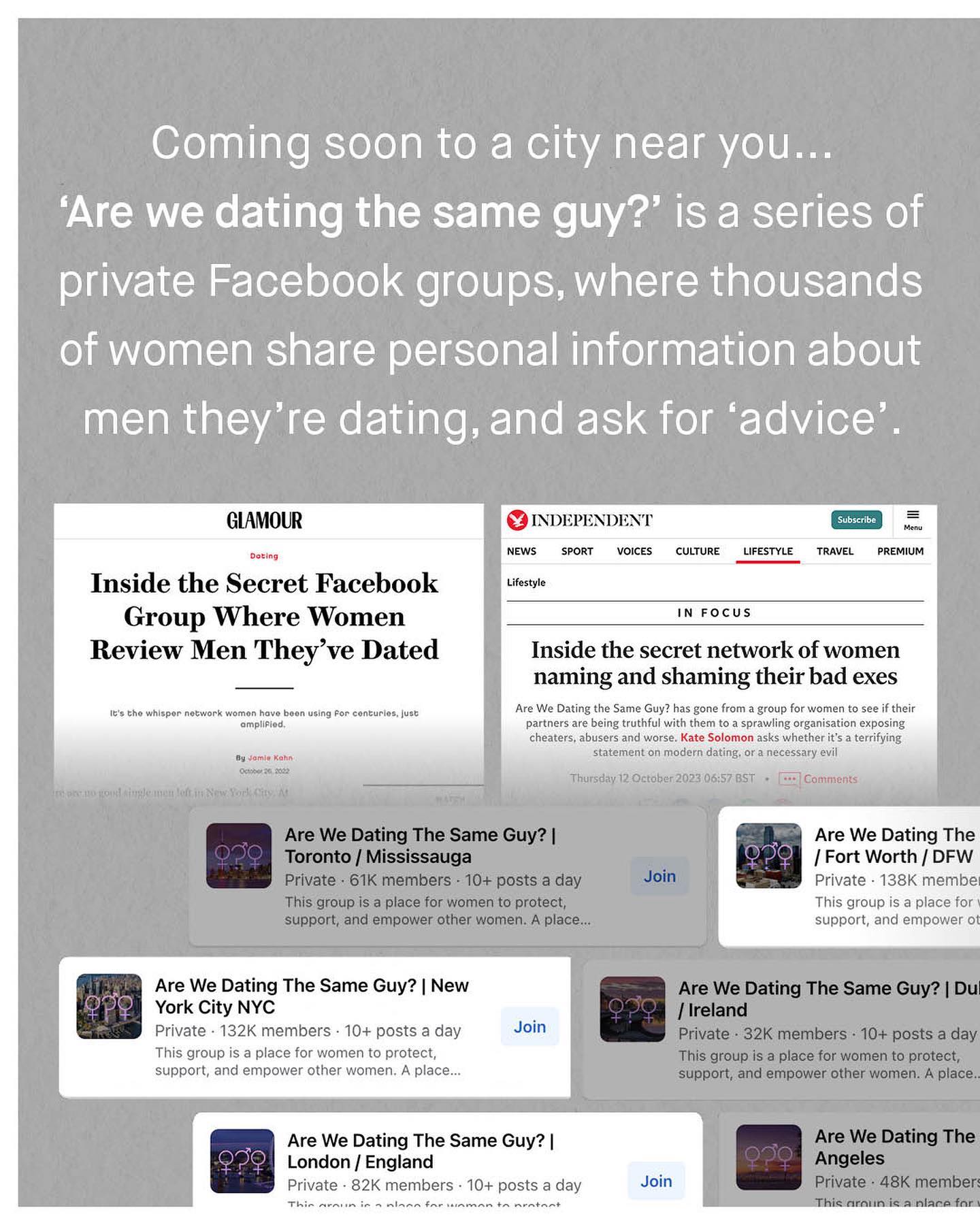 A toxic series of secretive Facebook groups, containing thousands of bitter women, has arrived. The shady campaign that seemingly started with good intentions, to protect women, has since became a hotbed of finger-licking revenge, faux compassion, and machiavellianism. It’s called, ‘Are we dating the same guy?’ It’s the name given to the countless groups popping up in many of the world’s major cities, each boasting tens, or even hundreds of thousands of members. If you’re able to sneak into one, you’ll likely find a grim primordial soup of resentment and anger; as vengeful single women share the names, photos, and even home addresses of men who have wronged them on the dating market. A place where insecure and power-hungry narcissists compare notes on how to deceive, stalk and surveil men; and flagellate themselves with sad stories of rejection, and inadequacy. Have you ghosted a woman? Were you selfish in bed? Did you make an inappropriate joke? Perhaps you did nothing wrong at all? It doesn’t matter. It won’t protect you from being strung up and pulled apart within the kangaroo courts, and pity parties of AWDTSG; whose secret members act as judge, jury and executioner to tens of thousands of men. The lives of such men have already been torn down, destroyed, and even lost, in the name of so-called ‘women’s safety’. But some of these women have fought back; leaking the hidden conversations, and blowing the whistle on the whispering campaigns, and terrifying trials within. So where do we go from here? Is AWDTSG really about protecting women, or is it about hurting men? What do you think? ~ Images by Becca Tapart, and Shubham Dhage. #datingadvice #onlineabuse