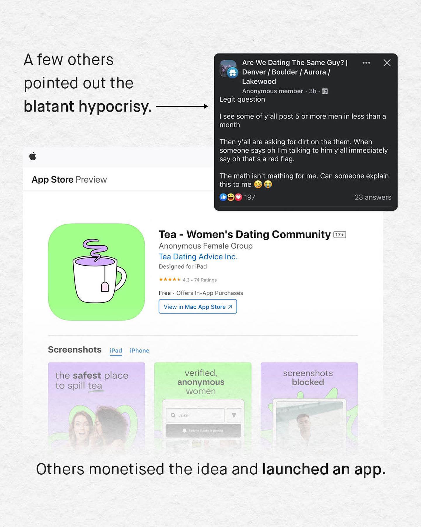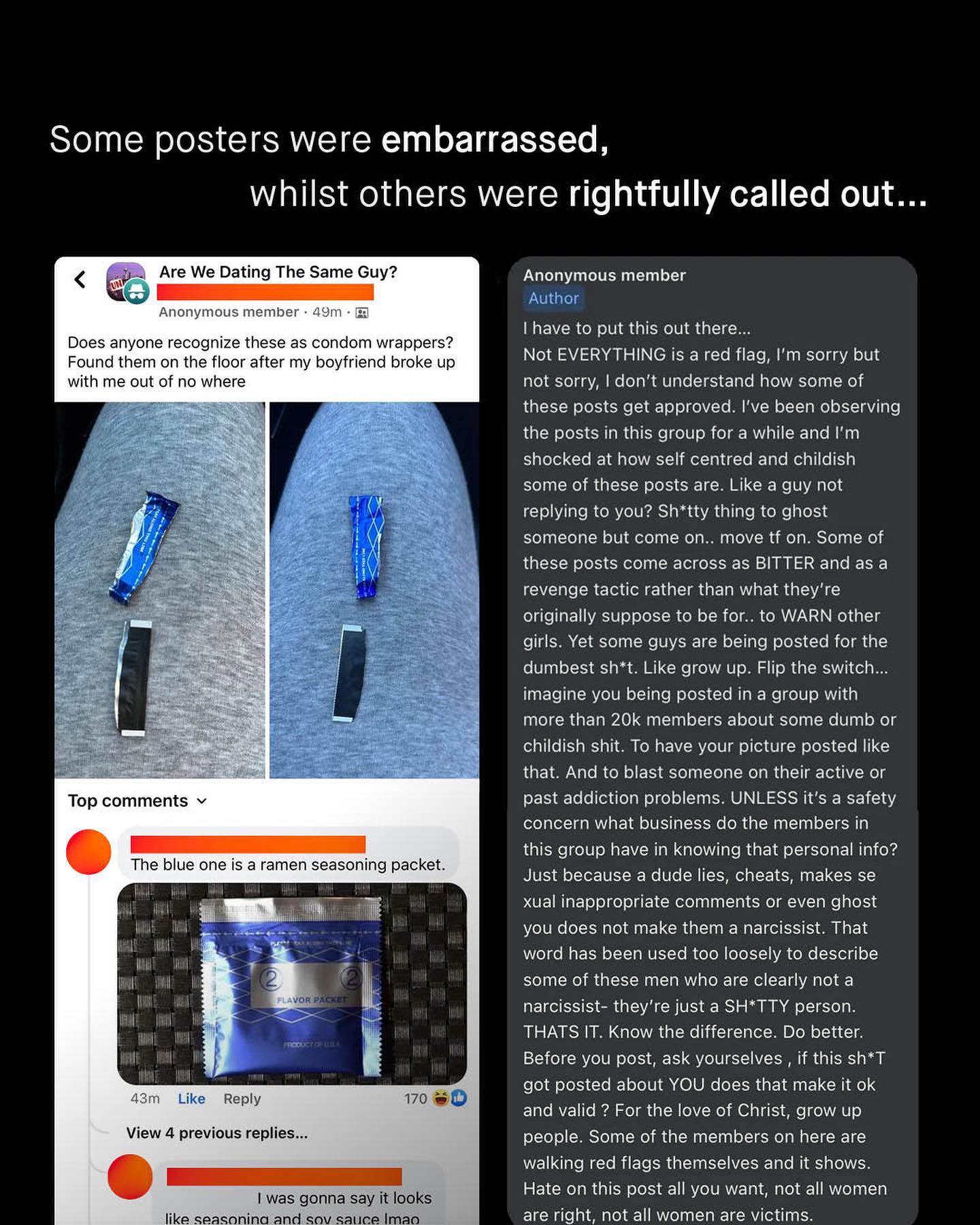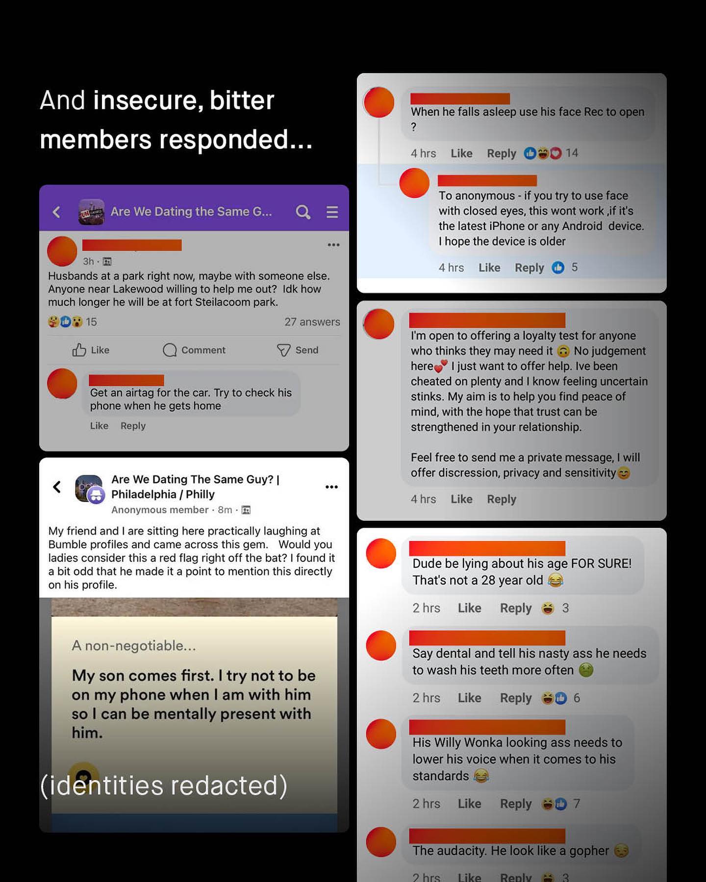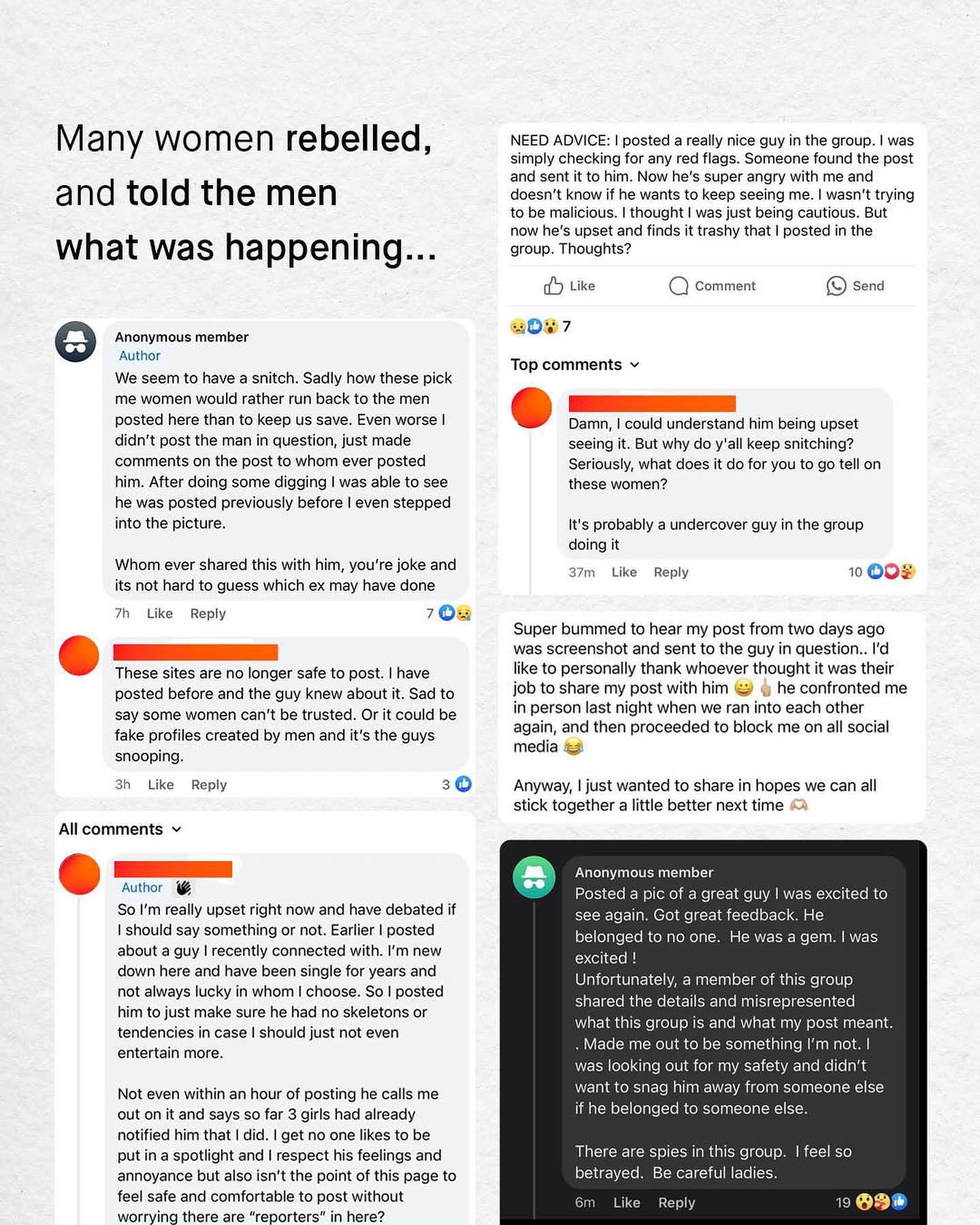 A toxic series of secretive Facebook groups, containing thousands of bitter women, has arrived. The shady campaign that seemingly started with good intentions, to protect women, has since became a hotbed of finger-licking revenge, faux compassion, and machiavellianism. It’s called, ‘Are we dating the same guy?’ It’s the name given to the countless groups popping up in many of the world’s major cities, each boasting tens, or even hundreds of thousands of members. If you’re able to sneak into one, you’ll likely find a grim primordial soup of resentment and anger; as vengeful single women share the names, photos, and even home addresses of men who have wronged them on the dating market. A place where insecure and power-hungry narcissists compare notes on how to deceive, stalk and surveil men; and flagellate themselves with sad stories of rejection, and inadequacy. Have you ghosted a woman? Were you selfish in bed? Did you make an inappropriate joke? Perhaps you did nothing wrong at all? It doesn’t matter. It won’t protect you from being strung up and pulled apart within the kangaroo courts, and pity parties of AWDTSG; whose secret members act as judge, jury and executioner to tens of thousands of men. The lives of such men have already been torn down, destroyed, and even lost, in the name of so-called ‘women’s safety’. But some of these women have fought back; leaking the hidden conversations, and blowing the whistle on the whispering campaigns, and terrifying trials within. So where do we go from here? Is AWDTSG really about protecting women, or is it about hurting men? What do you think? ~ Images by Becca Tapart, and Shubham Dhage. #datingadvice #onlineabuse