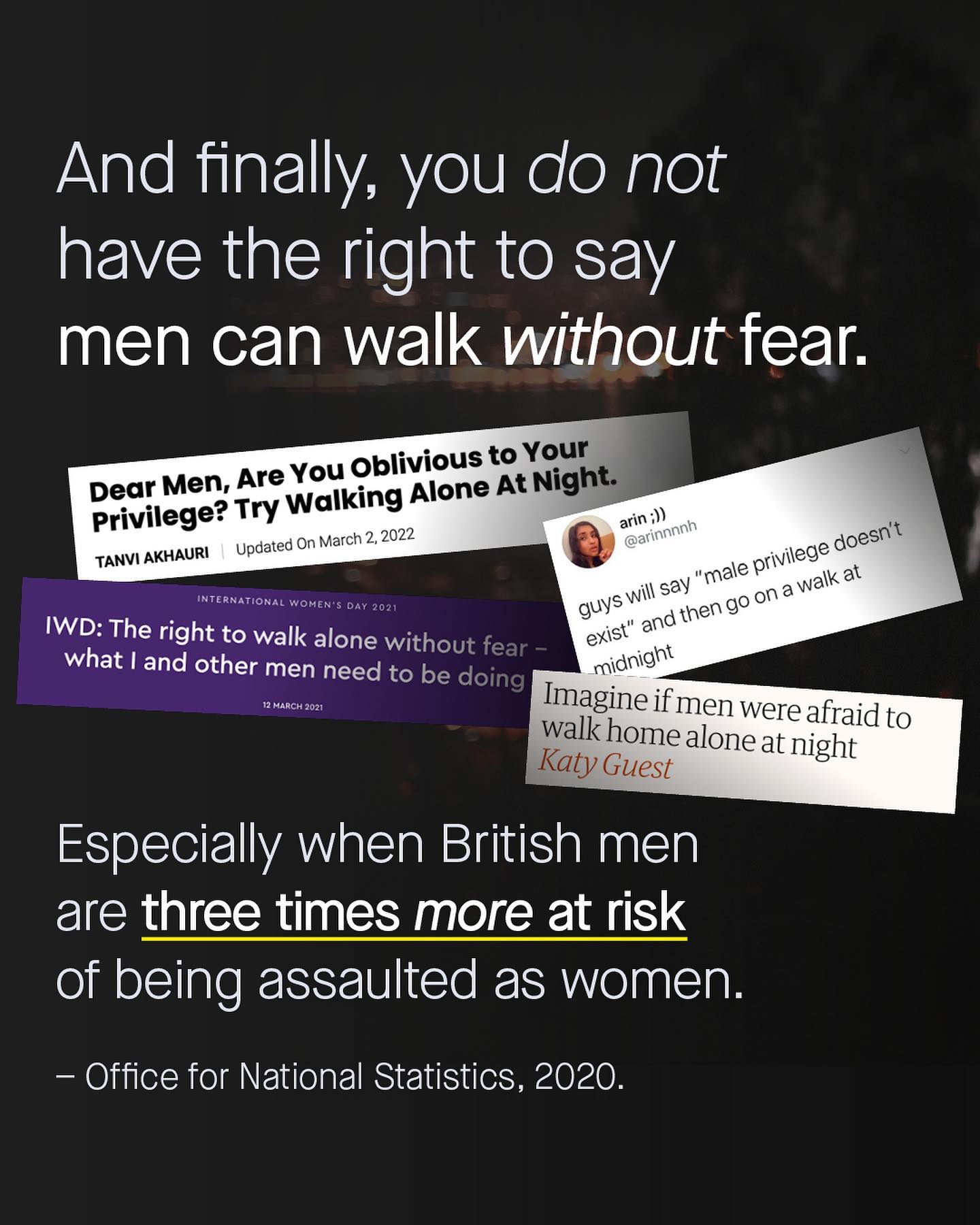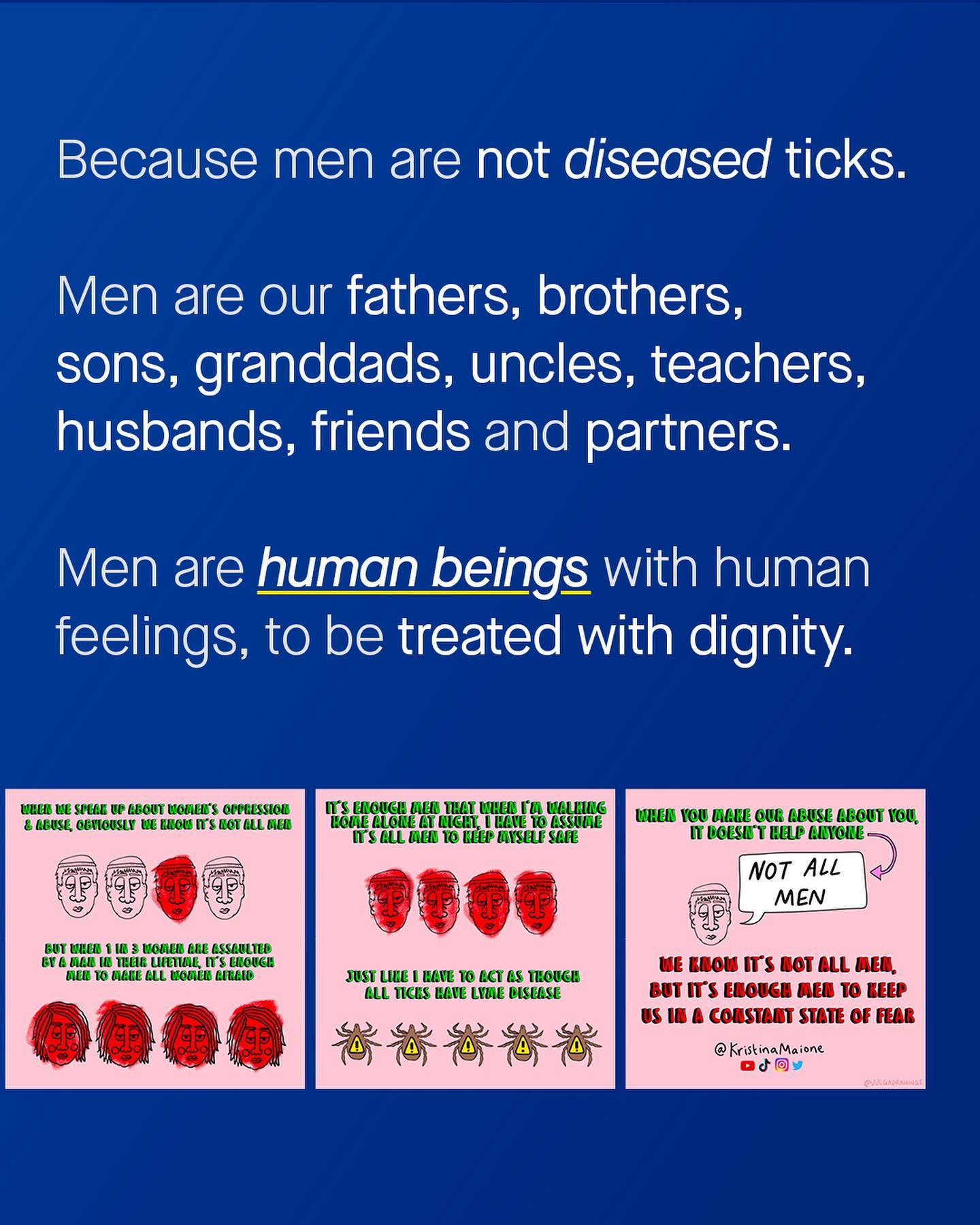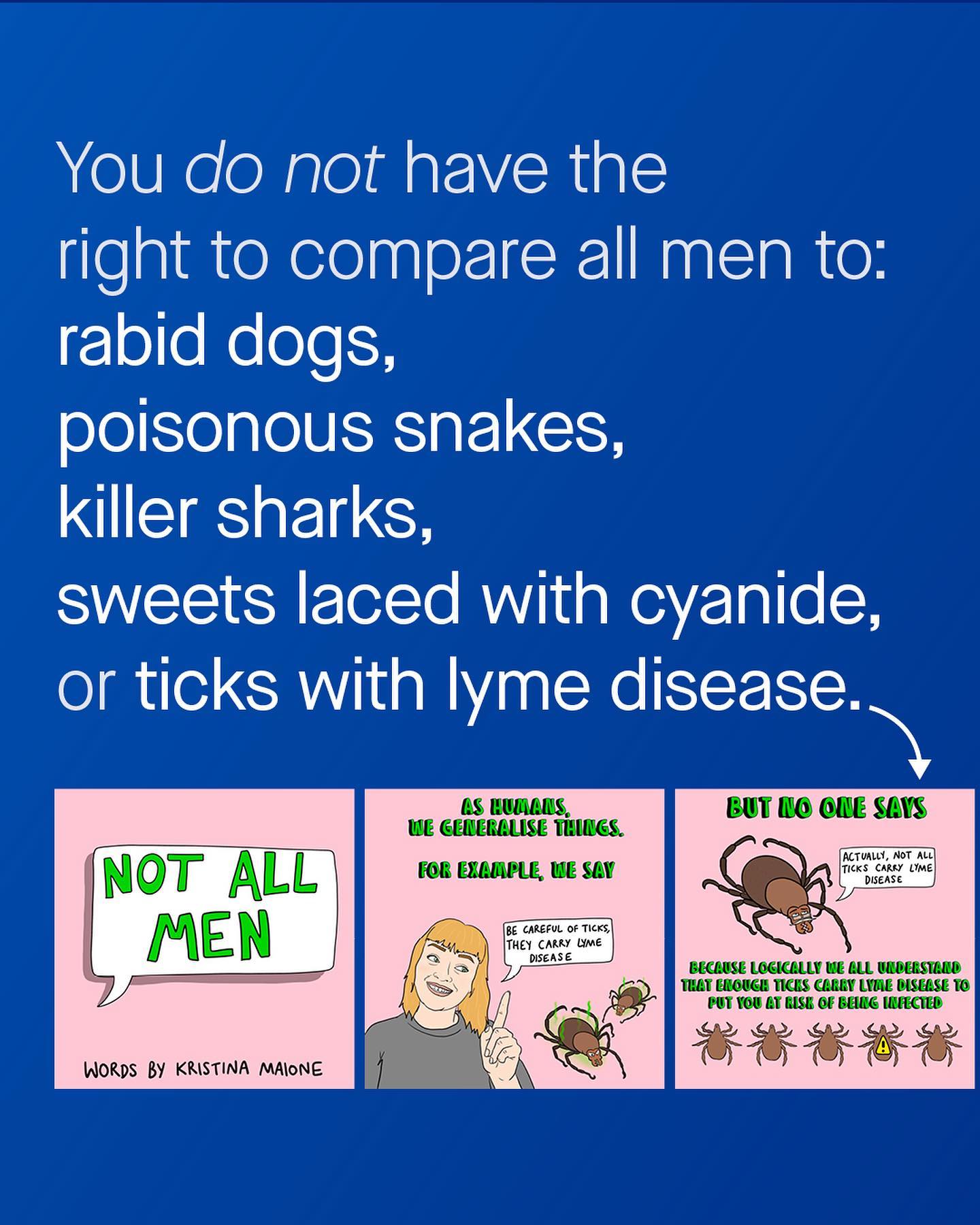The issue of personal safety is always a difficult one to manage. Of course, we all have the right to prioritise our comfort and wellbeing, crossing the street, avoiding unlit areas and staying in groups when possible, makes good sense, for all people. Because guess what, even as a guy, sometimes I get scared walking late too. It’s not these basic common sense actions that I have a problem with; but rather the incessant demands that men are, as a class, dangerous and to be treated as criminals by default. We’ve all seen the fear mongering metaphors that are reached for, ‘well you wouldn’t go swimming with sharks, even if most are safe?!’ And that’s true. Except men are not sharks, they are human beings with human hearts. And to treat a human being as a dangerous animal is cruel, unwarranted and dehumanising. Whatsmore, avoiding men is not the same as avoiding swimming with sharks. As swimming with sharks is not a day to day necessity of life – whereas men are. Men are our family and friends, our teachers, students and our children. To wall them off as vicious animals, is also to wall off some the best and kindest people you could ever know. Yes. To avoid danger, is also to avoid love. To avoid fear, is also to avoid kindness and friendship. Above all I ask people to simply be mindful of how their actions around men might make them feel, and how the dehumanising words that compare them to deadly animals, can impact their mental health too. There is a better, more measured and more responsible conversation to be had about personal safety, that doesn’t alienate or vilify, or leave people behind. Can we have it now? ~ Source: ONS, Violent Crime UK Images Vadim Bogulov, Fawazlul Rizqi, Donny Jiang, Carlos Tw, Arthur Chauvineau. Awesome Lyme disease tick artwork by – Kristina Malone