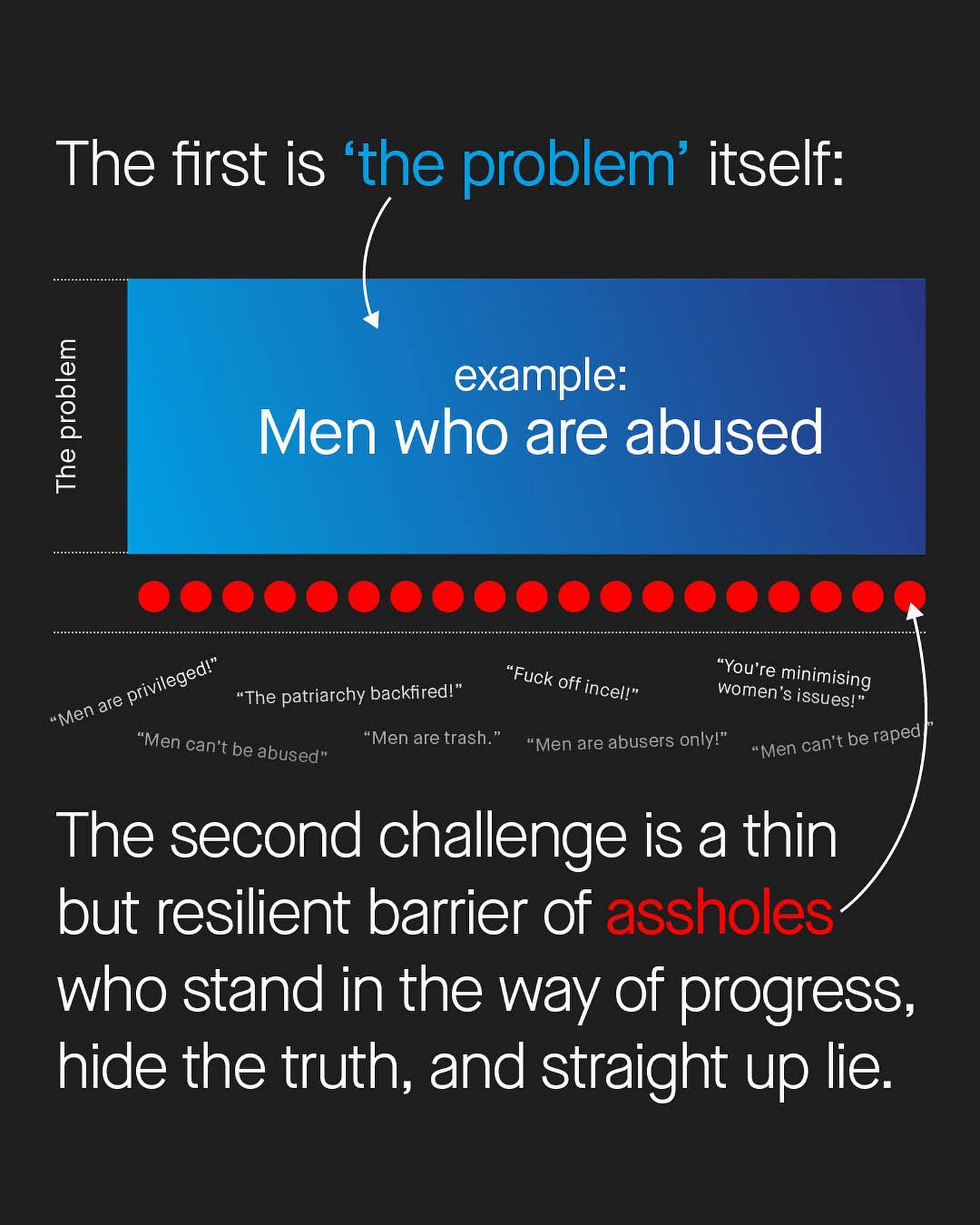 The challenge this page faces, is not just in discussing and finding solutions to the complex social issues that many men face, but also in overcoming the tiny and annoying army of assholes who stand in the way of useful conversation. They are the ones who call men “toxic”. Or who deny the true size and nature of male victimhood. The ones who make blanket assertions of privilege, of patriarchy, and who make unsubstantiated, baseless claims. Those who only know how to centre themselves, take away from discussion and who hijack debate, throwing around and diluting words like ‘misogyny’ for their own self interests. The assholes. I’ll be honest – I’ve gotten criticism for so liberally using this word, and for pointing the accusatory finger myself. And as much as I accept this is a fair criticism that I should consider more, it’s also important for us to understand, that to get to the useful discussions around men and to find the solutions we all want – we must first overcome the ogre at the door, who cries and screams and swings its bludgeon of bigotry at anyone who challenges it. We can agree that these people are writing their names in the history books, they are, but perhaps under a different chapter heading than they expect. So I wonder, how long will it take for them to realise that they are the solution to *nothing*, they are just a different kind of problem. And how do we defeat the ogre?