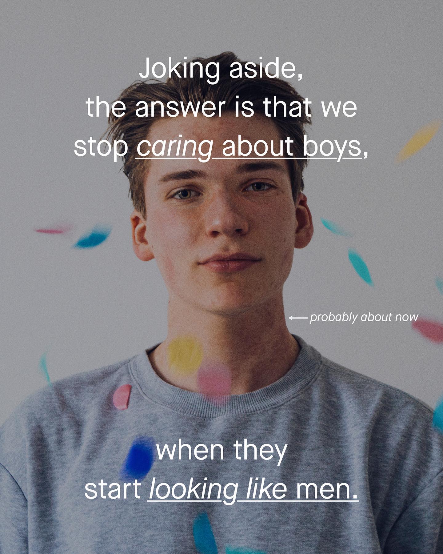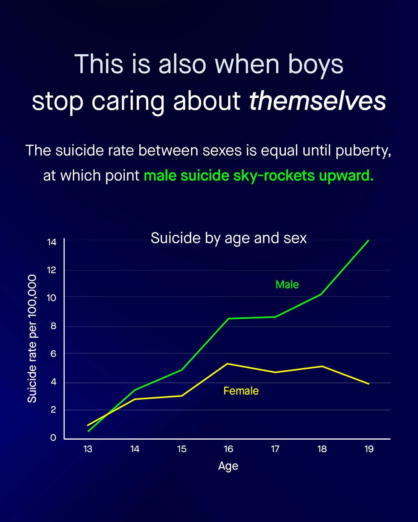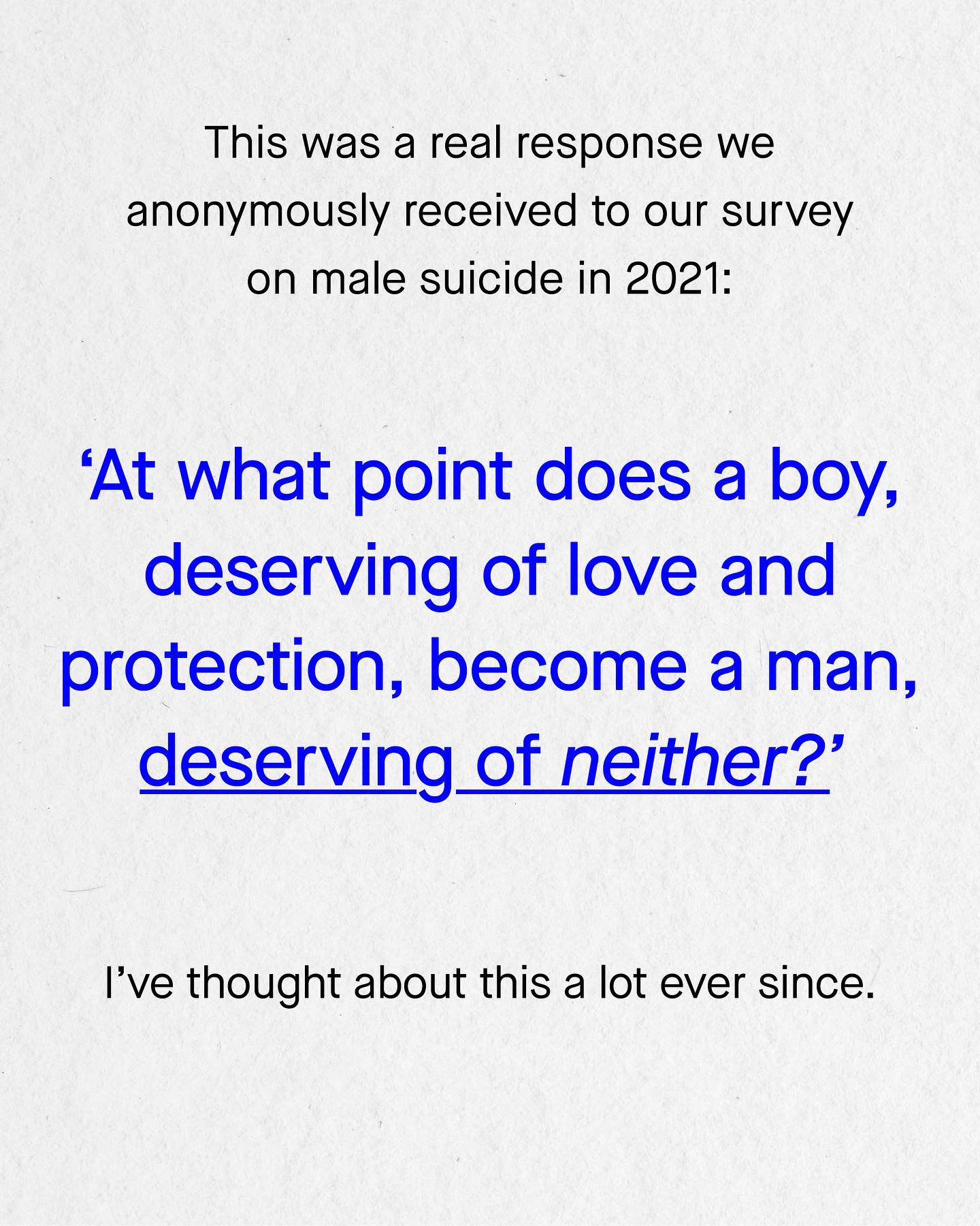 My mum can be the nostalgic type. I remember her once looking down at an old photo of me and saying, “aww you used to be so cute!” I paused for a moment, and asked “used to be? But I’m still cute right?” She muttered something along the lines of “of course, of course you are”, but she never looked up, and instead gazed lovingly at the crinkled photo in her hands. It was within such experiences that I realised I had since become a fully grown man, and at some point, lost much of the adoration and care from those around me, and from society at large. I had stopped being a cute boy with scruffy hair, dark eyes and a face spattered with freckles; and since become, what seemed to be, an oppressive, dangerous and privileged man, undeserving of sympathy and who was collectively responsible for all the world’s ills. I don’t quite know when that happened, but it clearly had. I realised as I walked the streets, nobody looked at me anymore. And if they did, the old glint in their eyes was now replaced with coldness, dislike, and fear. Nobody said anything to me, or certainly not anything nice, there was little kindness at all. Invisible. Disliked. Feared. All the positive attention I had squandered as a child, was now gone, and I don’t think I’m the only man who feels this way. So today, I don’t want to ask why this is, but rather when did it happen? For it was not always this way. So I ask you, when does a boy, deserving of love and care, become a man deserving of neither? What do you think? ~ Sources Suicide by age and sex [1] [2] [3] [4] [5] Images by Ben Collins, Kiwi Hug, Midas Kofska, Azph, Gradienta, Erik Lucatero from Unsplash. #mentalhealth #malesuicide #mensmentalhealth #mensmentalhealthawareness