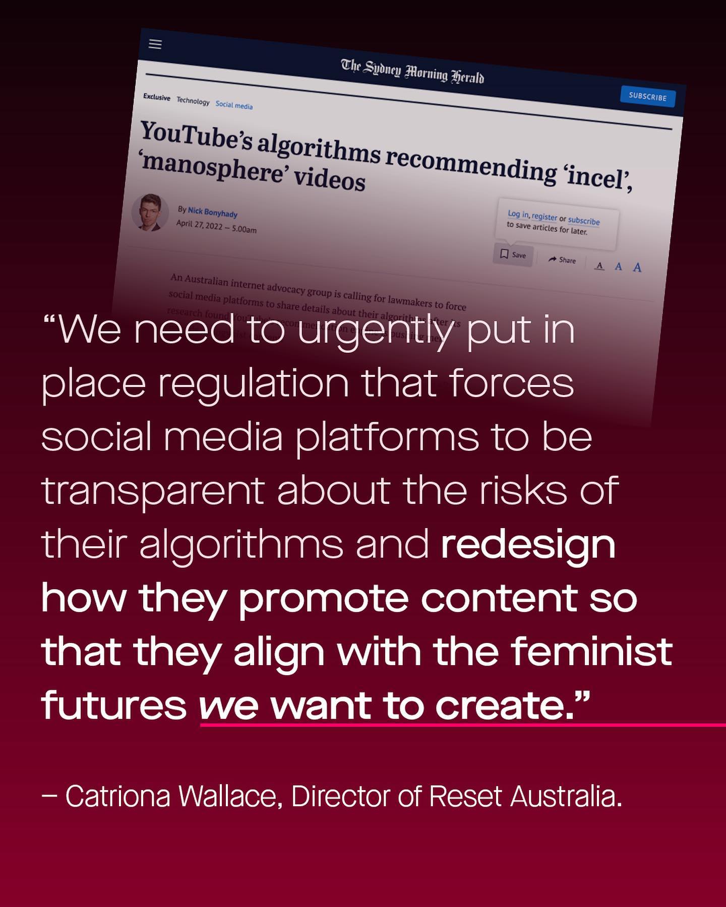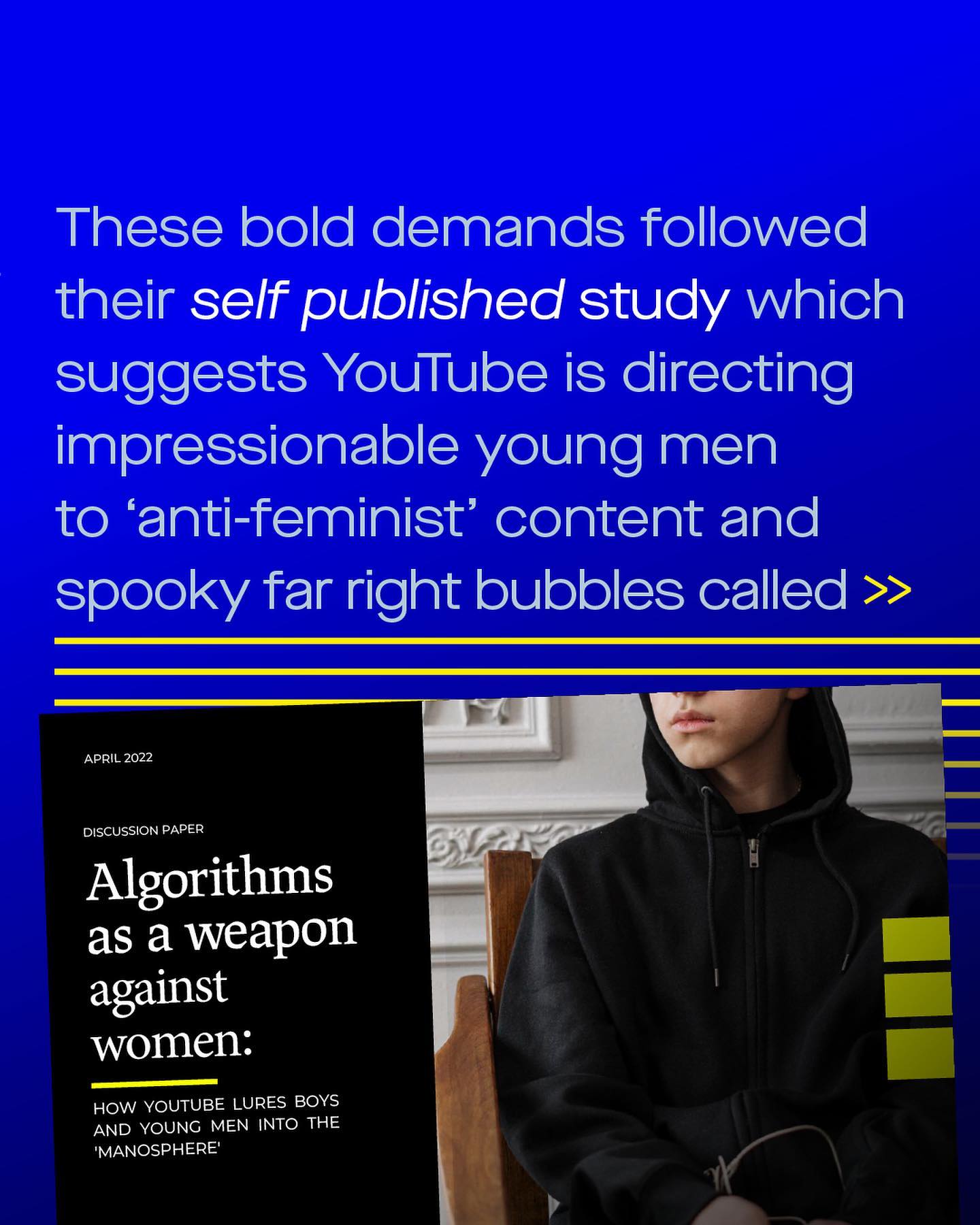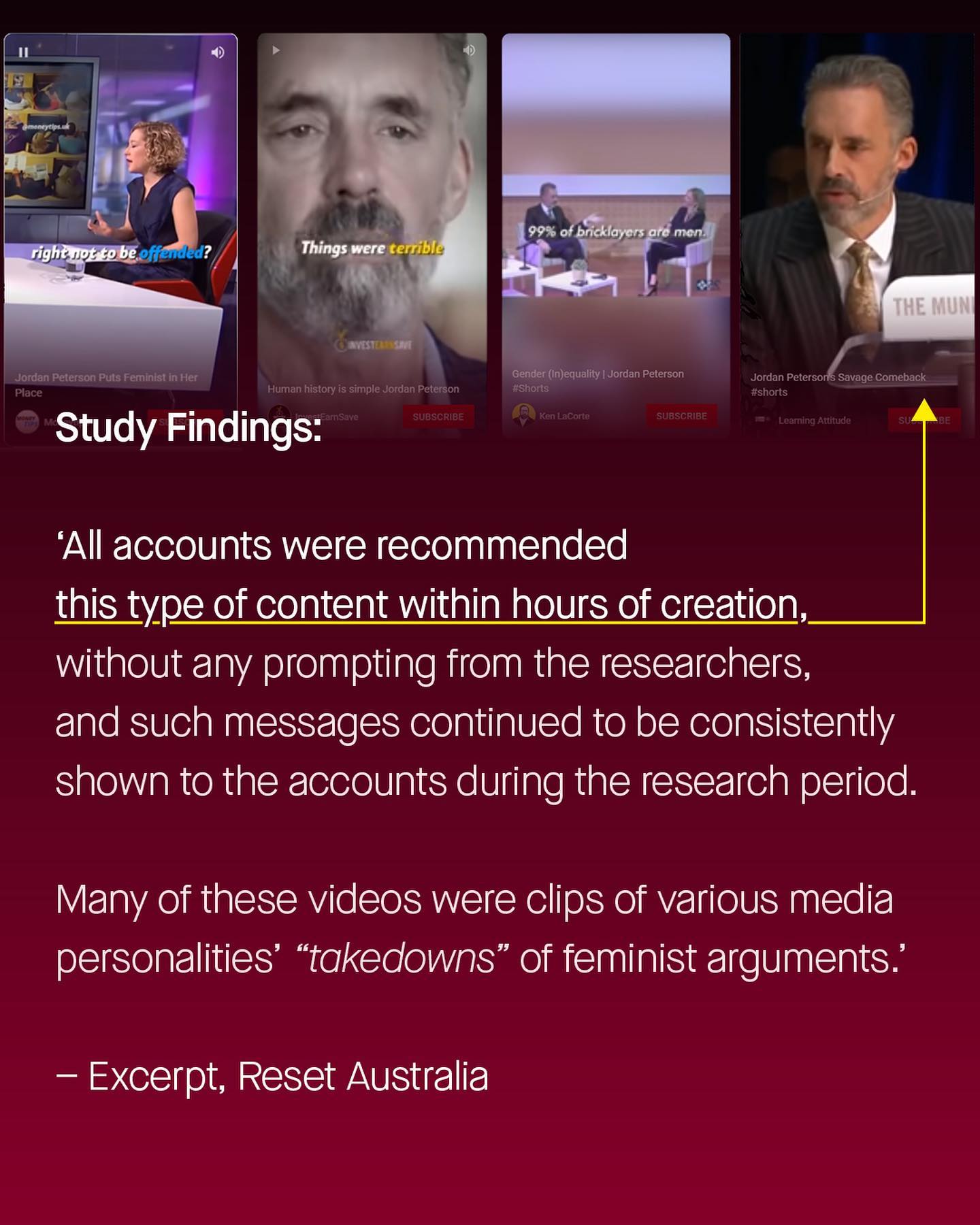 The internet can be a wonderful thing, closer than any other medium of achieving actual true democracy. Here, for better or worse, everyone has a voice. Here we can all stand on a soapbox, of our own design, and say what we think. And so, the internet cannot be easily tamed, controlled, tampered with, or turned off – but that doesn’t stop some people giving it a go anyway. @ausreset are the latest organisation to do try, bravely fighting against the ghoulish ‘manosophere’ that is allegedly corrupting the brains of our boys. Their latest study is titled: ‘Algorithms as a weapon against women: How YouTube lures boys and young men into the manosophere’. What an exciting and alluring title indeed…scary even. So what are these villainous videos? The ‘feminist take downs’ the lively debates, the facts, evidence and video essays, that go against the dogma and mainstream mindset. At its helm is the savage minotaur himself, Dr Jordan Peterson. Ahhhhhghghgh! So the truth spills outs, the voices speak up, and none of it, according to Reset Australia, is any good. Dangerous in fact. So dangerous they are advocating that social media platforms should be providing them with insight into their algorithms, so as to be audited and regulated, to present they content *they* deem appropriate. In their own words, to ‘redesign how they promote content, so that they align with the feminist futures *we* want to create’. Somehow they call this democracy. But democracy according to who? ~ Read their study here (or don’t, it’s shit). https://tinyurl.com/5cx3sb47 Sydney Morning Herald https://tinyurl.com/mvskpxkh Read their study here (or don’t, it’s shit). https://tinyurl.com/5cx3sb47 Images by Alexander Andrews and Martin Sanchez from Unsplash.