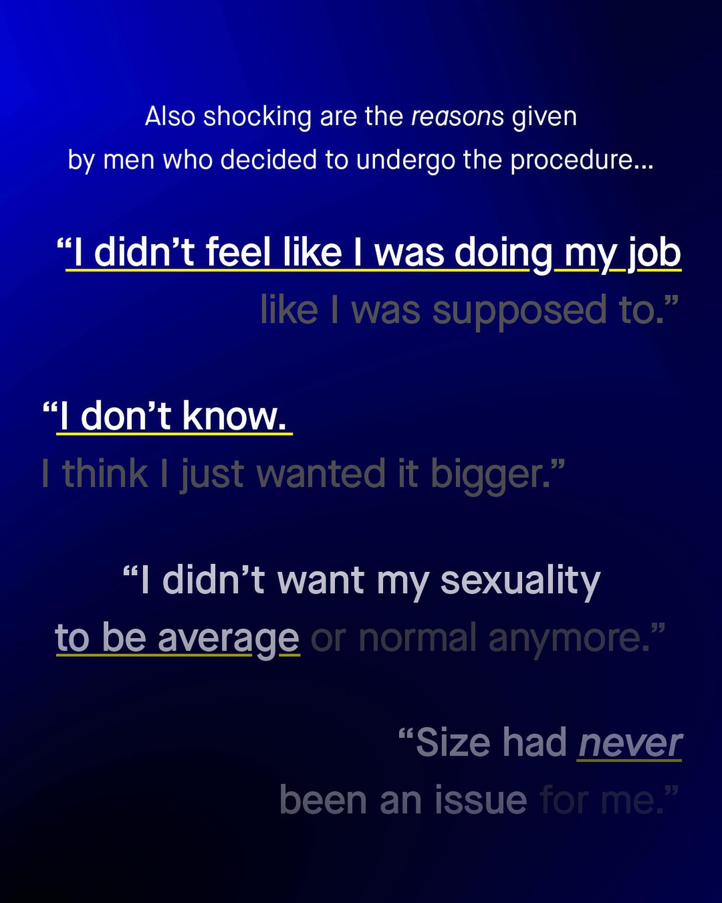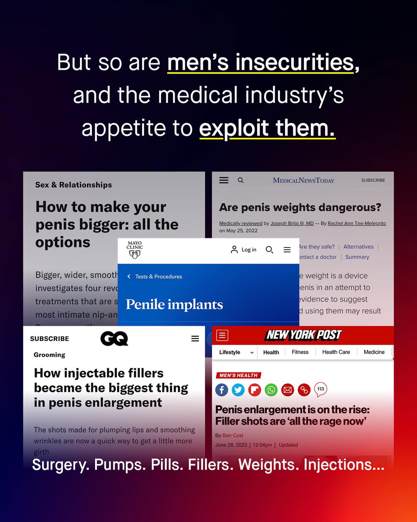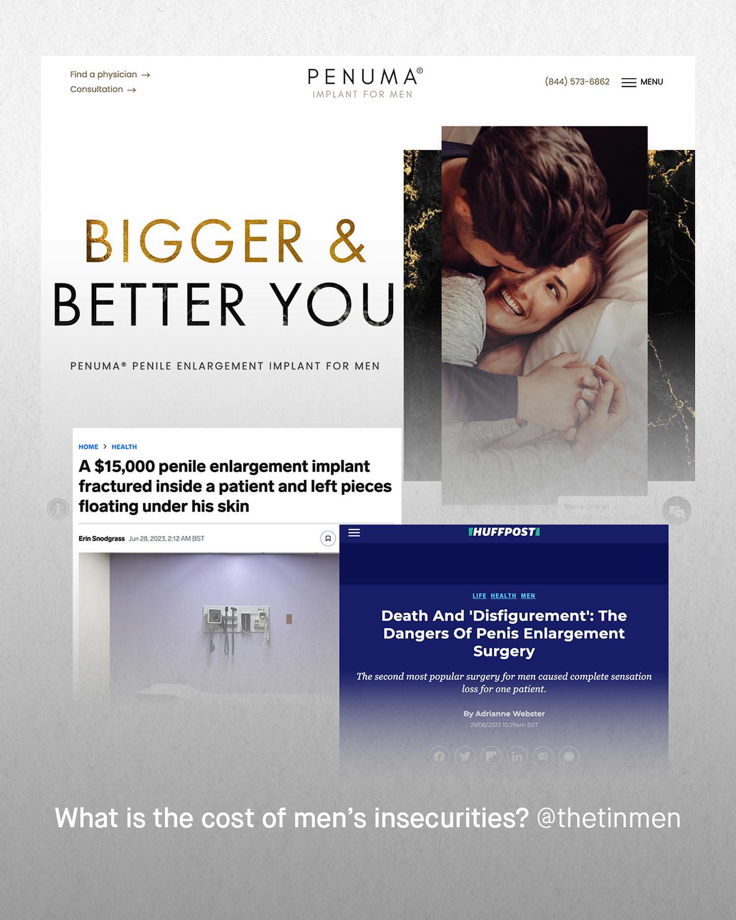 Whether it’s in porn, locker room talk, or the insults of an angry environmentalist, boys and men are told one thing, ‘bigger is better’. Yes. The toxic culture that told women and girls that smaller and thinner is better, sings a different song to its men and boys… We are told bigger means better sex. It means happier relationships; more money, faster cars, and better ‘energy’. It is praised by Greta Thunberg and your average red-pill-bro alike: bigger is better. But it isn’t. Bigger only *seems* better, because of the type of culture we’re all wrapped up in. So it’s no surprise that to get bigger, men are willing to risk bigger; using vacuum pumps, hanging weights, snipping the suspensory ligaments, and using inflatable prosthetics. Pumps, pills, fillers, weights, injections, exercises… an industry of insecurity arrives, slinging dangerous and ineffective new fangled contraptions. But now a new option has arrived, from the so called ’Thomas Edison of penis surgery’… …a surgical device called the @realpenuma The claims are big too. But behind the same slick advertising are the same broken promises, followed by the same tragic tales of incredible pain, and suffering. A catalogue of horror stories, and another industry dedicated to fixing the mess. So what is happening to our men? How do we regulate this growing market, and most of all, how do we reassure our men and boys that bigger is not better? ~ Images by Charles Deluvio, Codioful, Black Kiwi Hug. [1] #bodypositive #mensmentalhealth #bodypositivity #bodydysmorphia