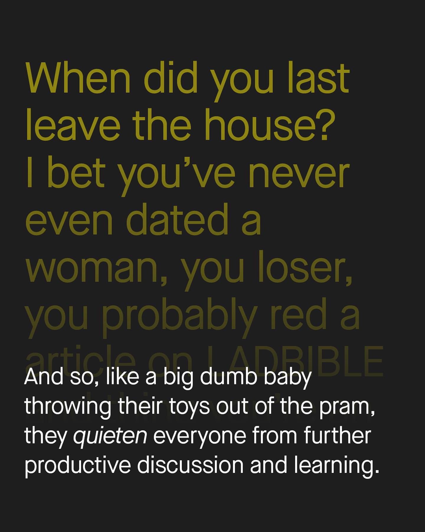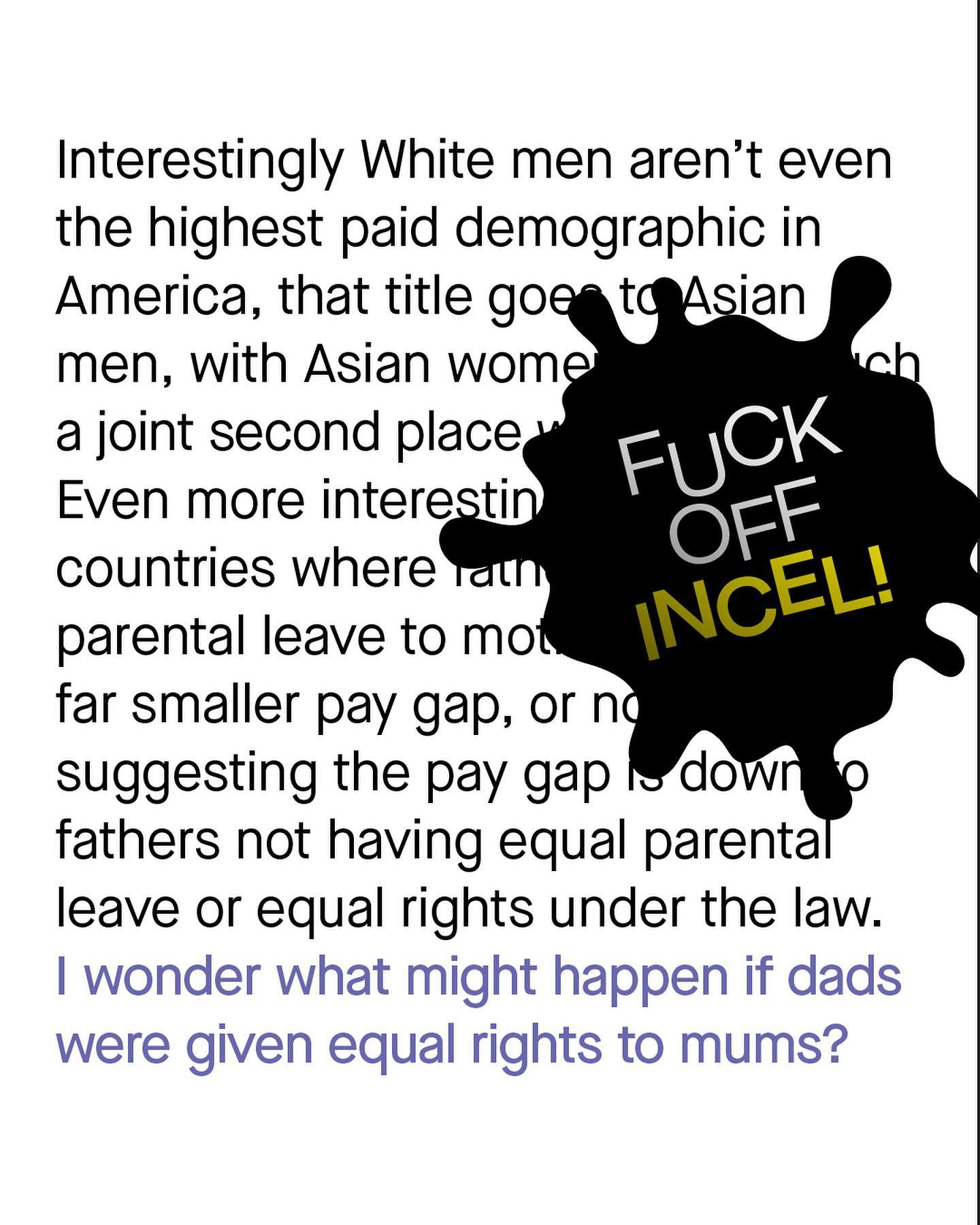 I shower every morning, brush my teeth twice a day, I don’t live in my parents basement, I have a cool job, and I’m not short on sexual or dating experience either. Yet, I’m called an INCEL or similar, pretty much every day. For what? Because some people have lost the ability to have productive, adult and data driven conversations, outside of narrow and outdated dogmatic views? Seriously, if your response to a well reasoned rebuke, is to tell that person to have a shower and brush their teeth - then you have a lot of work to do. And it’s all fun and games, call me what you like, I honestly don’t care; I like my teeth, I live in a beautiful home, and I smell *okay.* But it does make me wonder what happens to the world when people cannot engage in hard conversations, without such silliness? If a movement and its ideas are lifted above reproach, so it can rain down insults and stupidity on the rest of us, rather than contend with the difficult ideas at their feet, then what does that look like going forward? Are we creating a generation of intellectually coddled cry babies? And is it time for them to go to bed? ~ Paygap data 2021 Images by – nathan-dumlao from Unsplash Illustration by Yeong Rong Kim from the Noun Project #ttmbaby