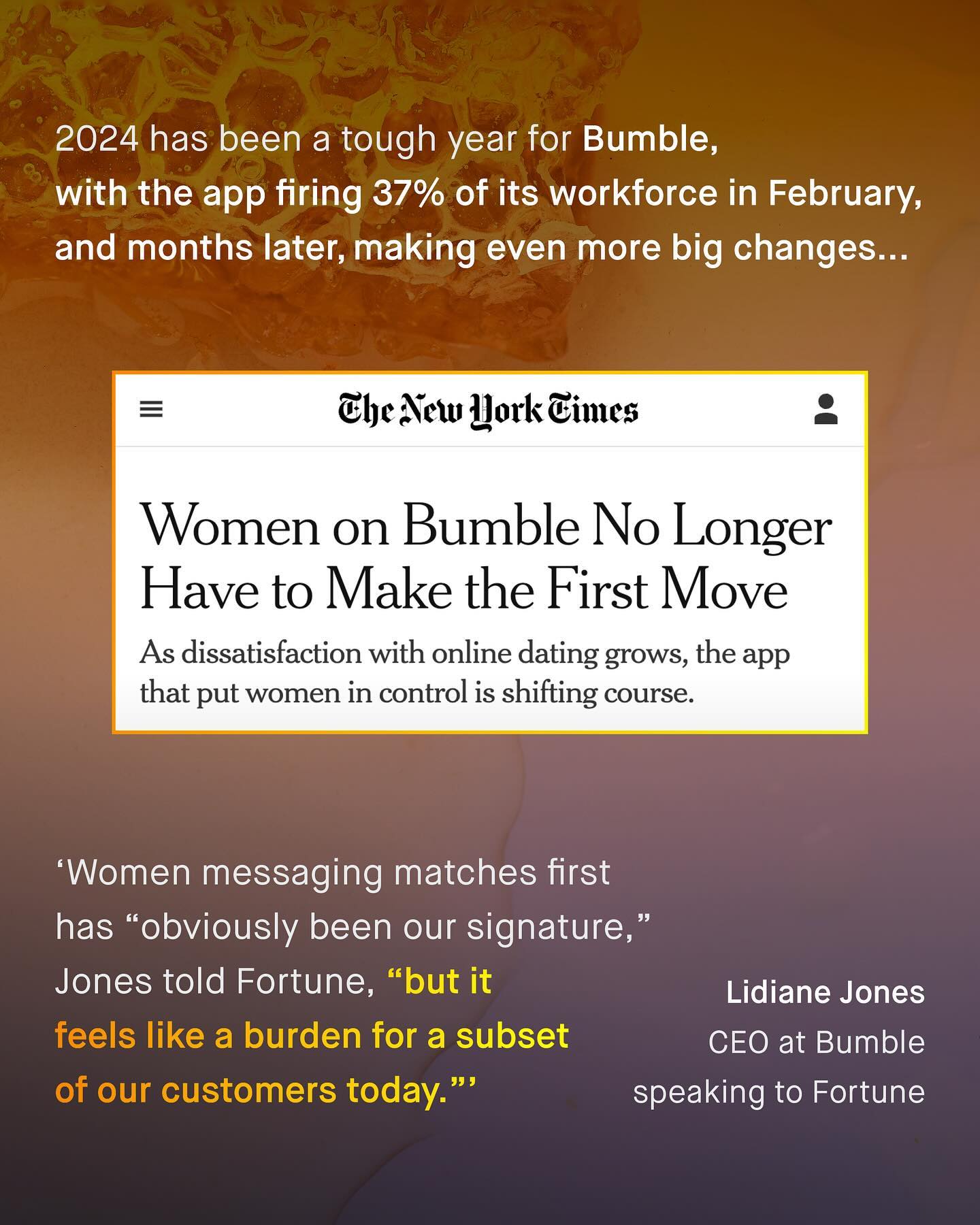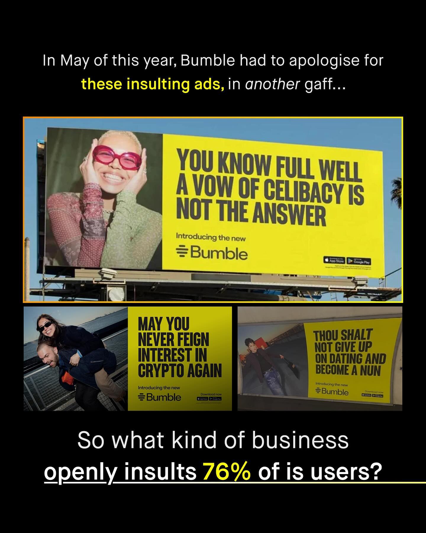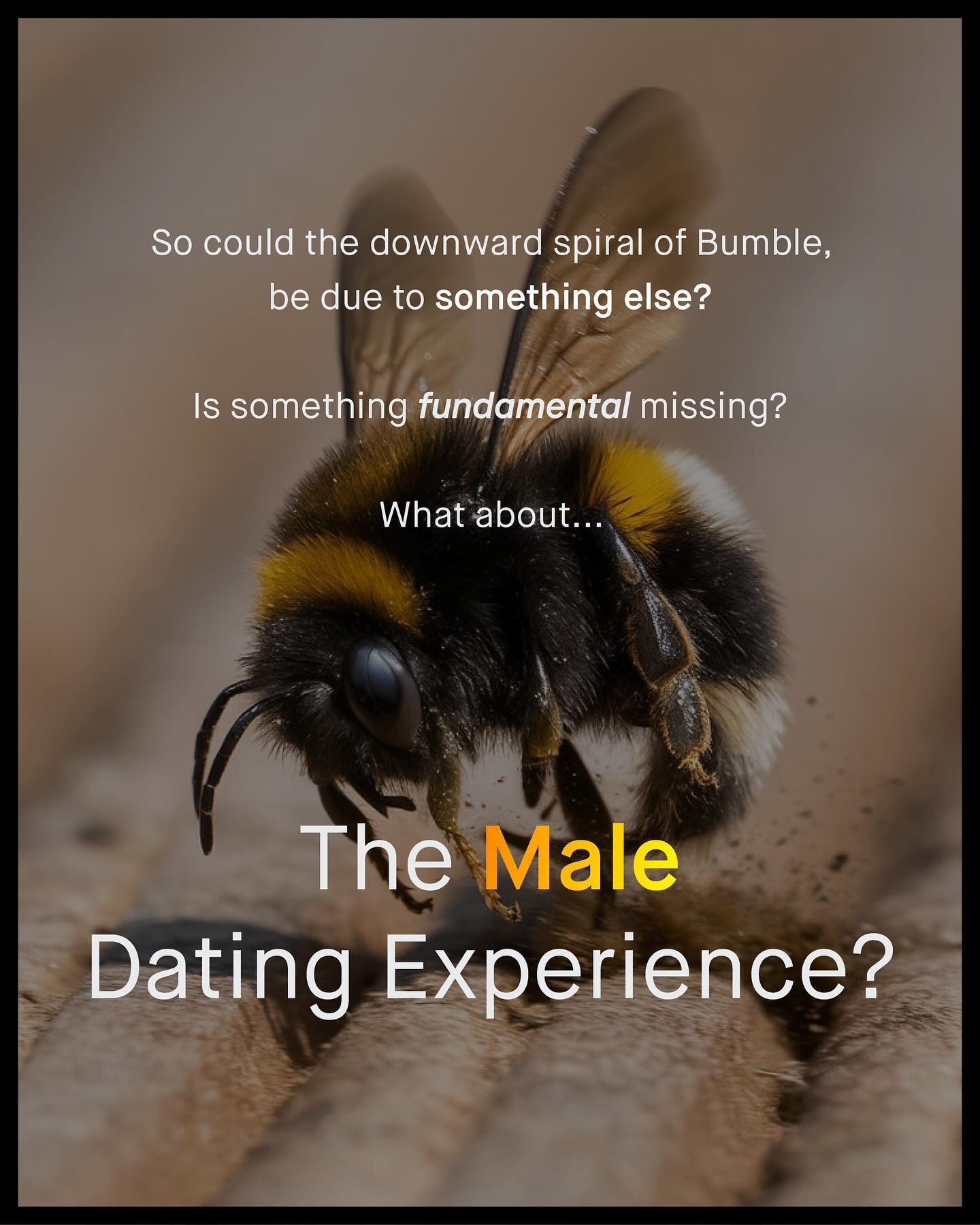 The unrelenting mangle of online dating, and the expectations, judgement, and inevitable rejection that comes with it, is a thing few people enjoy passing through. To be turned into a set of images, measurements, a few choice words, and your best gags, placed upon a conveyor belt of your peers, and savagely swiped through, doesn’t feel great. Nor does it capture the idiosyncratic and serendipitous nuance of match making. It’s it however, good for business. With such industrialised levels of rejection and insecurity, monetised into a multi billion dollar industry, none the less. But… that might be changing as Bumble, and Tinder, crash in the stock market, with no sign of change. Bumble, in particular, is truly f*cked. Losing one third of is value this year alone, slashing 37% of its workforce, and tumbling from it’s glorious initial $71 share value of 2021, to just $5 today. And this is only made worse by a litany of tone-deaf gaffs and errors, as Bumble continues to score own goals, as it slashes its overheads, terrifies its shareholders, and stubbornly insists on insulting its biggest customer… men (boo!) So what is next for the famously ‘women first’ dating app… Is it time to drop the sassy, finger snapping bombast? Will they learn the lesson that continually ridiculing, and neglecting 75% of your own customer base - those most likely to pay, no less - is, well… not great for business? Will they finally take the time to understand the male dating experience too? Or is it too late… What do you think? #dating #datingadvice ~ Tinder Study Images by Food Photographer and Mesut Cicen