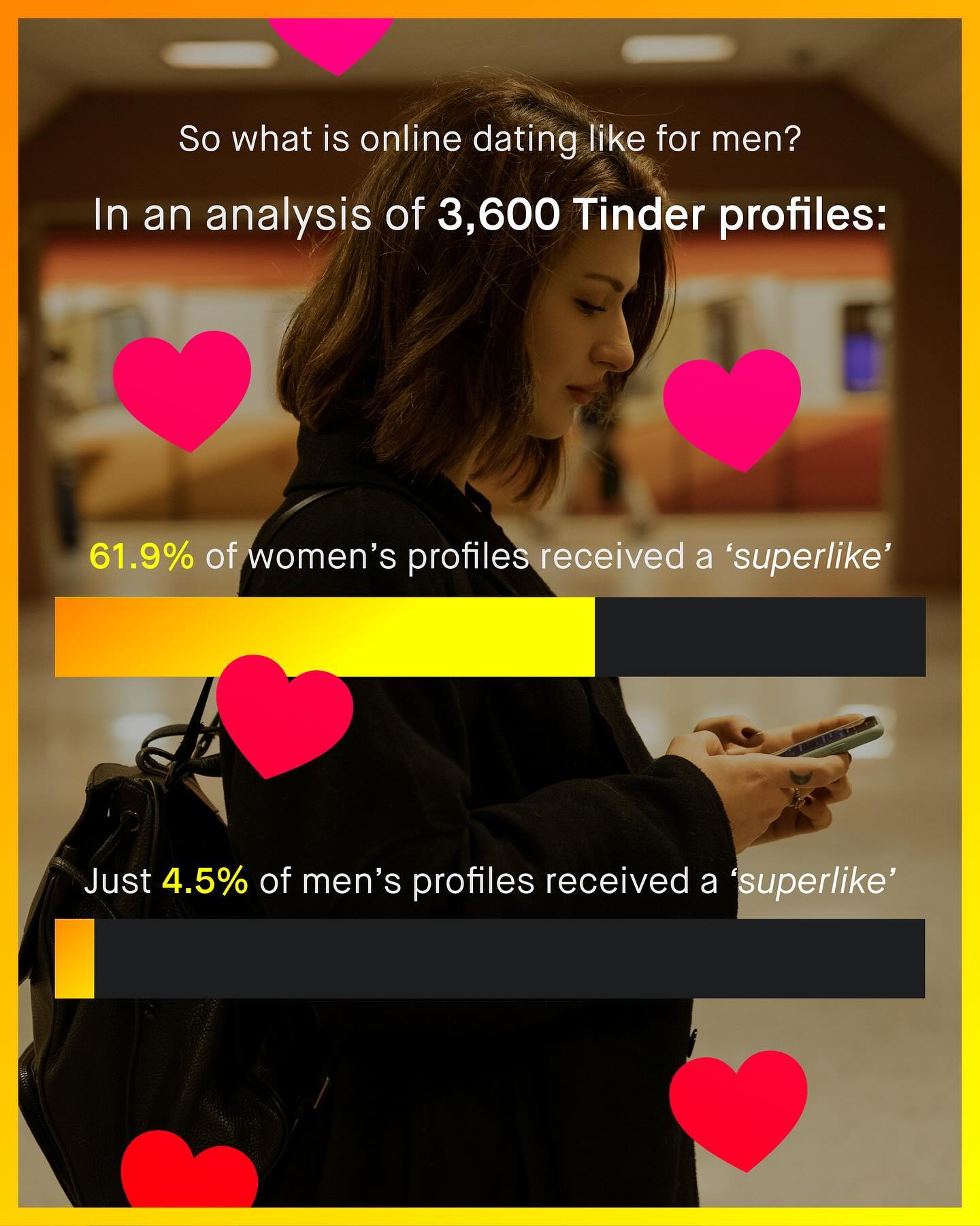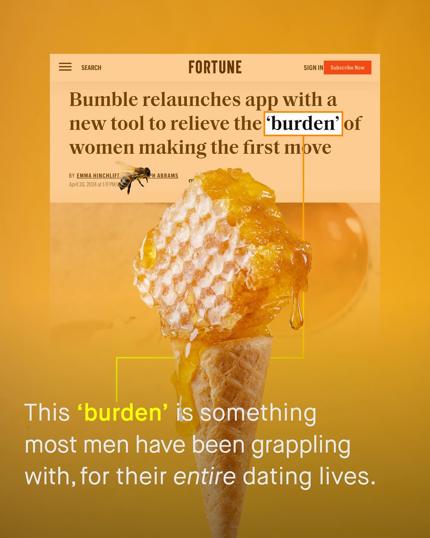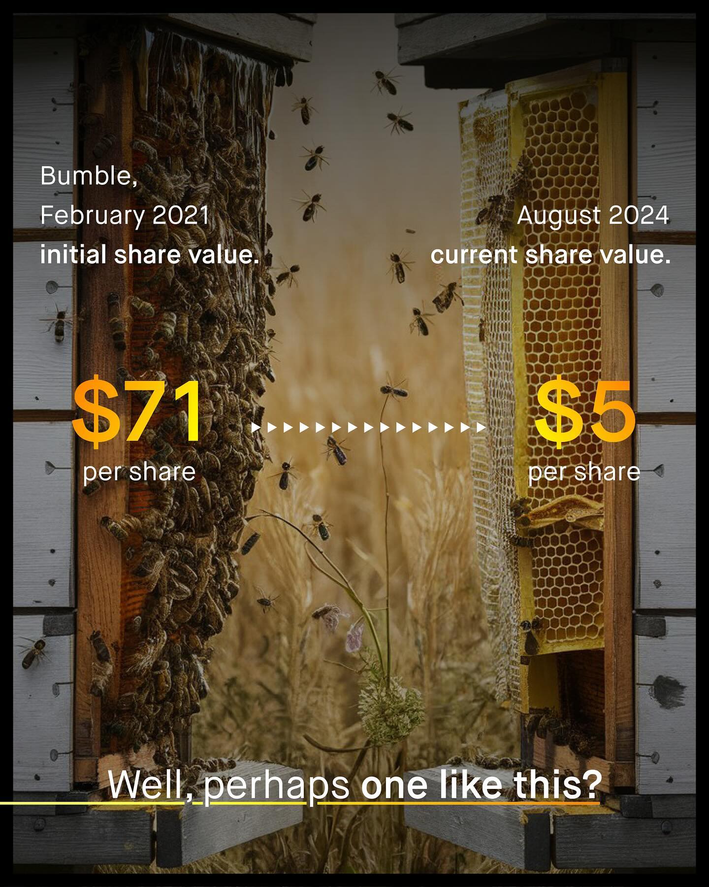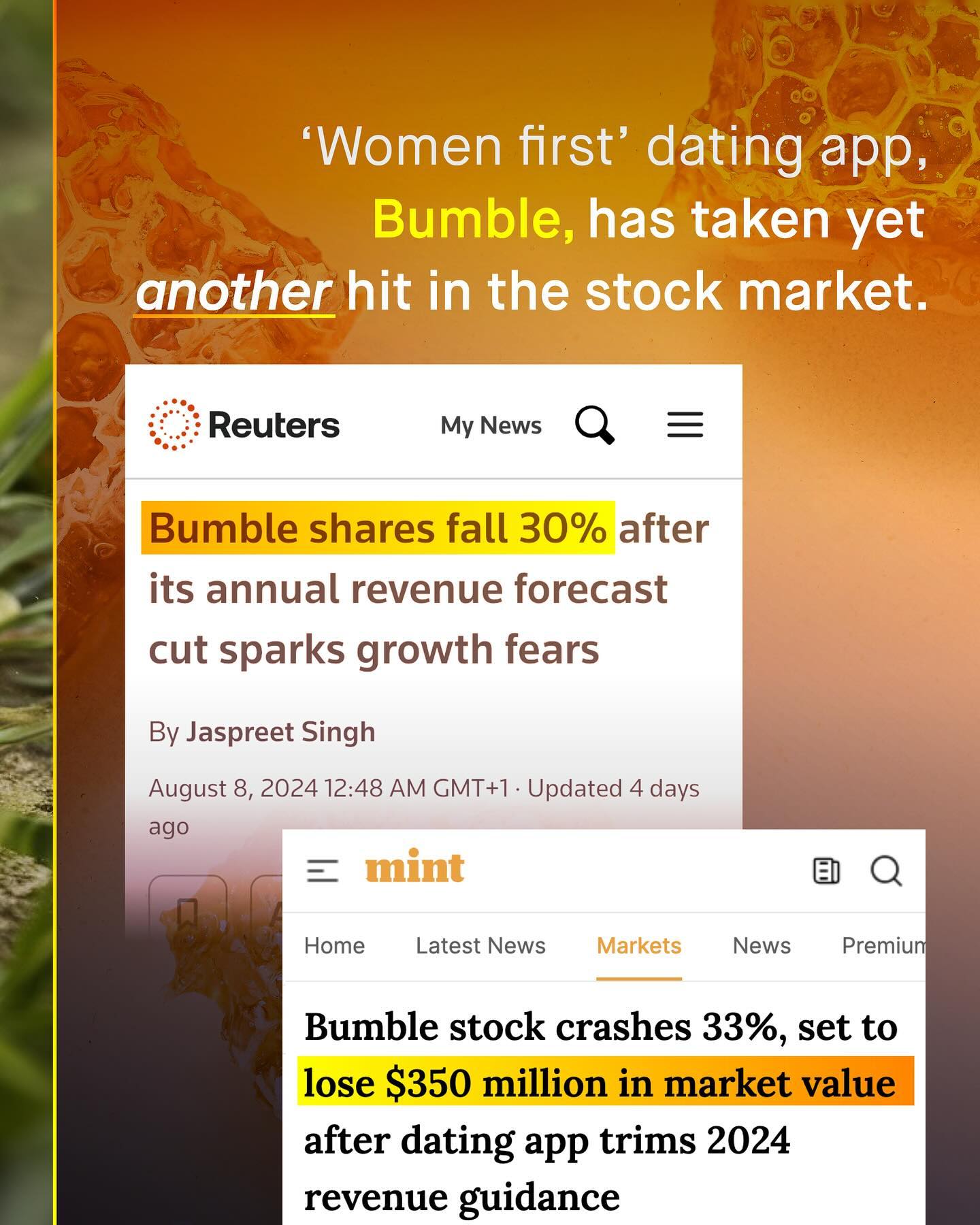The unrelenting mangle of online dating, and the expectations, judgement, and inevitable rejection that comes with it, is a thing few people enjoy passing through. To be turned into a set of images, measurements, a few choice words, and your best gags, placed upon a conveyor belt of your peers, and savagely swiped through, doesn’t feel great. Nor does it capture the idiosyncratic and serendipitous nuance of match making. It’s it however, good for business. With such industrialised levels of rejection and insecurity, monetised into a multi billion dollar industry, none the less. But… that might be changing as Bumble, and Tinder, crash in the stock market, with no sign of change. Bumble, in particular, is truly f*cked. Losing one third of is value this year alone, slashing 37% of its workforce, and tumbling from it’s glorious initial $71 share value of 2021, to just $5 today. And this is only made worse by a litany of tone-deaf gaffs and errors, as Bumble continues to score own goals, as it slashes its overheads, terrifies its shareholders, and stubbornly insists on insulting its biggest customer… men (boo!) So what is next for the famously ‘women first’ dating app… Is it time to drop the sassy, finger snapping bombast? Will they learn the lesson that continually ridiculing, and neglecting 75% of your own customer base - those most likely to pay, no less - is, well… not great for business? Will they finally take the time to understand the male dating experience too? Or is it too late… What do you think? #dating #datingadvice ~ Tinder Study Images by Food Photographer and Mesut Cicen
