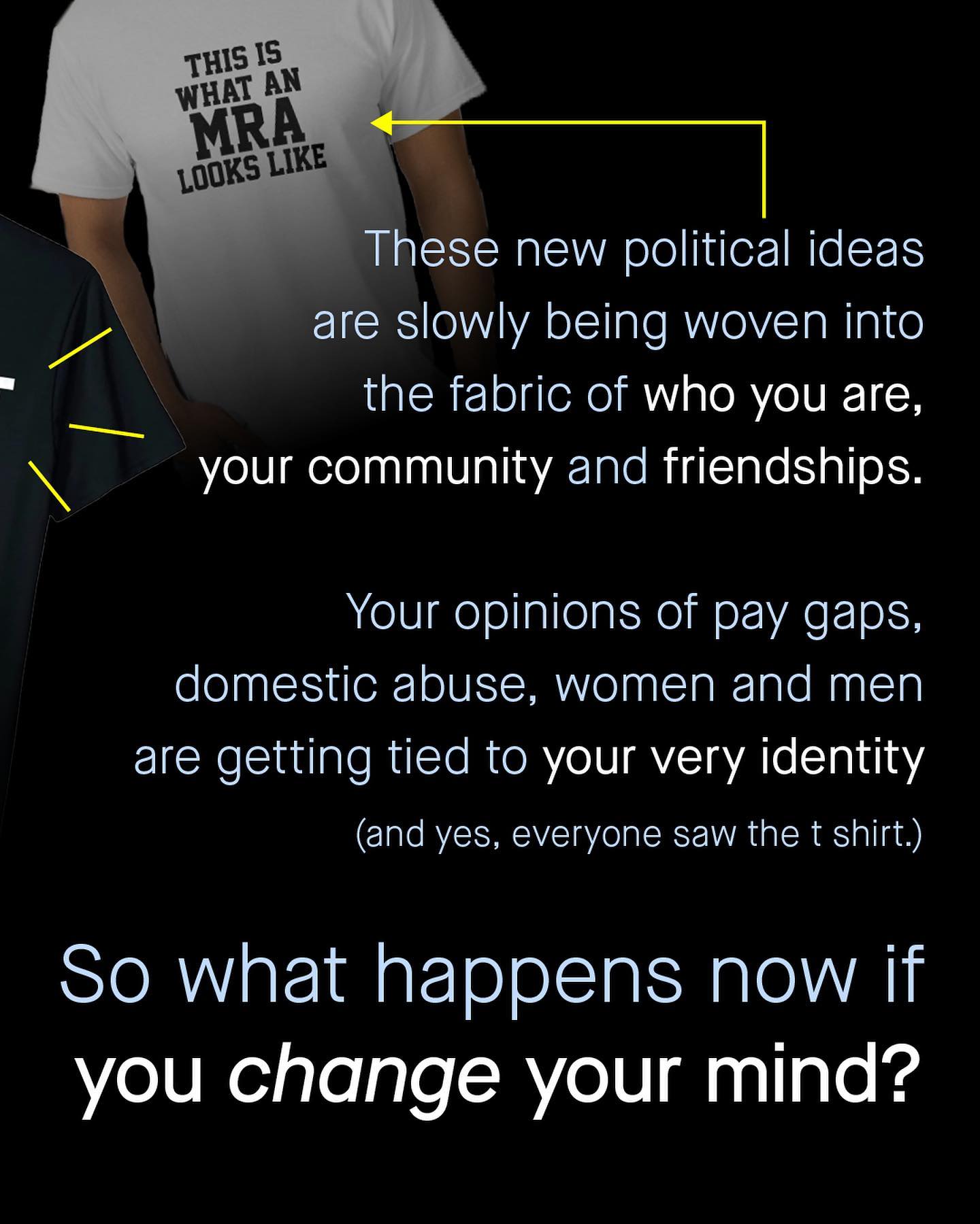 I am not an MRA. I am not a feminist. No, I do not want to “identify” as any set of rigid political beliefs. I don’t want to do it, because I don’t want my fundamental identity to be chained to ideas that might need to change, or which could well be wrong. Call me greedy but I want to pick and choose, mix and match; to copy, transform and combine the best ideas, from other people. Despite being an advocate of women, I cannot be a feminist as I don’t believe in patriarchy theory, I don’t believe the pay gap is real and I don’t believe domestic abuse is a gendered issue either. Despite being an advocate of men, I cannot be an MRA because I don’t think ‘women have it easy’, I don’t think society is entirely gynocentric and I’m bored of the endless explosions and battle cries against feminism. I don’t just want fizzy cola bottles, because I also want to try gummy bears, and I’m partial to cherry drops too. So I’ll take bits of both sides and leave the rest, thanks. I understand labels can be empowering, they can unite us through alliances. But so too they can become lead weights and blindfolds, stubbornly causing division and ignorance that can hold us back. I see it all the time. Sometimes I talk to people and I quickly realise they simply *cannot be wrong*. They aren’t allowed to be. They cannot be wrong because who they are, and their very identity as a human being, is conditional them being right. And this is a dangerous place to be, I’ve been there before and won’t be going there again. So I identify as ‘George’, as… me. And perhaps you should identify as you too. ~