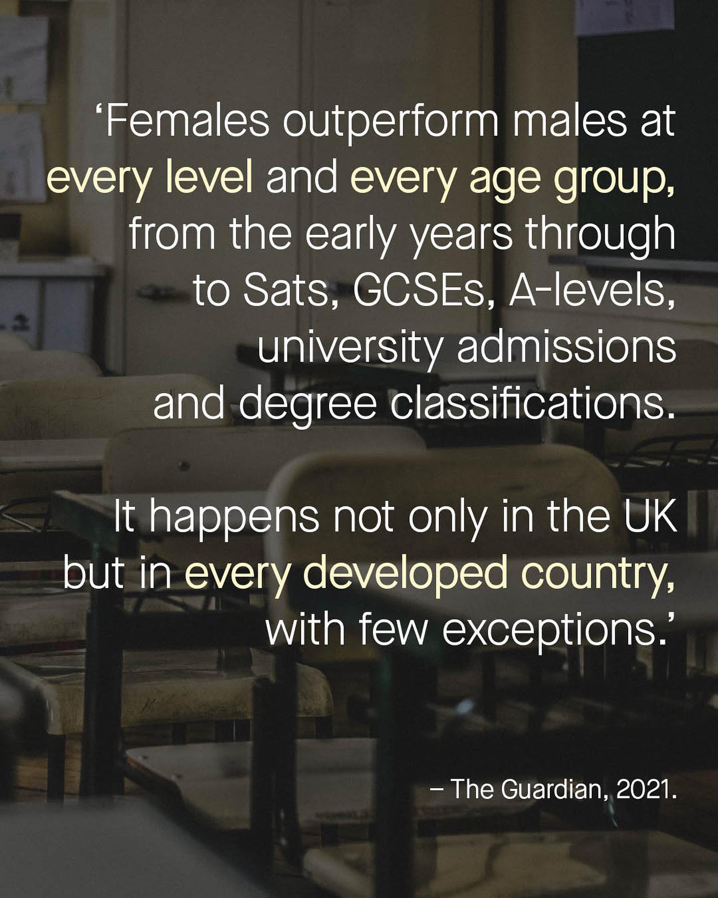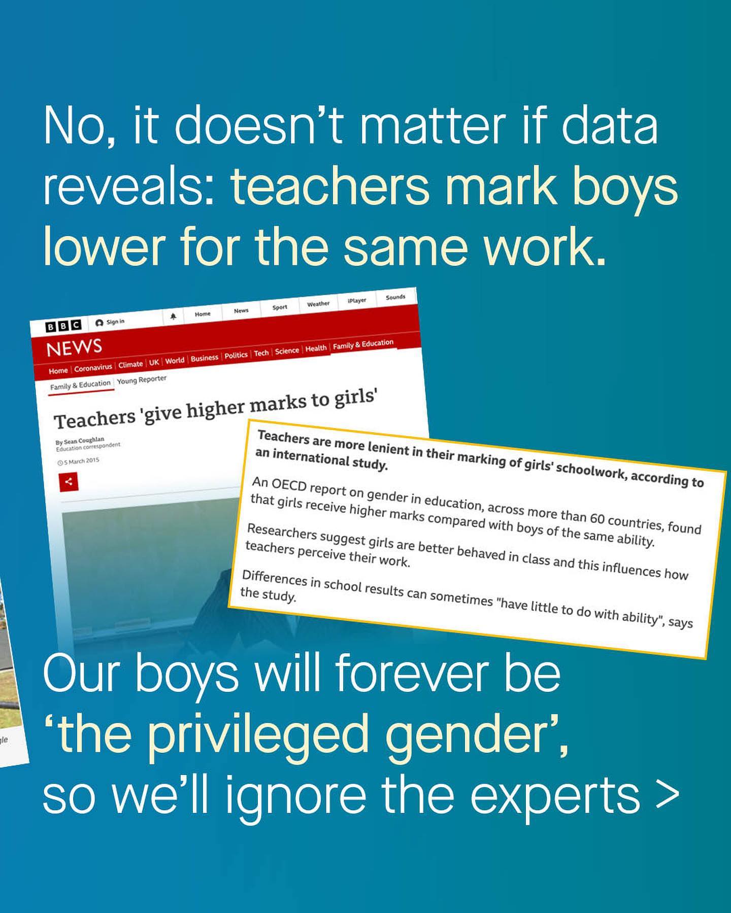 There’s no simpler way to put it, boys are being failed by our education system. For decades they’ve quietly slipped behind. At all stages, and all age groups; whether in early years, in primary school, SATs, GCSE, A-levels, or university admissions, girls and young women march further and further ahead. And it’s growing - The A-level gender gap has doubled in 10 years, the degree gender gap doubled in just 8. Campaigners are saying that in the next decade, the gap between rich and poor will be ‘eclipsed’ by the gap between males and females. You know it’s bad when the former CEO of the very organisation that is in charge of university admissions (UCAS), is herself accusing policy makers of ‘deafening silence’, and pointing to ‘systemic sexism’ against boys in schools. Mary Curnock-Cook, IS the authority on educational attainment, and she’s ignored too. And it’s not just in the UK, we can go further abroad – 2.5 million *more* American women enrol in American universities each year, than men. Two and a half MILLION. In fact, in every developed country, with only a few exceptions, boys are behind girls. And who cares? Nobody. We just throw around juvenile and ignorant catchphrases like ‘privileged gender’, totally uneducated *ourselves*. Whilst has there been any meaningful action, or any mention at all, from the feminist movement about boys in school? No, there has not. The so called gender equality movement remains obsessed with continuing advocacy for the privileged gender (girls), and educating the boys only on not becoming rapists. So, has feminism failed our boys in school? ~ Source Boys behind for 30 years Boys behind everywhere Teachers give higher marks to girls Currnock Cook, UCAS CEO Images by soragrit-wongsa, tadeusz-lakota, feliphe-schiarolli and ryan-tauss from Unsplash
