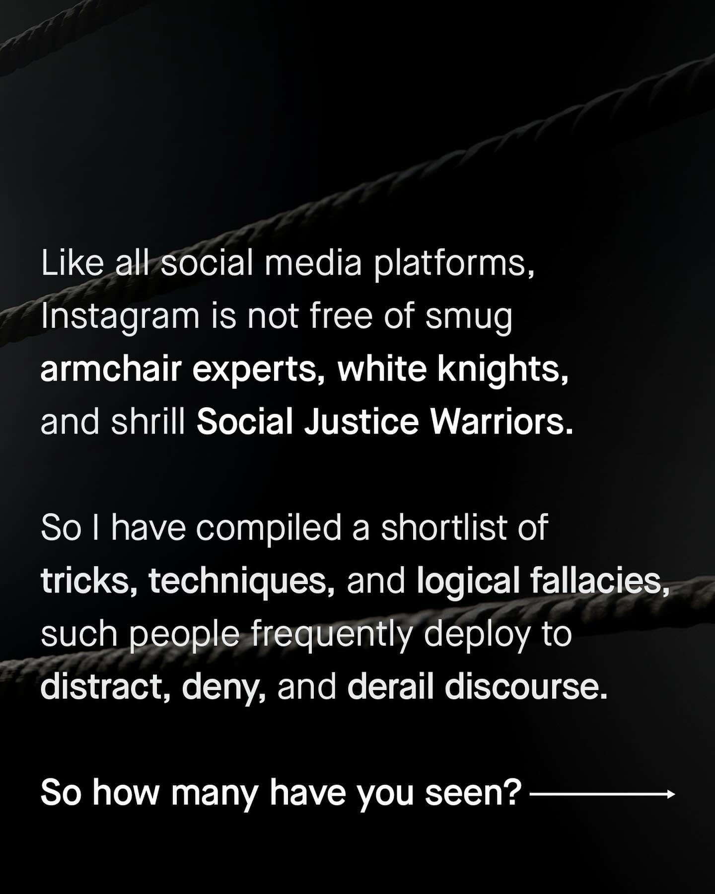 The first 12 months of @thetinmen was a baptism of fire for me; every comment section, under every post, soon became a battleground of mud-slinging debate. The bombardment of silly names, the blabbering of baseless claims, and the continual reference to ‘facts’ without citation, was more or less a daily experience for me. And it was to my benefit. As through such a process, I was able to develop the skills, and find the words, I now use to assert my position more eloquently than ever. So too, as with anything you do on a day to day basis, you notice the patterns and weaknesses of your opponents, and how to unravel them. You soon see the trolls for all their ugliness. The wye smiles of sealions, and their pleas for civility. The Gish Gallopers as they fire out thousands of baseless claims, drowning out discourse like a broken howitzer. You see those hiding in ‘the Motte’, moving the goalposts and muddling semantics. And the Bigoteers flinging shit around, like a petulant child who’s eaten too many sweets. These are lessons hard learnt, sculpted through the fire and brimstone of a thousand bloody battles, against an army of nitwits, cry bullies, and megalomaniacs. And I know, many of you have been right there with me. So what have you learnt from the comment sections of social media? What are the tricks and sleight of hands you’ve seen? And how did you beat them? What do you think? ~ Images by Getty, Jay Rembert, Sandra Setamaa, Chris Yang, and Martin Martz. #logicalfallacy #debate #logicalfallacies