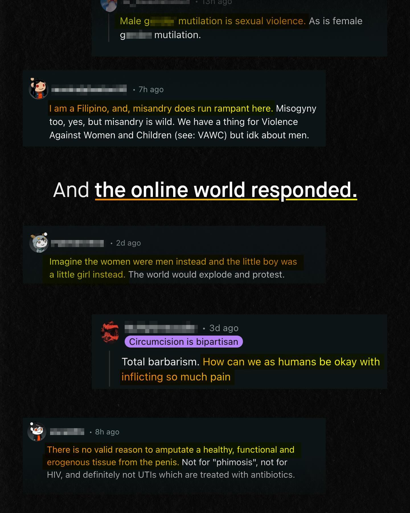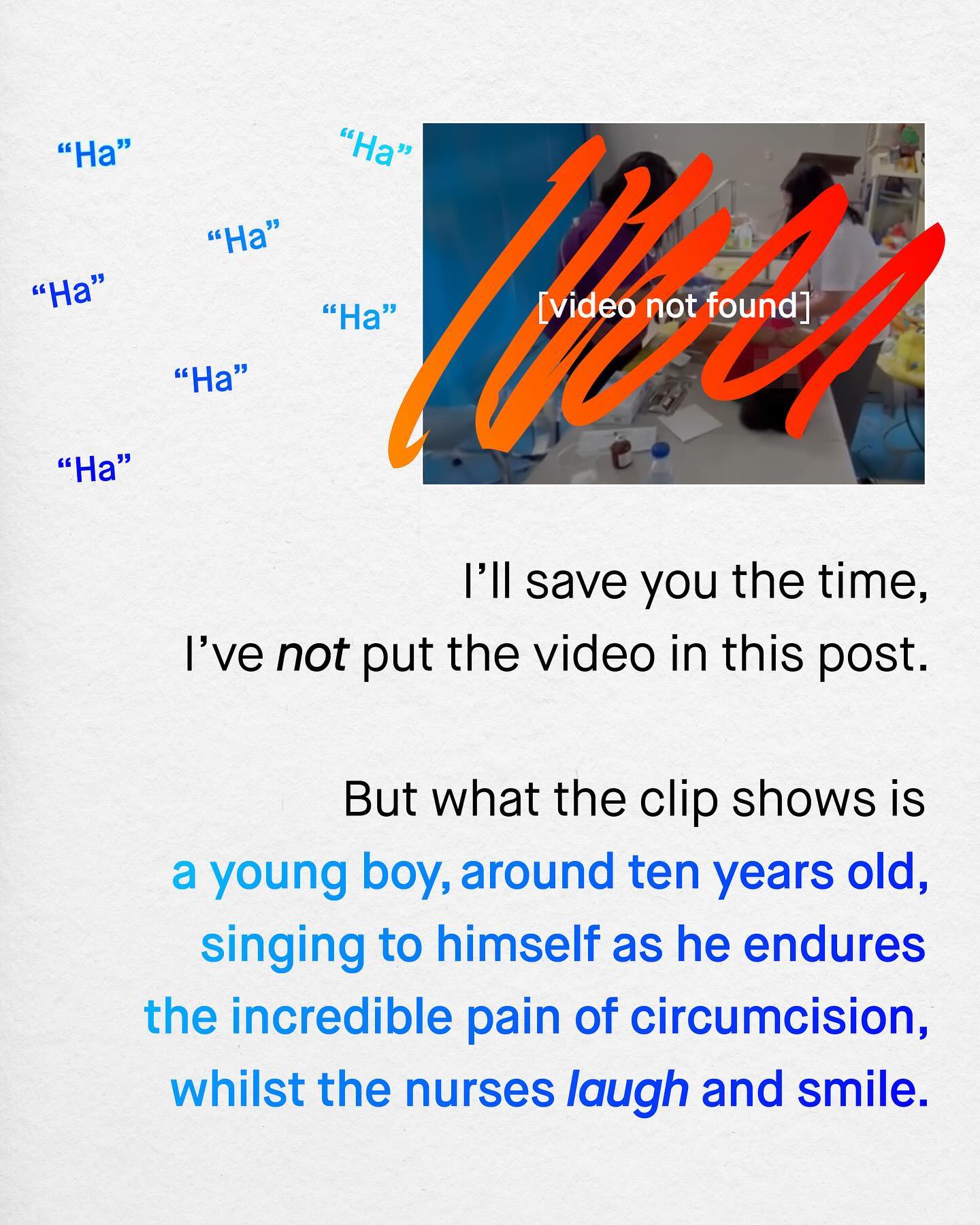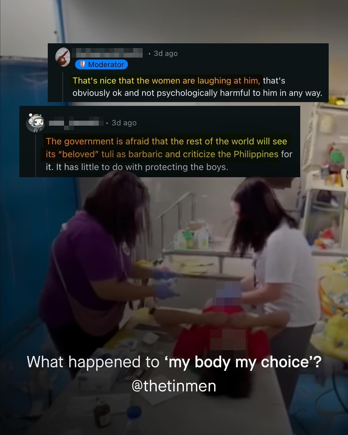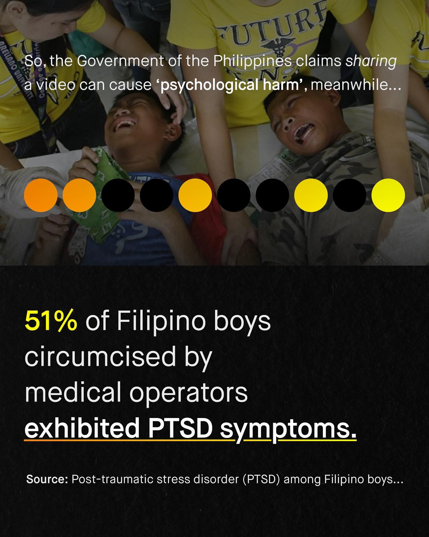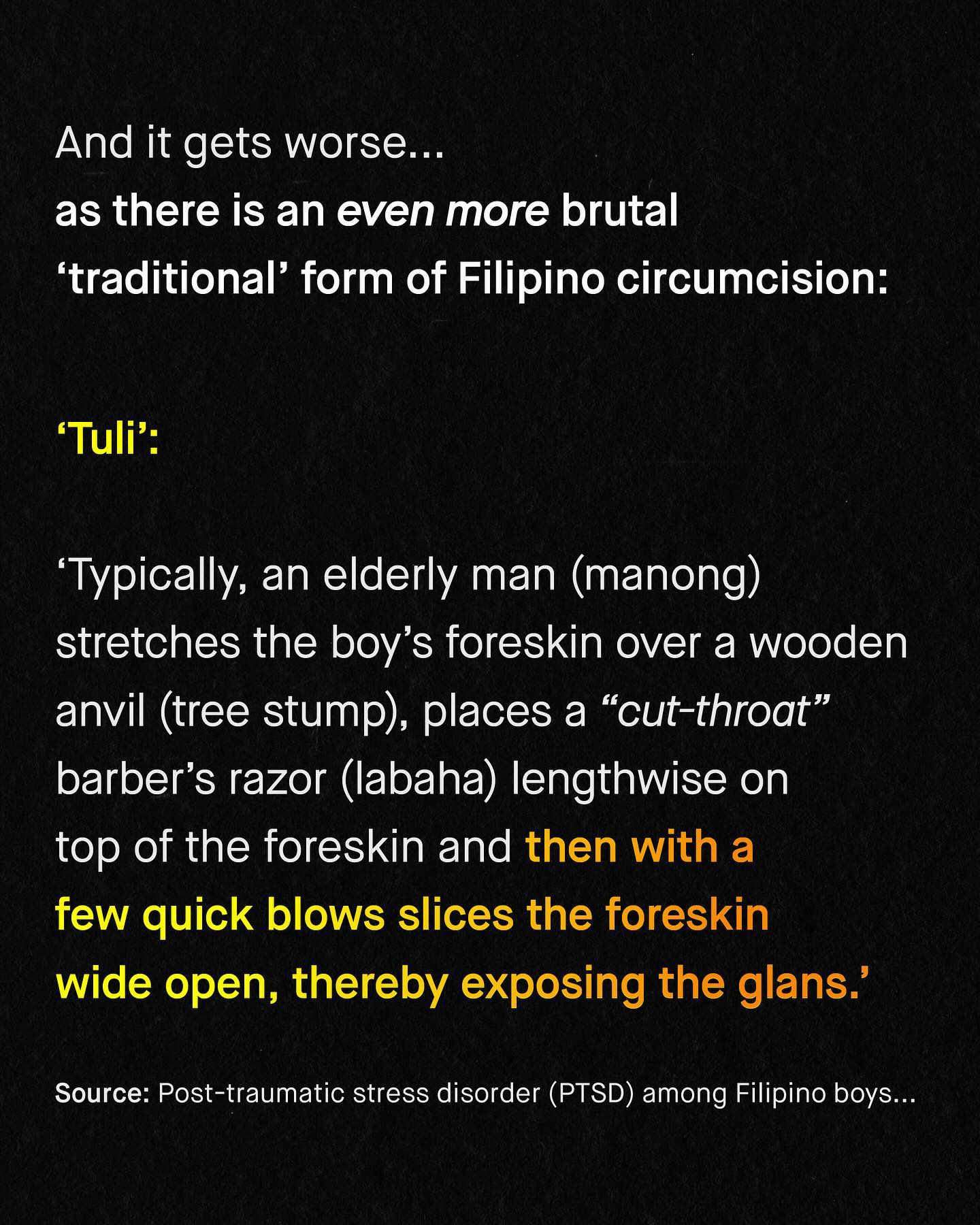 A video of a boy singing to cope with the pain of circumcision, as the nurses smile and laugh, has hit the internet. To most, the video is a shocking revelation of the traumatic, fantastically painful, and totally needless violation of a boy’s bodily integrity. To others, it is somehow a ‘hilarious’ meme, to be shared with friends, and laughed over. Either way, the video started to spread. Soon, it became so widely shared, that the Government of the Philippines got involved, releasing a public announcement about the shocking clip. But the announcement did not condemn the procedure, or even the laughter of the nurses as they – likely without anaesthesia – cut away at an unconsenting boys body… No, instead, the Government condemned those sharing the video. Going further in fact, to suggest that the sharing of such a video could have ‘serious psychological consequences’ on the boy. It was an absurd announcement. One that looks past the barbaric nature of circumcising boys, and the proven trauma it inflicts, to suggest those sharing the video are causing ‘psychological harm’ instead. Are they joking?! Here are the facts – More than half (51%) of Filipino boys circumcised by medical operators exhibit PTSD symptoms. And worse, if such a thing were possible, nearly 70% of Filipino boys circumcised the ‘traditional way’ (known as Tuli) met the DSM-IV criteria for a diagnoses of PTSD. So what is to be said about the Government of the Philippines inflicting a procedure onto the entire population of boys, that literally causes PTSD in at least half of those who under go it? And why are they more concerned about the ‘psychological consequences’ of a viral video being shared? Surely, only in the upside down, permanently gaslit world of men and boys advocacy could such an obscene sequence of events happen. So who is really causing psychological harm, and failing to safeguard our boys? What do you think? #intact #intactivist ~ Study Announcement