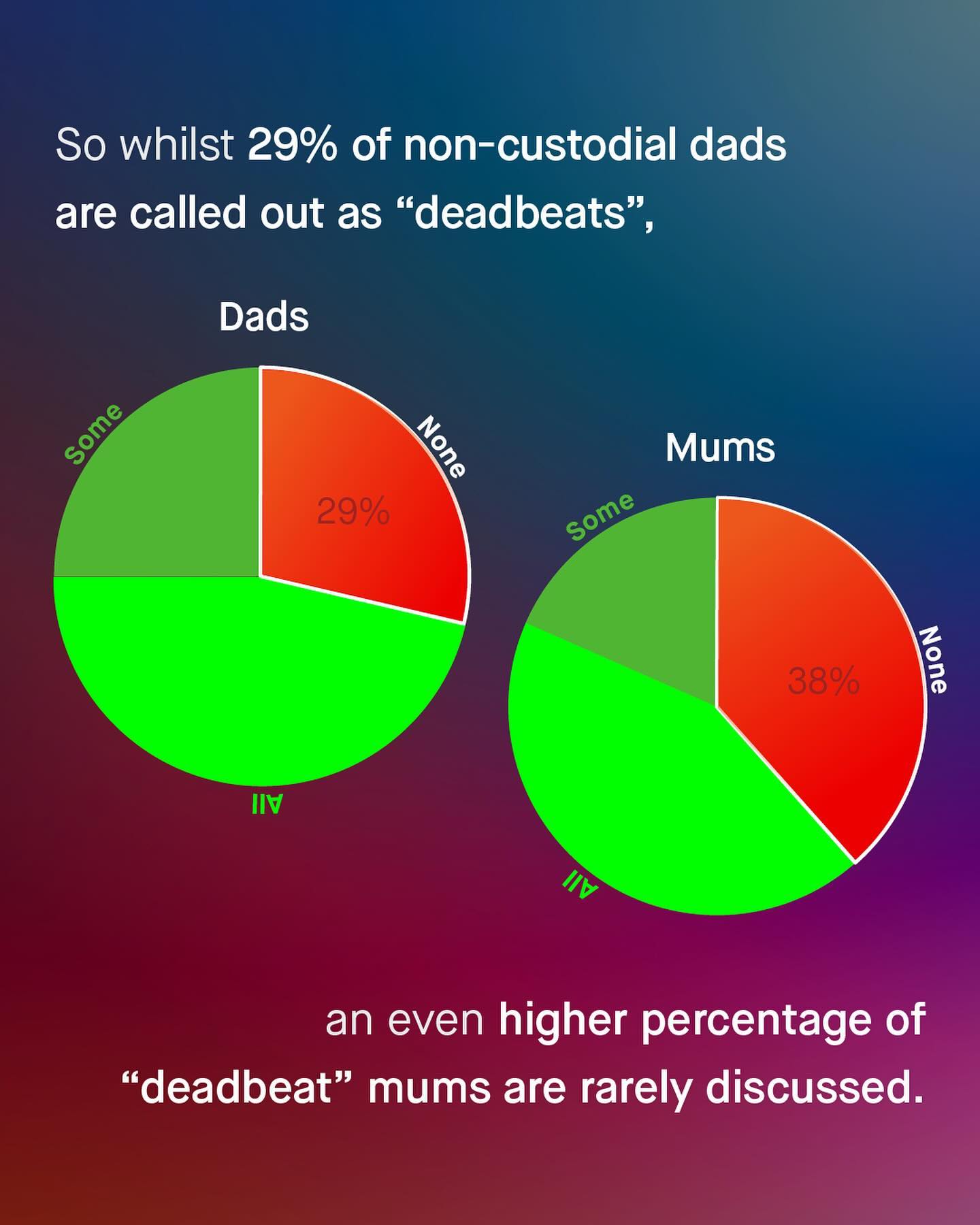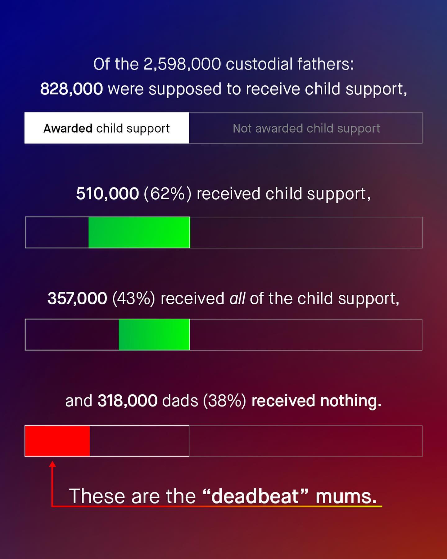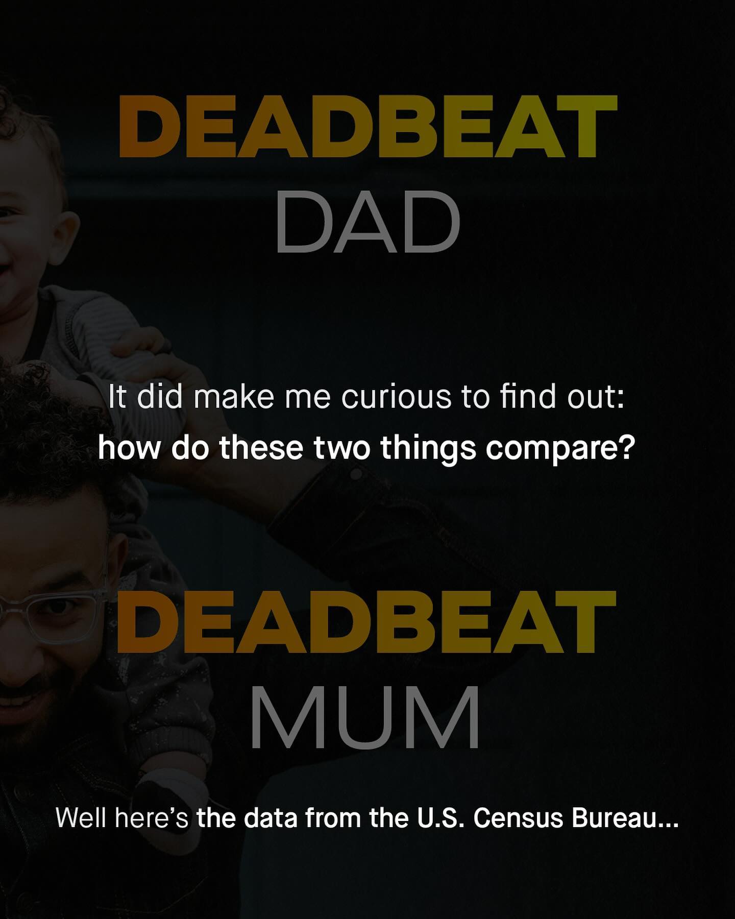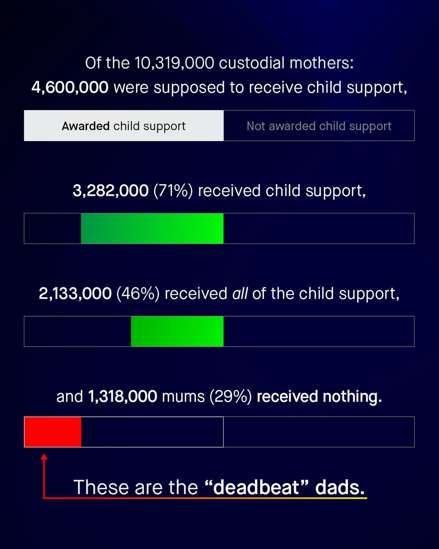 As is custom, ‘fathers’ are another sub group of men, who are seemingly held to a higher level of accountability than many of their female counterparts. Specifically, I am talking about the concept of “deadbeats”; which is a pejorative term routinely, and often rightly, assigned to noncustodial fathers, who don’t pay child support. And again, like most of these newly fangled modern terms, they are mindlessly flung around like frisbees, with little consideration or concern for whom is hit by them. You see it splashed across headlines. You hear it blabbered about by politicians. You see it scrawled onto placards, and yelled about in comment sections. “Deadbeat dads will have nowhere to hide!” You’ll hear, read, or see, again and again, as society demands men take yet another large slice from the accountability pie. And I understand much of it. Whilst it’s impossible to know the individual circumstances of these men, or understand why they don’t, or can’t pay what they owe - we do know that around 29% of American fathers who owe it, pay no child support, and that’s far too high. But does such a thing as “deadbeat mums” exist? And if it does, why are they never spoken about in the same breathe? Is it one set of expectations and responsibilities for fathers, and another for mothers? Well let’s take a look at the data from the U.S. Census Bureau, to finally fill in what’s missing from the conversation... What do you think? - U.S. Censur Bureau Data Images by Kelly Sikkema, Ben Wicks, Samuel Cesar, Codioful, Kiwi Hug, and Getty.
