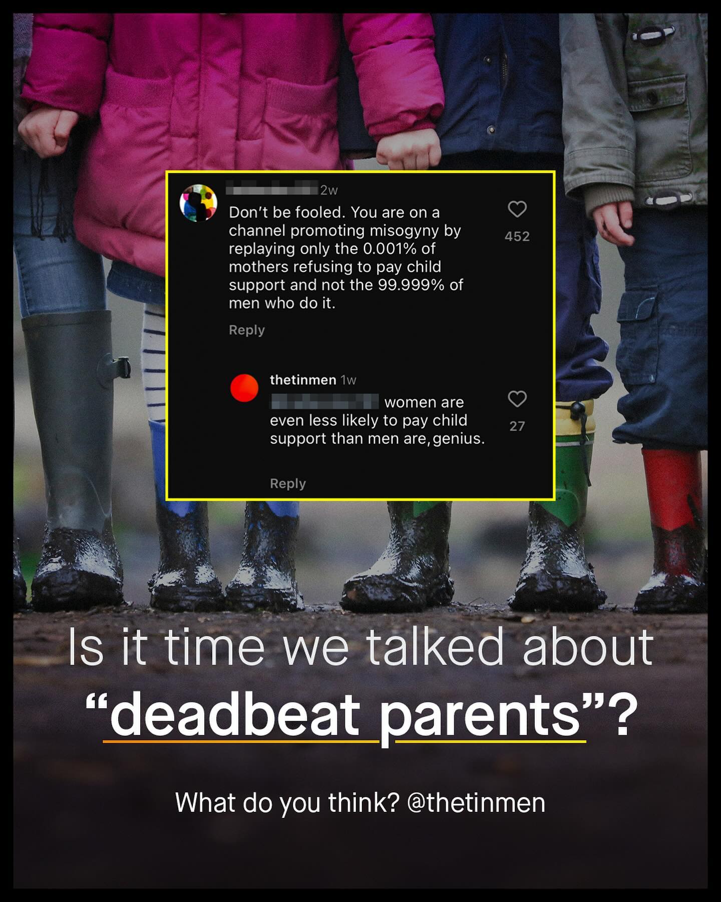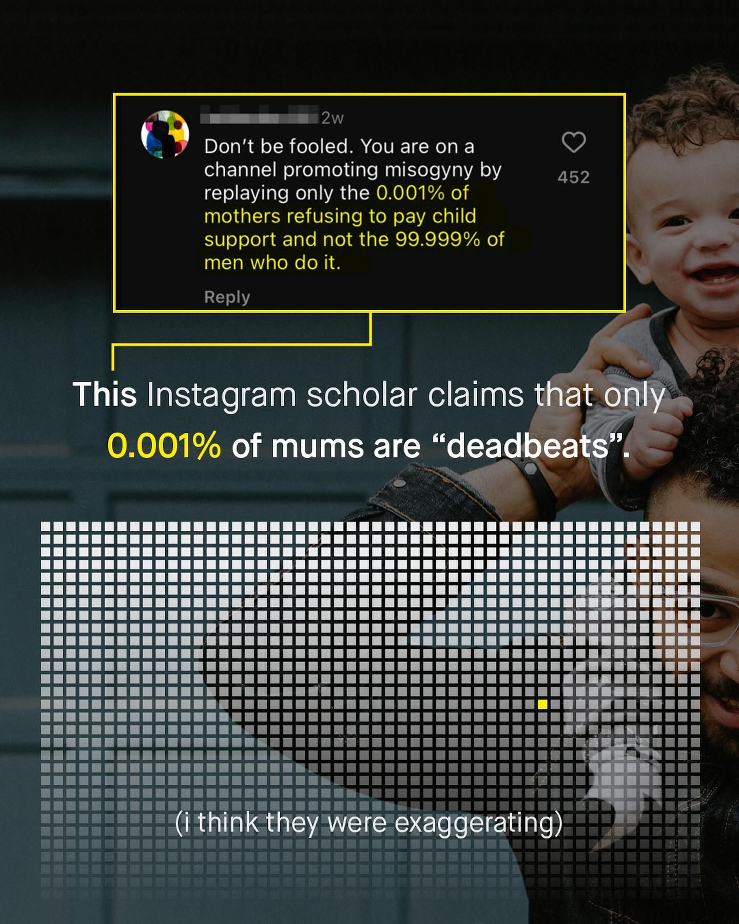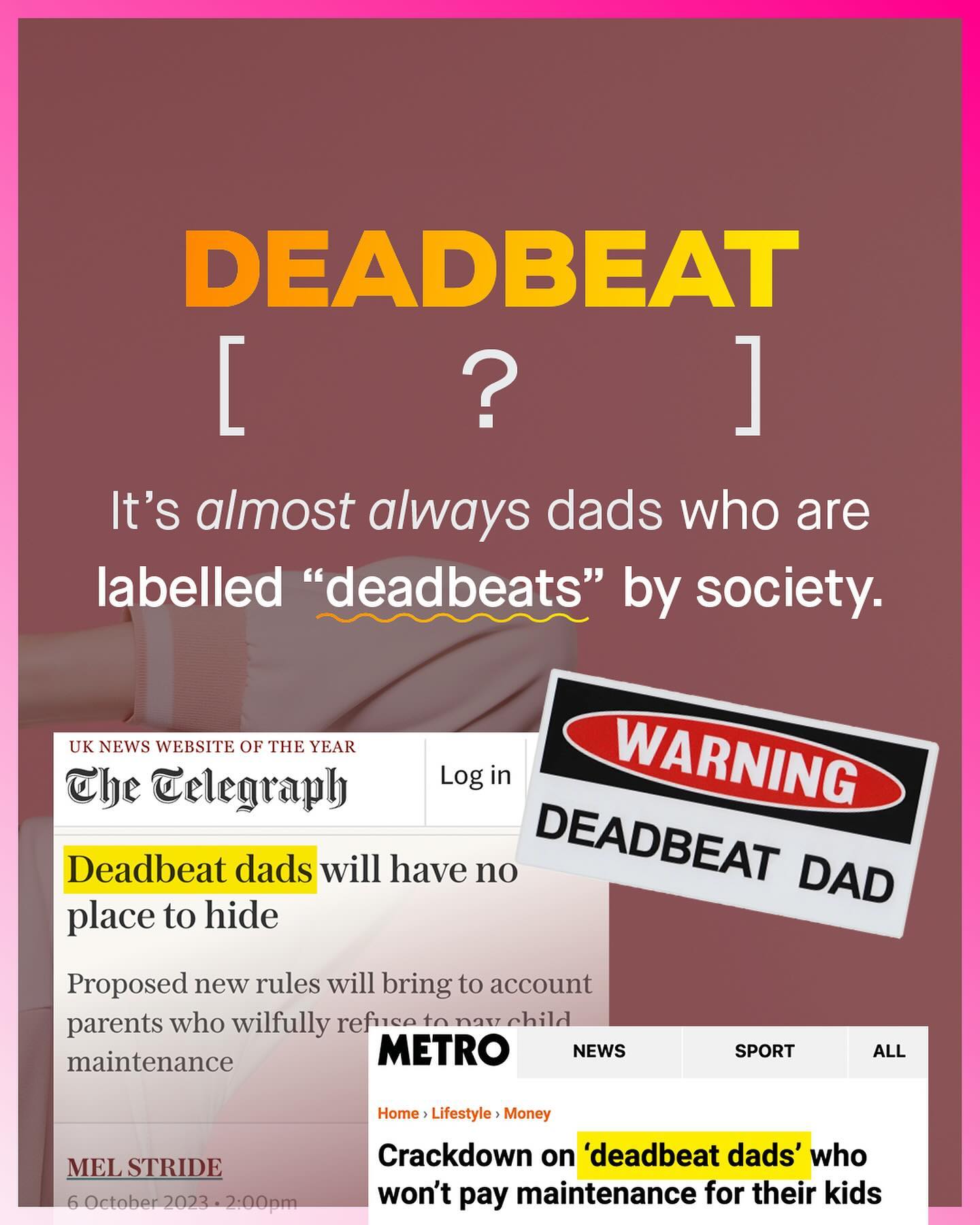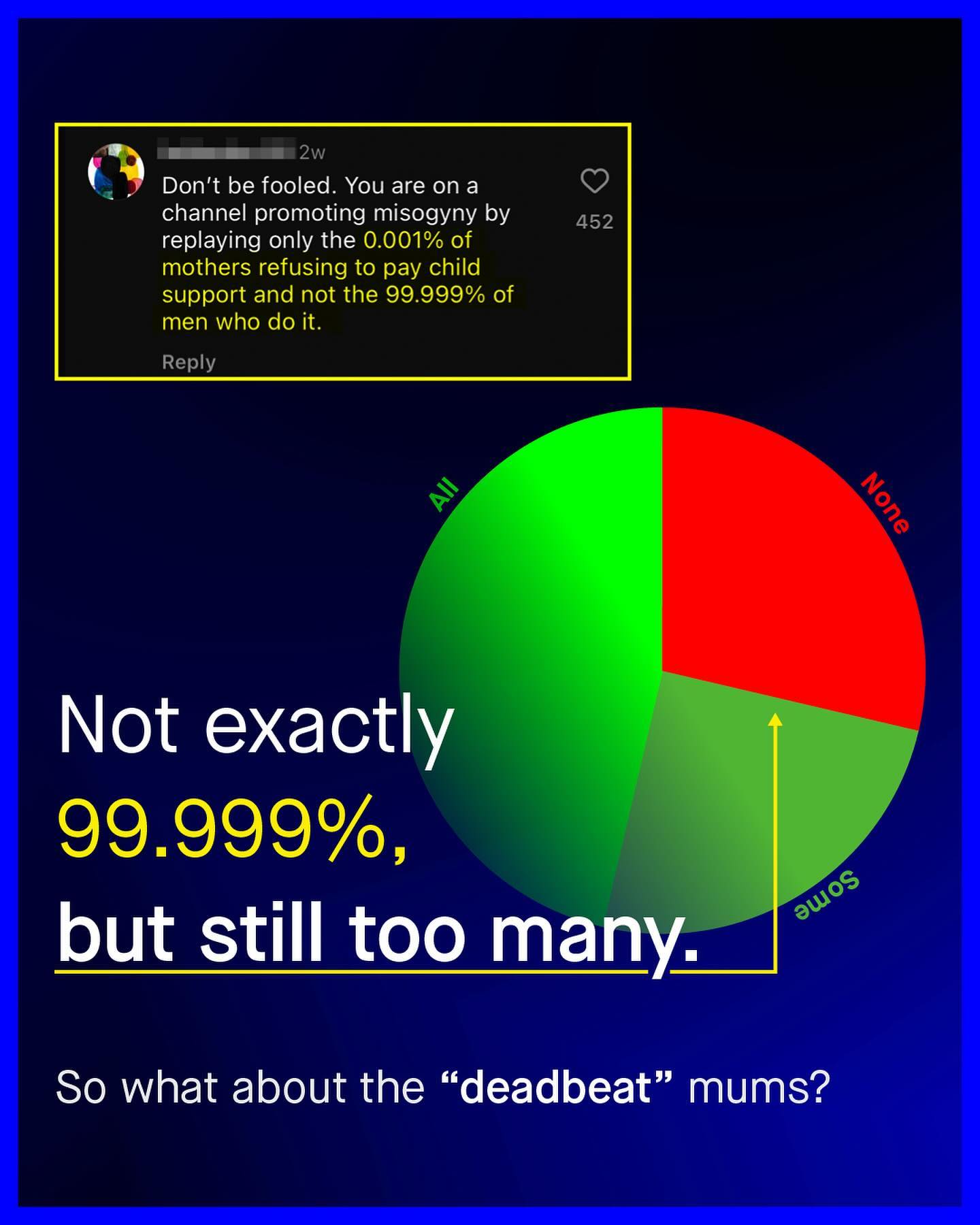 As is custom, ‘fathers’ are another sub group of men, who are seemingly held to a higher level of accountability than many of their female counterparts. Specifically, I am talking about the concept of “deadbeats”; which is a pejorative term routinely, and often rightly, assigned to noncustodial fathers, who don’t pay child support. And again, like most of these newly fangled modern terms, they are mindlessly flung around like frisbees, with little consideration or concern for whom is hit by them. You see it splashed across headlines. You hear it blabbered about by politicians. You see it scrawled onto placards, and yelled about in comment sections. “Deadbeat dads will have nowhere to hide!” You’ll hear, read, or see, again and again, as society demands men take yet another large slice from the accountability pie. And I understand much of it. Whilst it’s impossible to know the individual circumstances of these men, or understand why they don’t, or can’t pay what they owe - we do know that around 29% of American fathers who owe it, pay no child support, and that’s far too high. But does such a thing as “deadbeat mums” exist? And if it does, why are they never spoken about in the same breathe? Is it one set of expectations and responsibilities for fathers, and another for mothers? Well let’s take a look at the data from the U.S. Census Bureau, to finally fill in what’s missing from the conversation... What do you think? - U.S. Censur Bureau Data Images by Kelly Sikkema, Ben Wicks, Samuel Cesar, Codioful, Kiwi Hug, and Getty.