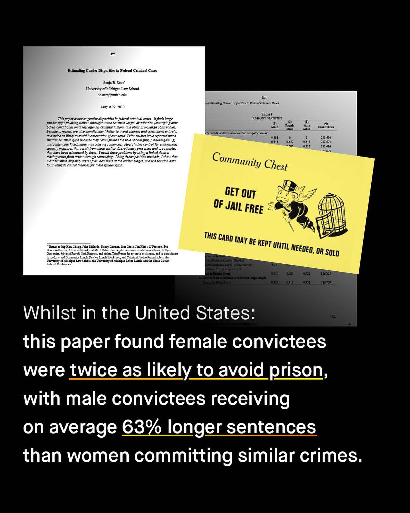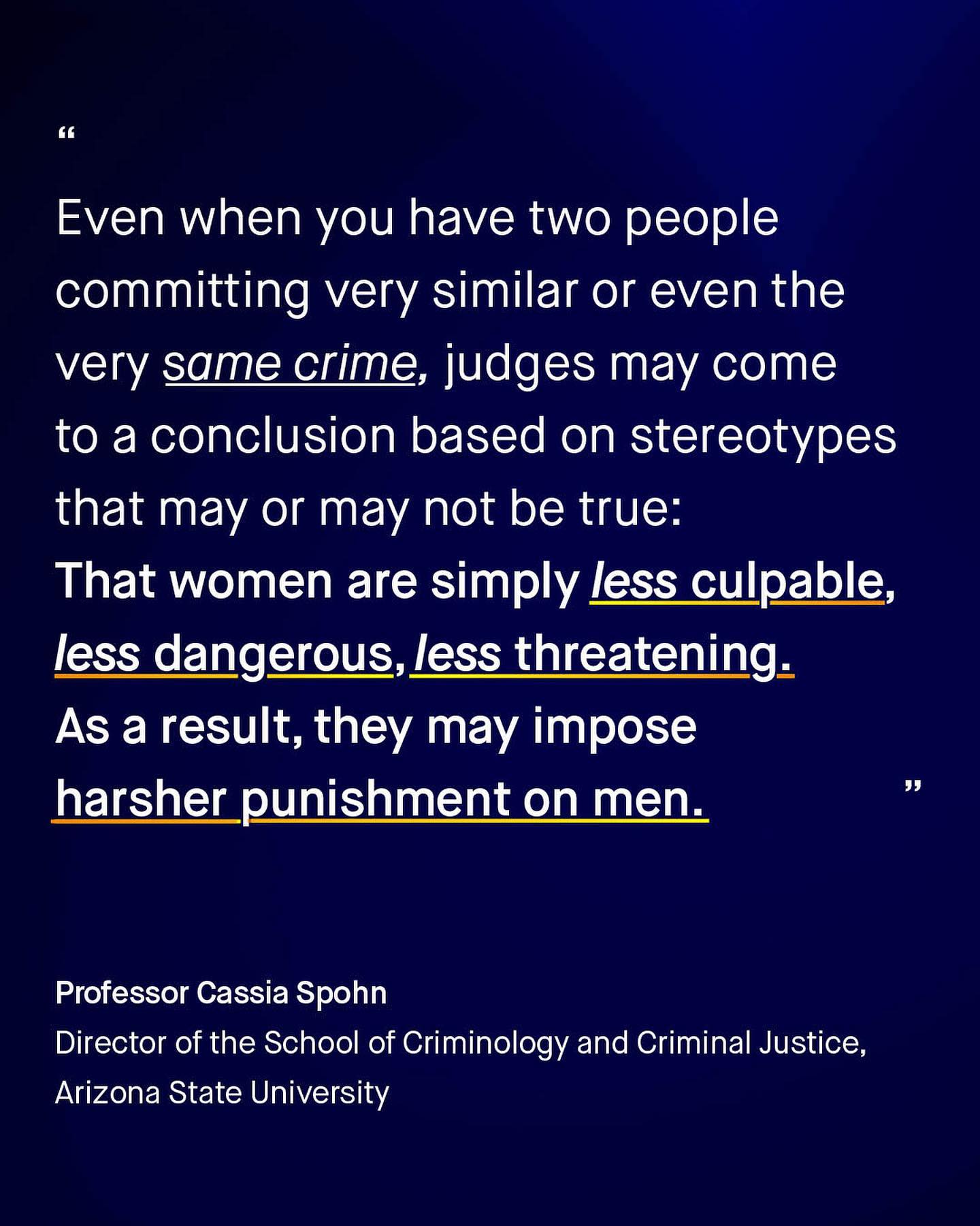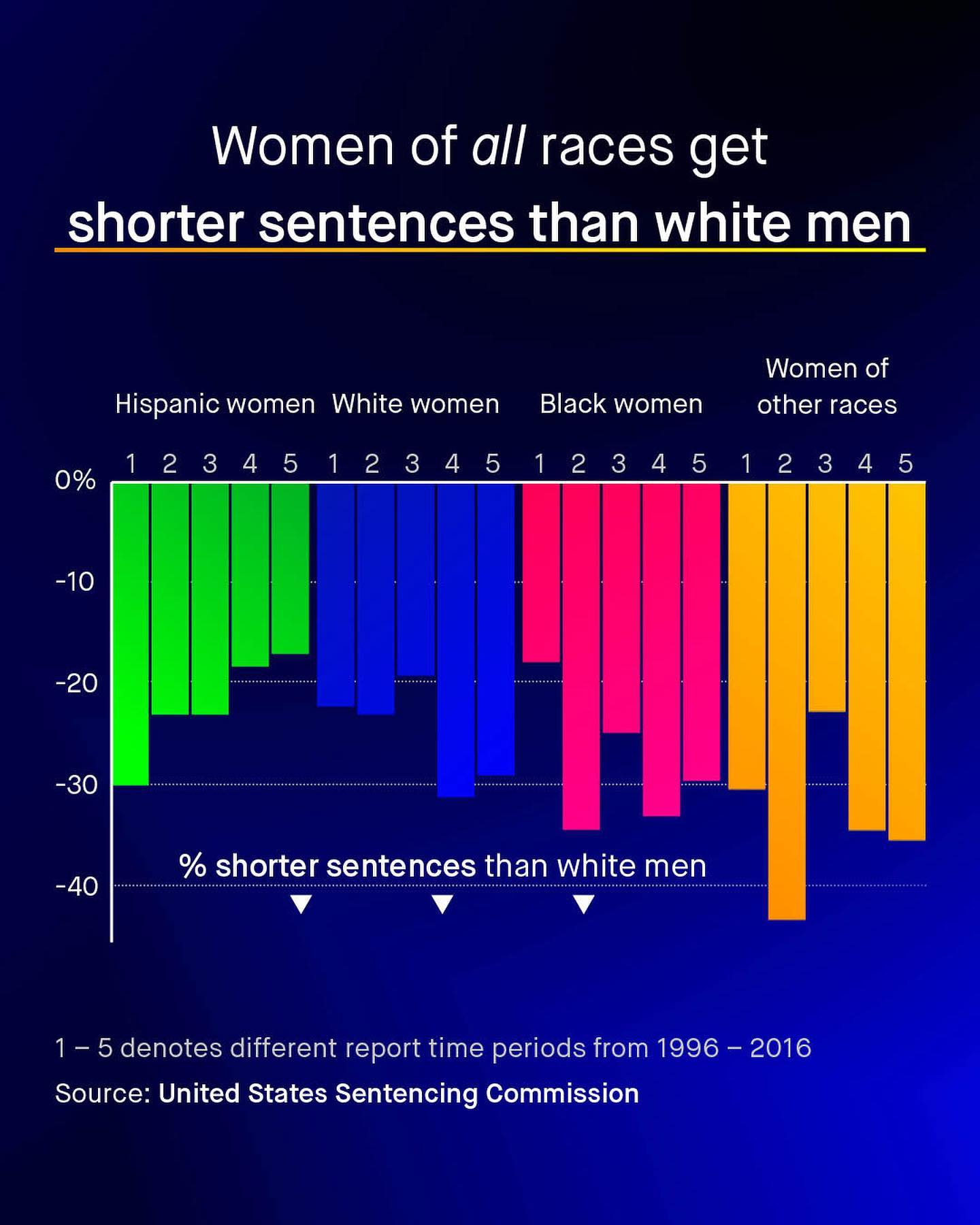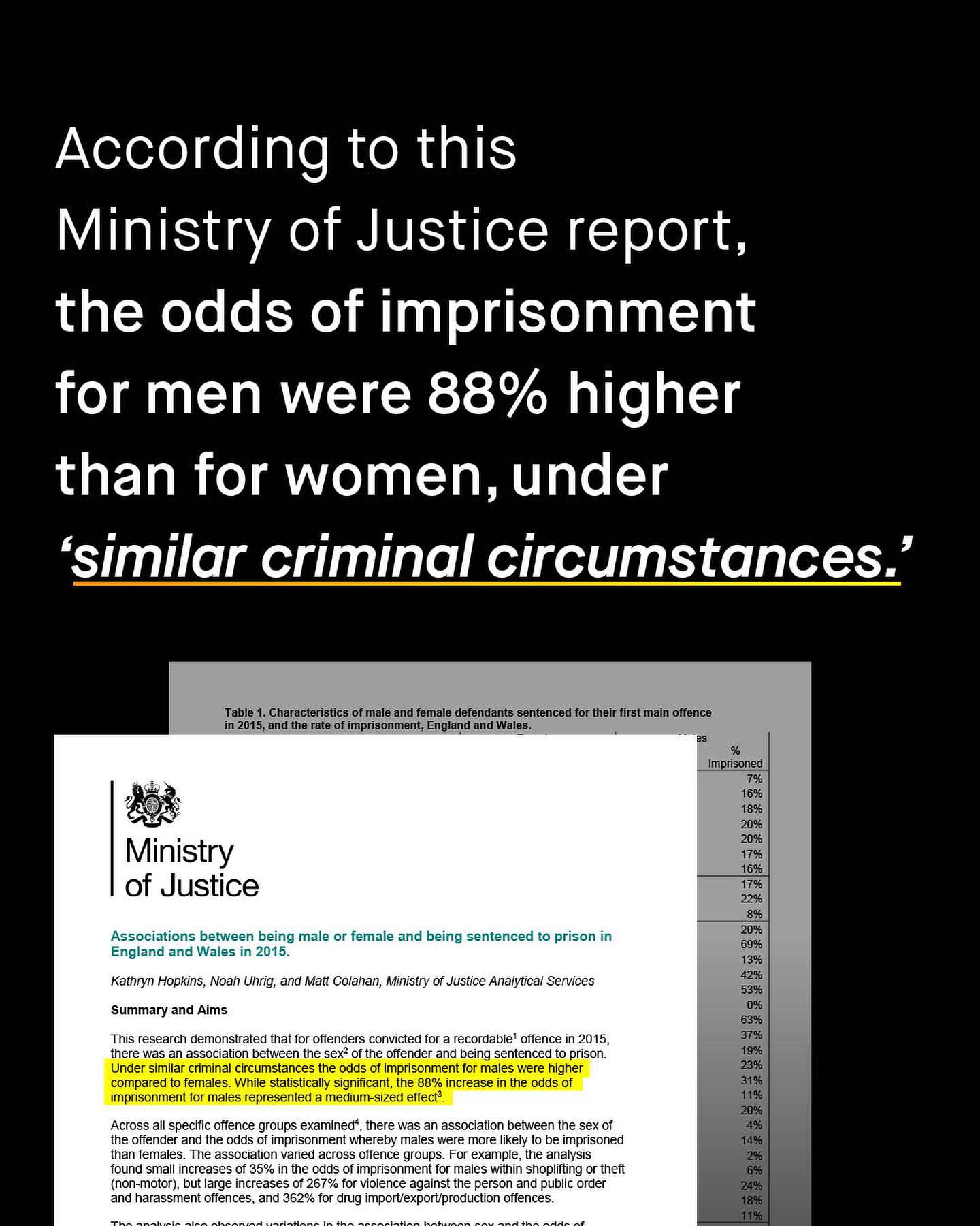 Sorry lads. Sometimes, to some people, to be a man, is to be born into guilt. Guilty for crimes he never committed, and guilty for the actions of other men. Collectively guilty for all the world’s ills - for everyone, everywhere, and for all of time. ‘Men.’ The original sin, the evil sex, the tyrannical oppressor class; they are the ghoul under your bed, the shadow beneath the stairs, the patriarch atop the high tower. Naturally, this translates into criminal court. Where men are more likely to be imprisoned, and will receive longer sentences if they are, even when committing the same crime as a woman… and doubly so for black men. Yes. Longer sentences, for the same crime. More likely to be incarcerated, under similar criminal circumstances. I believe they call that ‘systemic sexism’, or ‘institutional sexism’, take your pick, it needn’t matter, as I hear such things against men “don’t exist”. But the facts don’t lie. Equally criminal women are seen as less culpable, less dangerous, and less deserving of punishment (especially when the victim is a man), and so women are therefore treated with more leniency. It is the invisible and benevolent privilege of being seen as inherently innocent. Whilst if women are to be found guilty, her actions will likely be seen as “forced”, and probably by a man. So, whilst men are made accountable for the crimes of others, many women aren’t even seen as responsible for their own. And for some that still isn’t enough. Many are calling to close women’s prisons altogether - for what use is a prison for the innocent gender, and society’s perpetual victim? So how have we arrived here? And will we ever utter the forbidden words “systemic sexism against men?” What do you think? ~ Ministry of Justice Professor Spohn Gender Sentencing Bias Racial Sentencing Bias Images by Diego Gonzarlez, Andrea Serrano, Kelly Sikkema, Lucas Gouvea and Gradienta.