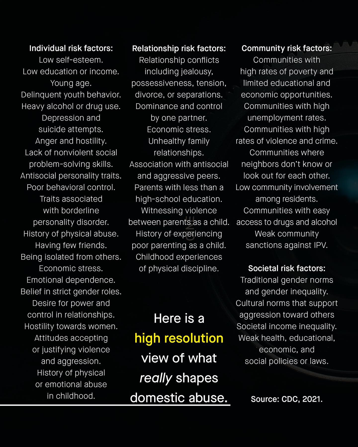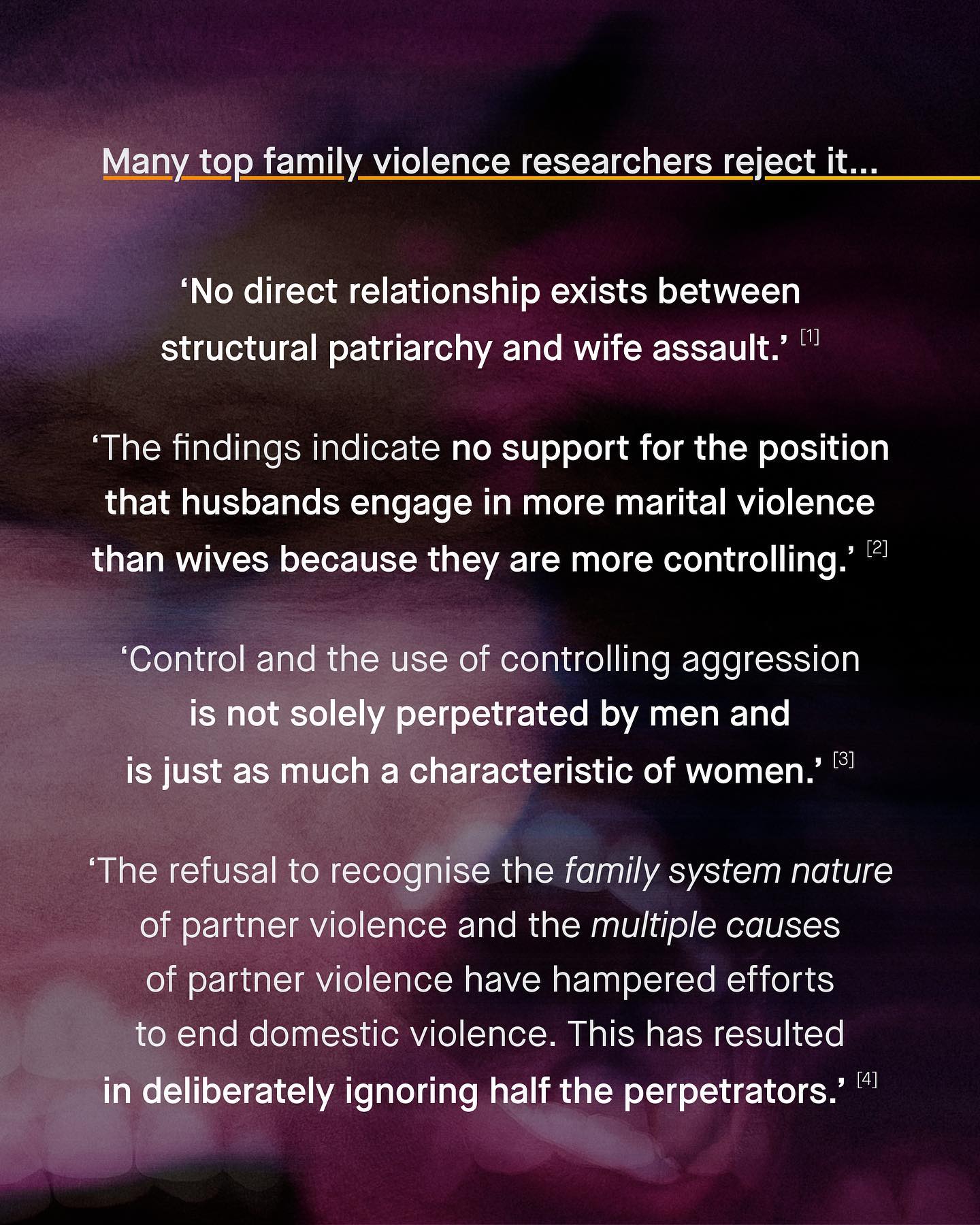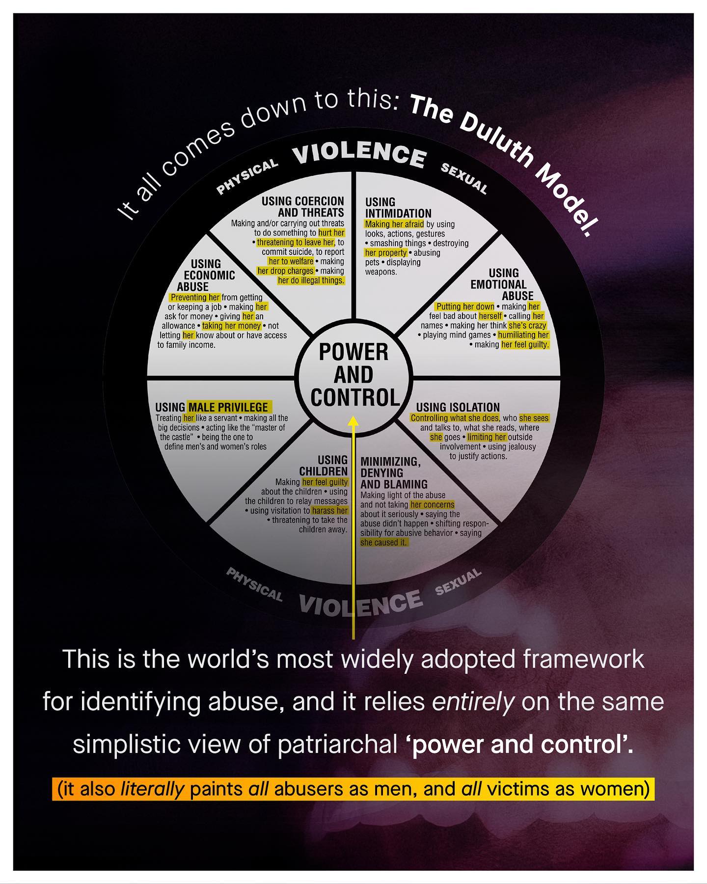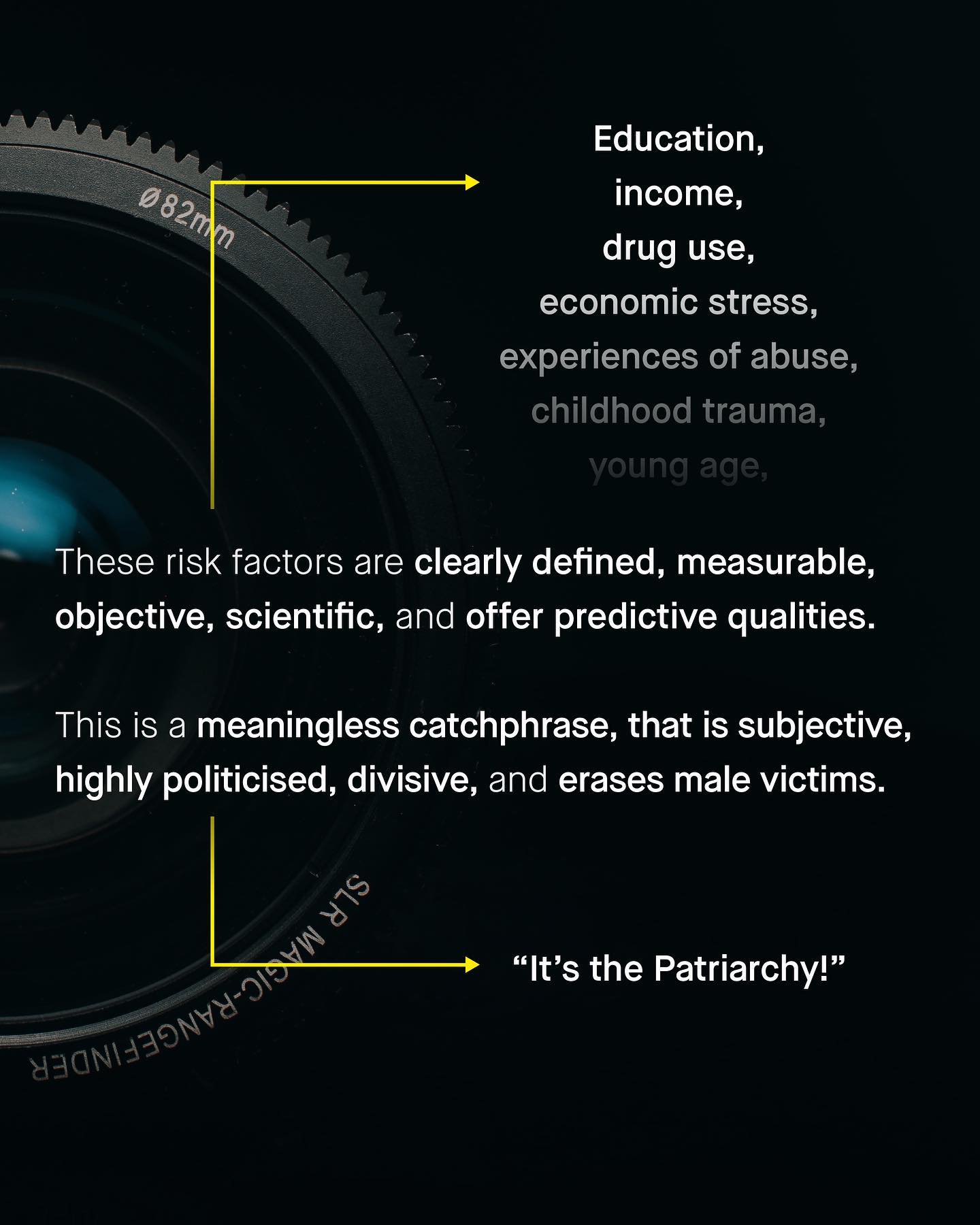 There is little harm in a bunch of social media whinos parroting on about ‘patriarchy x, y, and z’, in comment sections. Sure the concept is flawed, is inherently anti-male and needlessly divisive, but luckily those yelling about it online don’t matter that much, and nobody is really listening. But it doesn’t end there. As the problem with ‘patriarchy theory’ becomes more serious when it is used in reality; to meddle in politics, poison discourse, and interfere with complex societal issues, to ultimately impact millions. Most of all we see this in domestic violence. Yup, as a societal issue, domestic violence is the poster child for ‘the patriarchy’. Seen as the literal manifestation of the oppression of women, DV is men’s patriarchal violence, power and control made real. Such a simplistic and cartoonish idea is the bedrock of how domestic violence organisations are run and funded, how research is conducted, and it decides who they support… or don’t. No, we are no longer in the comment section, and the consequences are more than just hurt feelings. For like trying to see a intricate tapestry through a key hole, ‘patriarchy theories’ narrow, and frustratingly simplistic world view obscures more than it reveals. Such needless politicisation leads to the total erasure of both male victims, and female perpetrators of abuse. And yes, to put a name to it – we’re talking about The Duluth Model. Duluth is the single most influential model of domestic abuse in the world, forged by feminists hands in the fires of Mount Outrage, it genders the narrative, to paint all abusers as men, and all victims as women. Simple. Again. And equally useless. So, is it time for a higher resolution, more inclusive, evidence based, and rational discussion around what shapes domestic abuse? What do you think? ~ Images Marc Clinton Fabiano, Ray Zhou, Nsey Benajah, Chris Hardy, and Marcos Paulo Prado. [1] [2] [3] [4] CDC Risk Factors Ellen Pence #domesticviolence #domesticabuse #malesurvivors