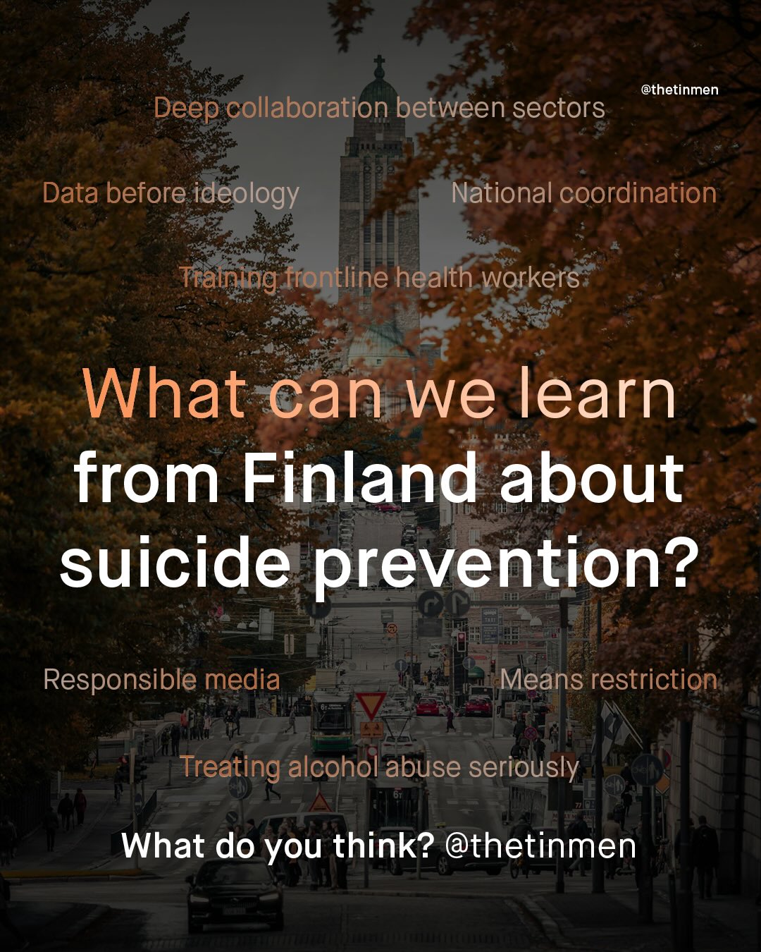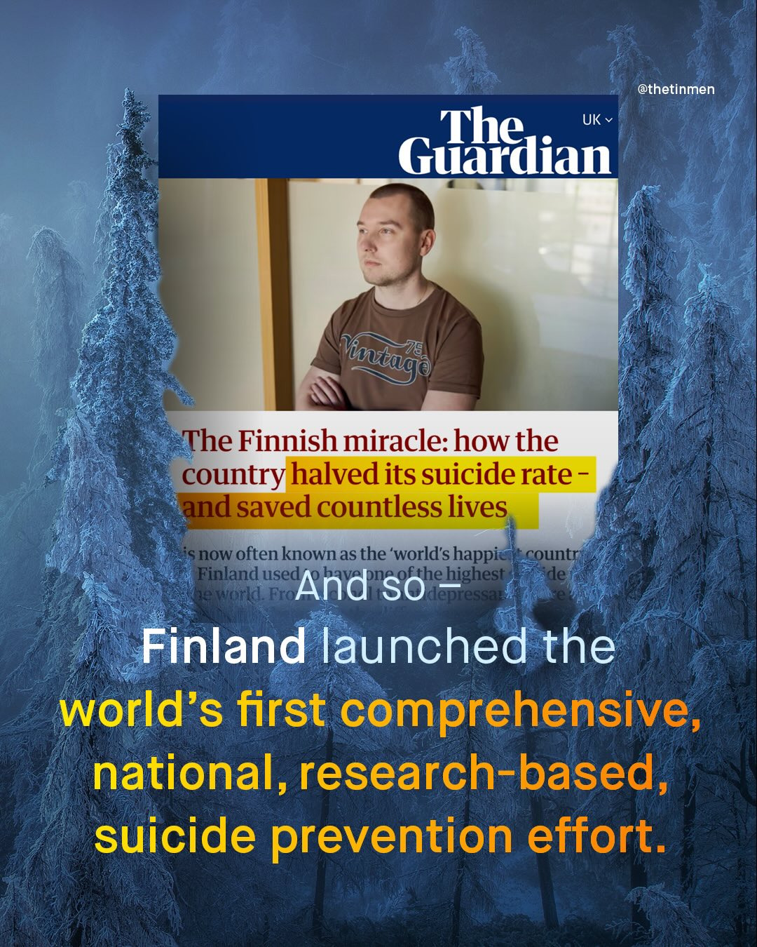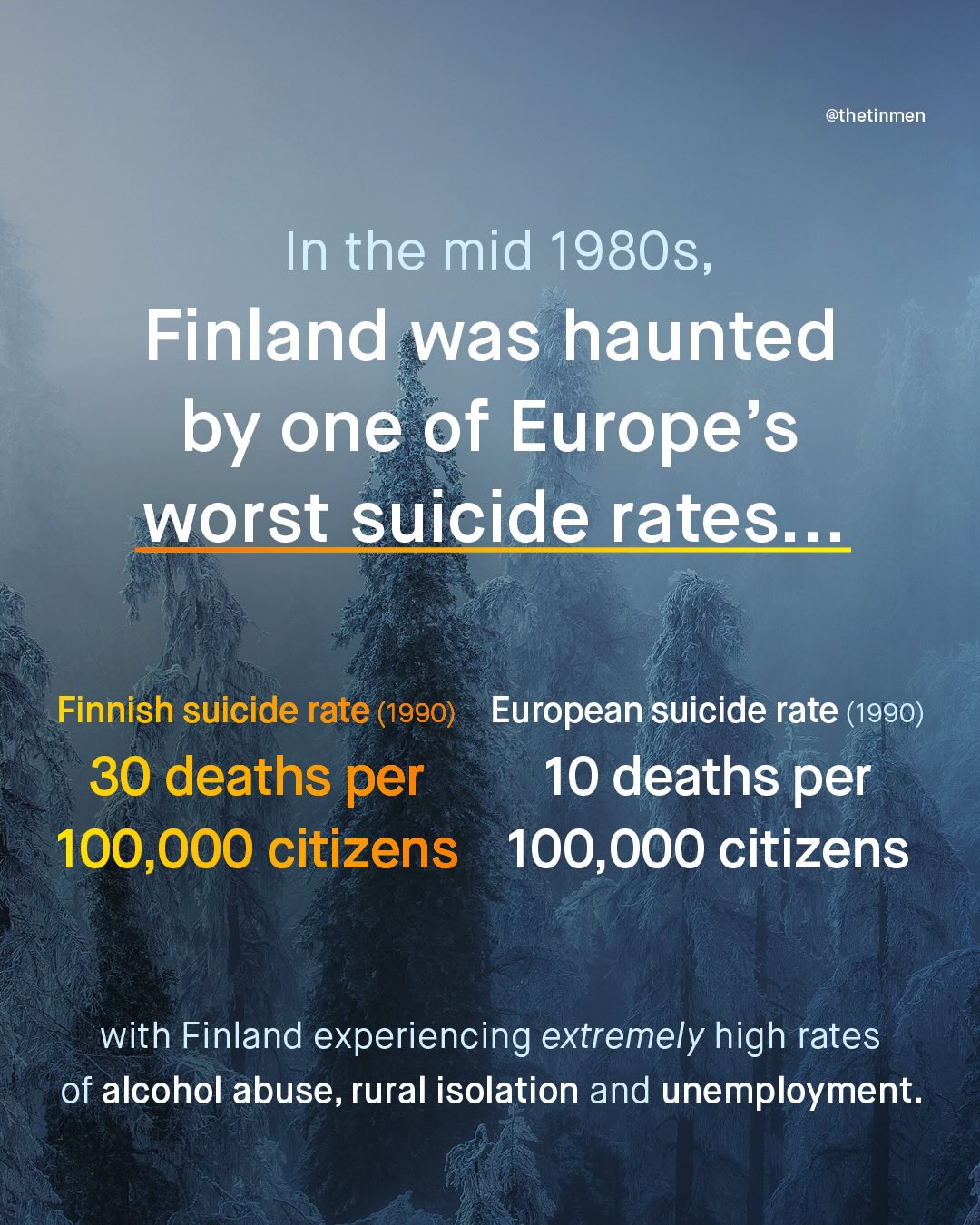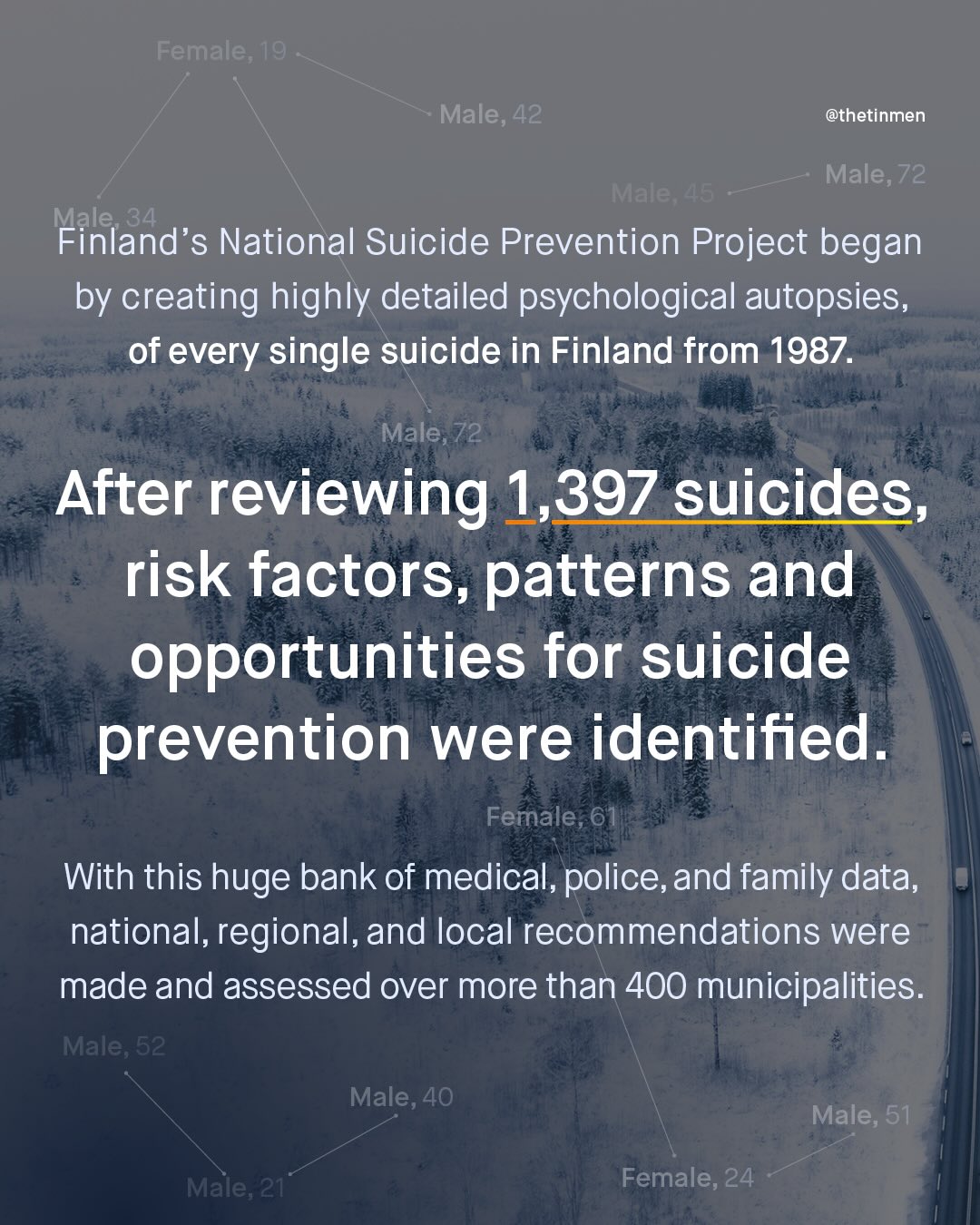 In the 80s, Finland was experiencing some of the world’s worst suicide rates. However, unlike other countries, Finland didn’t bury its head in the sand, in fact, they did the opposite. What followed, starting in 1986, was an enormous national suicide prevention project, that has since more than halved Finland’s suicide rate. Their heroic effort to save these lives, was not of small scale, and required cross-sector collaboration between public services, schools, health providers, the military, and the church; with bespoke, innovative recommendations implemented and evaluated across more than 400 municipalities. Square one started with a highly detailed analysis of the problem, using in-depth medical records, police data, family interviews, toxicology reports, and psychiatric evaluations to conduct ‘psychological autopsies’ of every single suicide that occurred in Finland in 1987… all 1,397 of them. And so, armed with such data, the effort began. Media guidelines around suicide reporting were issued, life-saving education was rolled into schools, GP approaches to mental health diagnoses and treatment were torn up and re-written, and national campaigns to destigmatise suicide, alcohol abuse, and help-seeking were broadcast across the country. At risk groups were identified and targeted, front line health workers retrained, and specific laws, largely around gun control, were introduced. The implementation began in 1990, and soon the numbers began to waver, dropping from 30 suicides per 100,000 in 1990, to 25 suicides per 100,000 in 1995. Then they started to tumble, right down to 13.5 per 100,000 in the present day. And so, through saving countless lives, what Finland taught the world, was that nothing changes, until everything changes. There are no quick fixes, short cuts, or silver bullets; the epidemic of suicide demands systemic, nationwide change, at a fundamental level. The question now is, will other nations follow in their footsteps? What do you think?