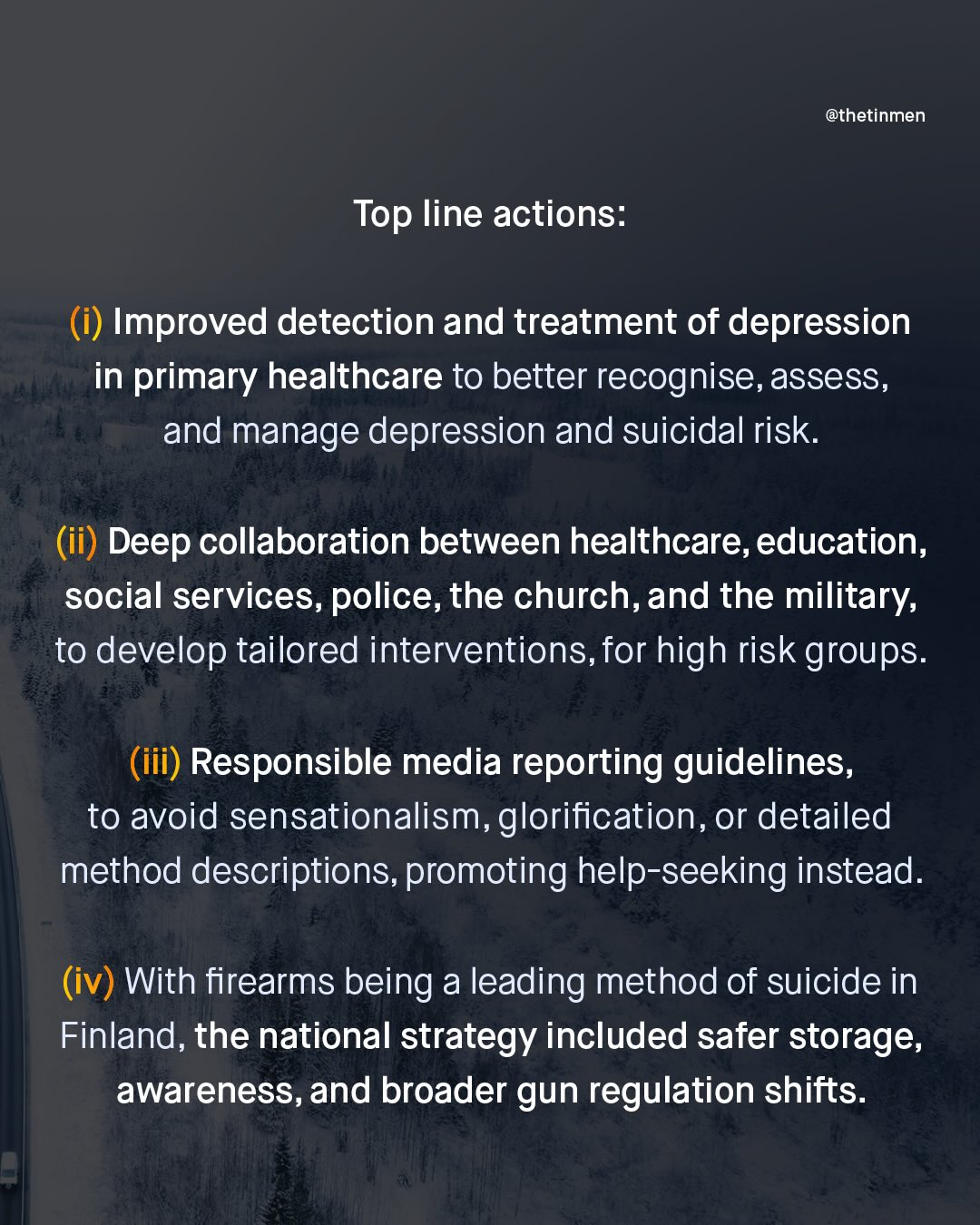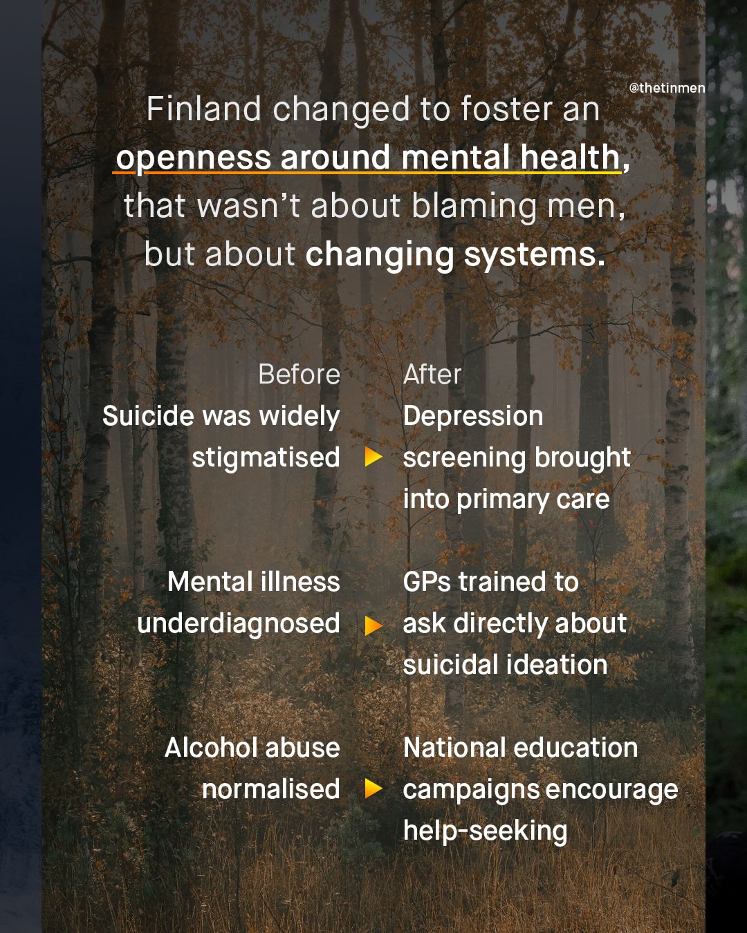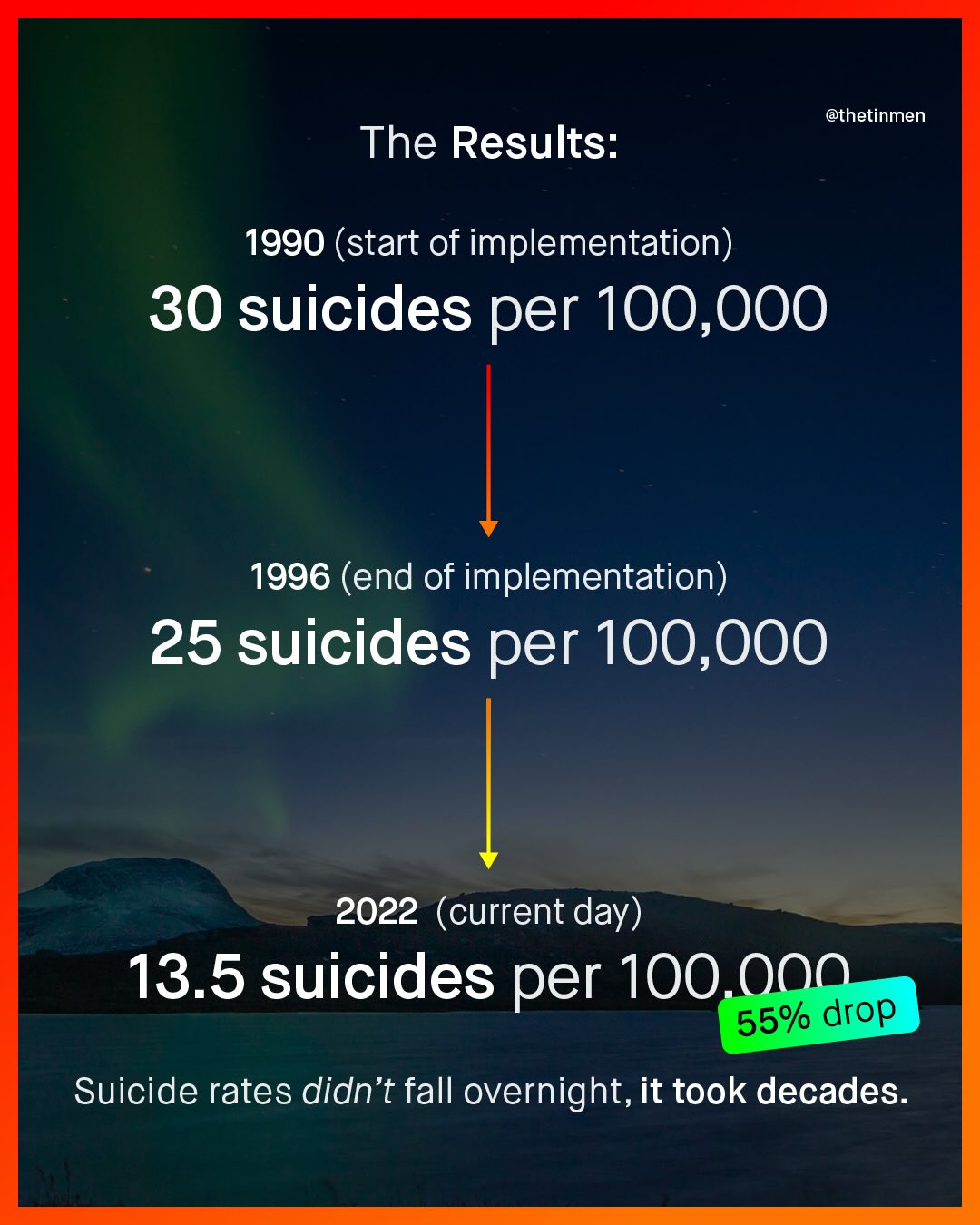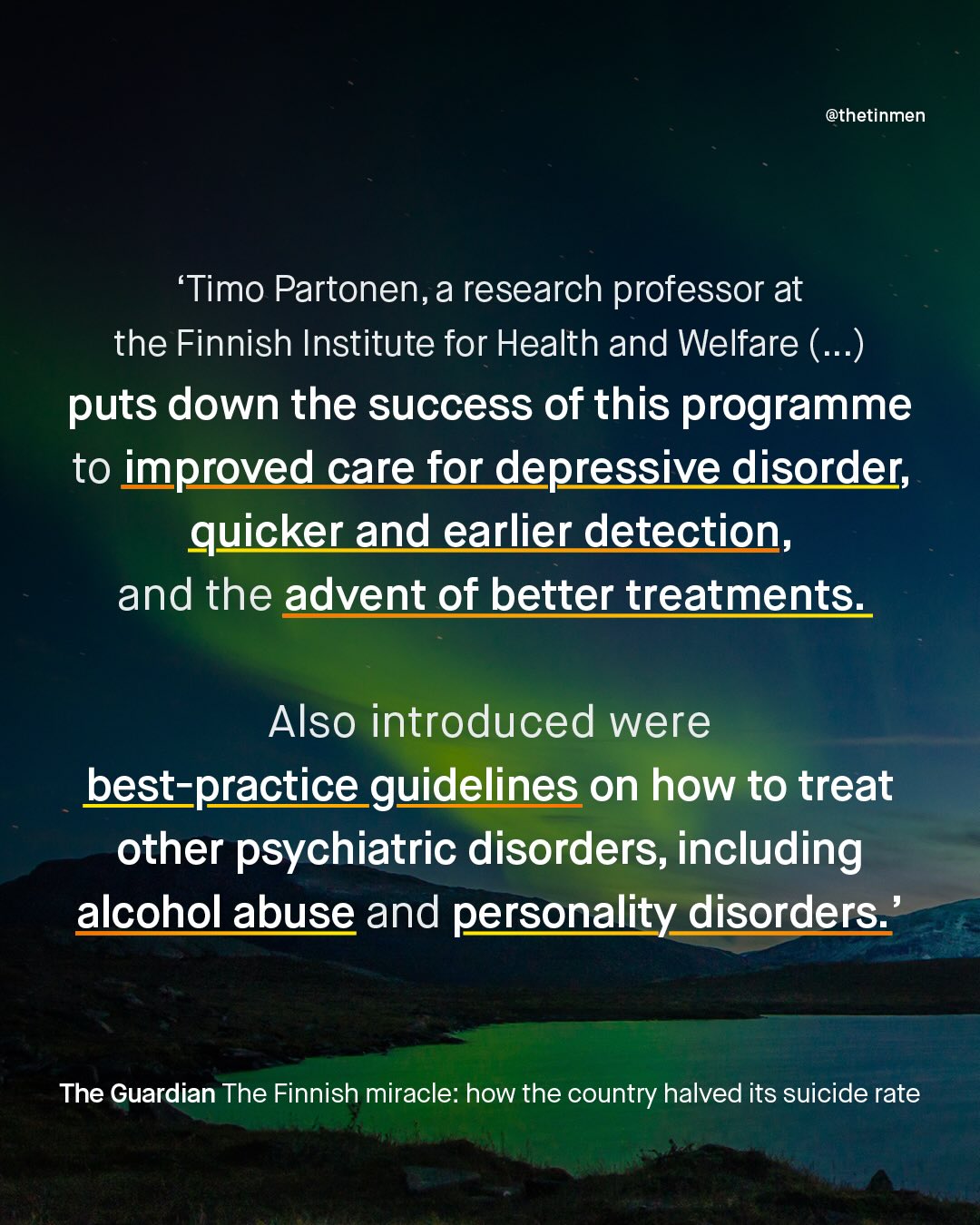In the 80s, Finland was experiencing some of the world’s worst suicide rates. However, unlike other countries, Finland didn’t bury its head in the sand, in fact, they did the opposite. What followed, starting in 1986, was an enormous national suicide prevention project, that has since more than halved Finland’s suicide rate. Their heroic effort to save these lives, was not of small scale, and required cross-sector collaboration between public services, schools, health providers, the military, and the church; with bespoke, innovative recommendations implemented and evaluated across more than 400 municipalities. Square one started with a highly detailed analysis of the problem, using in-depth medical records, police data, family interviews, toxicology reports, and psychiatric evaluations to conduct ‘psychological autopsies’ of every single suicide that occurred in Finland in 1987… all 1,397 of them. And so, armed with such data, the effort began. Media guidelines around suicide reporting were issued, life-saving education was rolled into schools, GP approaches to mental health diagnoses and treatment were torn up and re-written, and national campaigns to destigmatise suicide, alcohol abuse, and help-seeking were broadcast across the country. At risk groups were identified and targeted, front line health workers retrained, and specific laws, largely around gun control, were introduced. The implementation began in 1990, and soon the numbers began to waver, dropping from 30 suicides per 100,000 in 1990, to 25 suicides per 100,000 in 1995. Then they started to tumble, right down to 13.5 per 100,000 in the present day. And so, through saving countless lives, what Finland taught the world, was that nothing changes, until everything changes. There are no quick fixes, short cuts, or silver bullets; the epidemic of suicide demands systemic, nationwide change, at a fundamental level. The question now is, will other nations follow in their footsteps? What do you think?