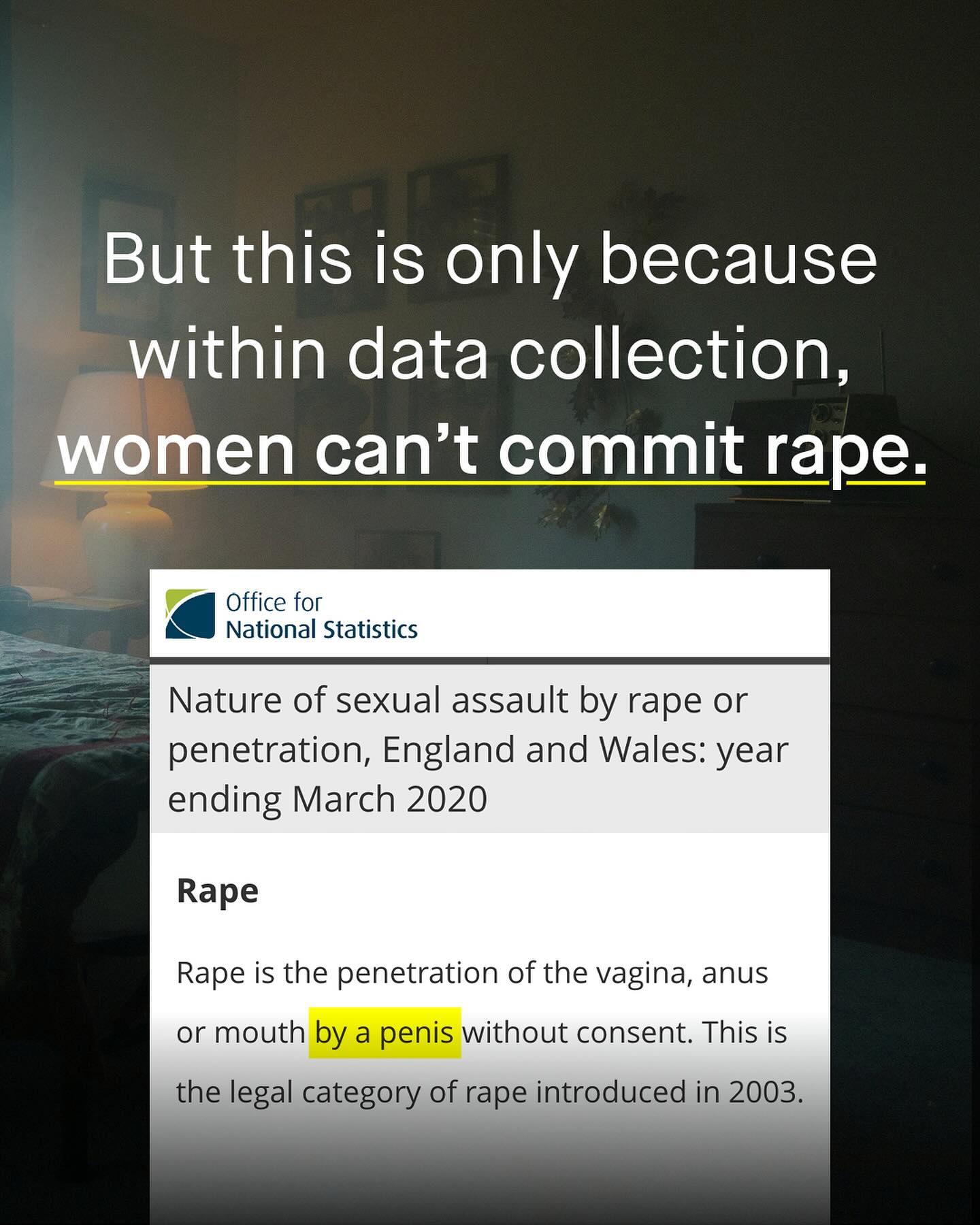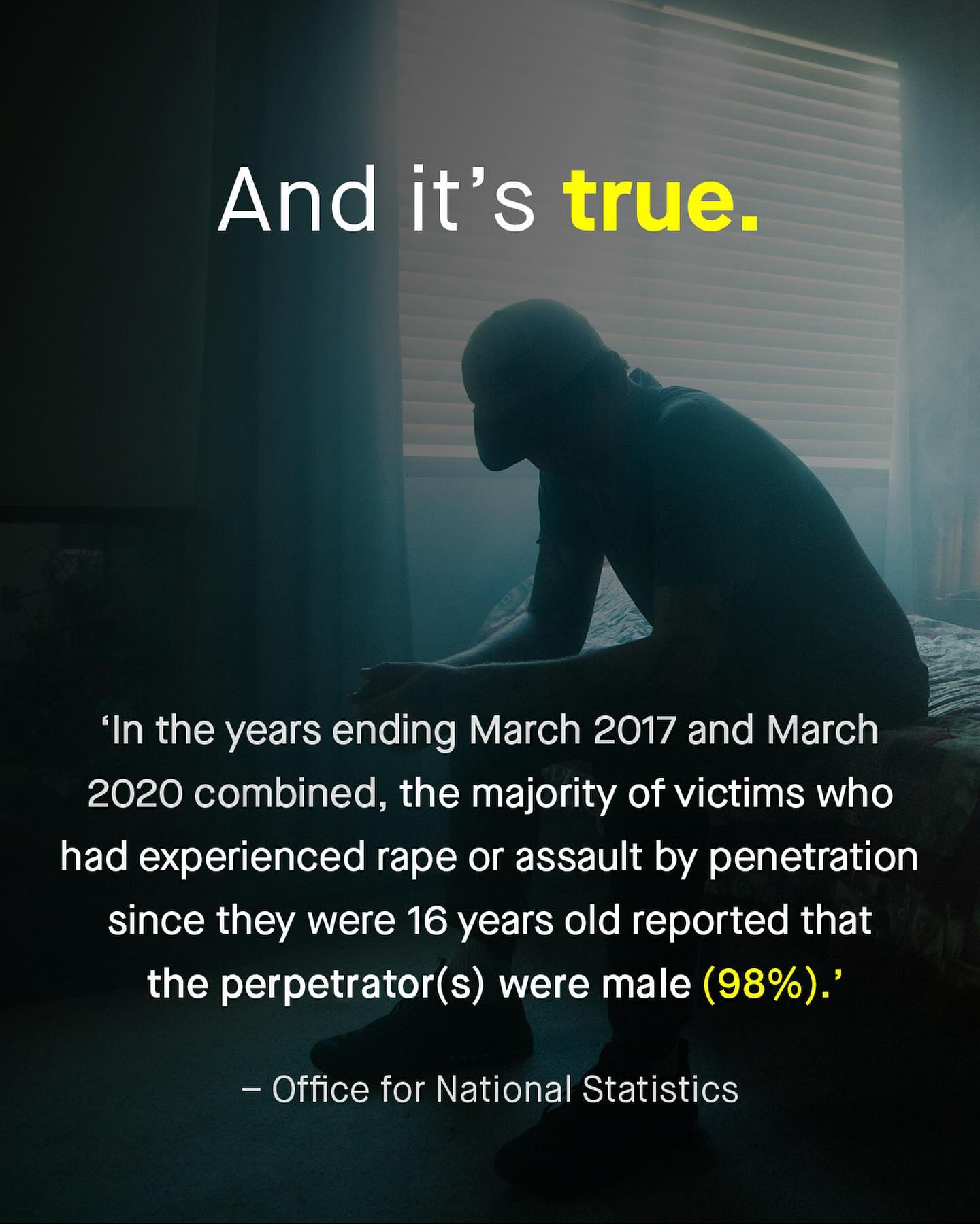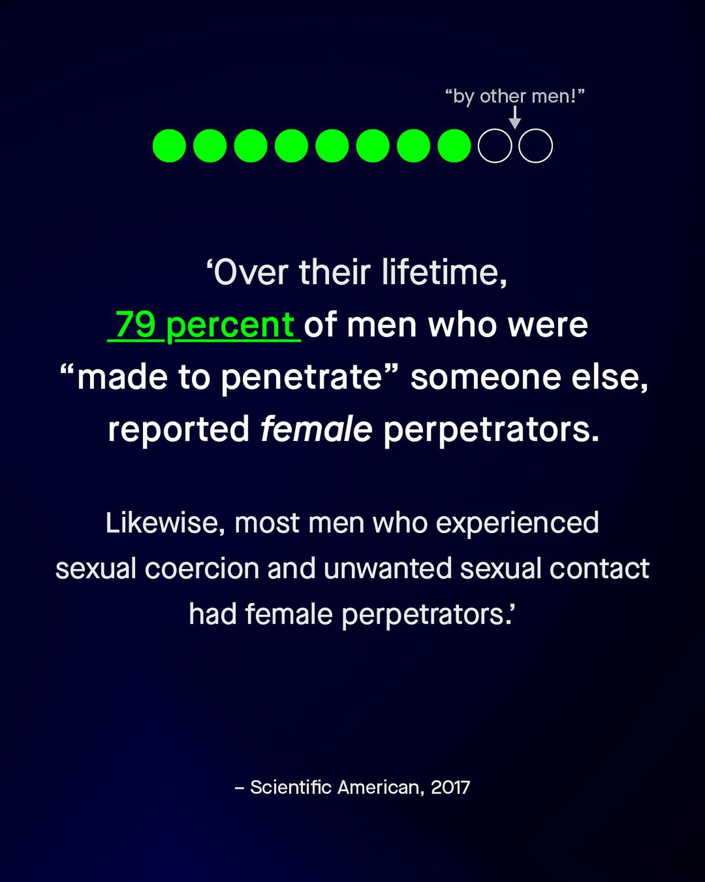 The conversation of sexual violence continues to be had in misleading, and incomplete ways. Within it, you’ll often see thrown around facts claiming that “99%” or even “100%” of r*psts are men. We’ve all had the alarming diagrams thrust into our face. That giant wedge of the sexual violence pie chart, labelled ‘male perpetrators’, with a tiny, almost imperceptible slither allocated to females. And so in lieu of such terrifying stats, understandably, ‘r*pe’ becomes an issue that is seen as almost exclusively done by men. But whilst the finer details of such claims can change, one thing remains the same – they never mention the fact that within academia, data collection, and even by law, women cannot even commit rape. That’s right. Nothing she does will make her appear in that statistic. She can do whatever she likes, to whoever she wants, in whatever manner she chooses, and it will not be classed as ‘r*pe’. For to commit ‘r*pe’, the perpetrator must have a penis. So yes, saying ’99% of rapists are men’, is not so different to saying ’99% of people who get kicked in the balls’ are men. But alas, you won’t see such context within the angry yells and explosions of social justice rhetoric. Luckily things have started to change. In America, which previously shared this highly gendered definition of ‘r*pe’, the CDC has begun capturing a broader, and gender neutral picture of sexual violence. One that adds a few new slices to that pie chart, and ones you’ll likely have never seen before. This new high definition insight into sexual violence is not as popular as the infamous ’99% men’ one; but it’s far more accurate, more useful, and more inclusive. So let’s take a look, and ask, how have our sexual violence ‘experts’ been hiding the truth? And where can we do better? What do you think? ~ NISVS  ONS Scientific American  Images by Nick Hillier, Codioful and Jakob Owens #mensmentalhealth #sa #fyp #malesuicideawareness