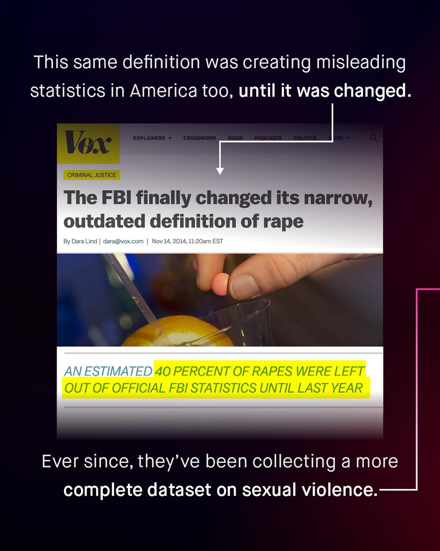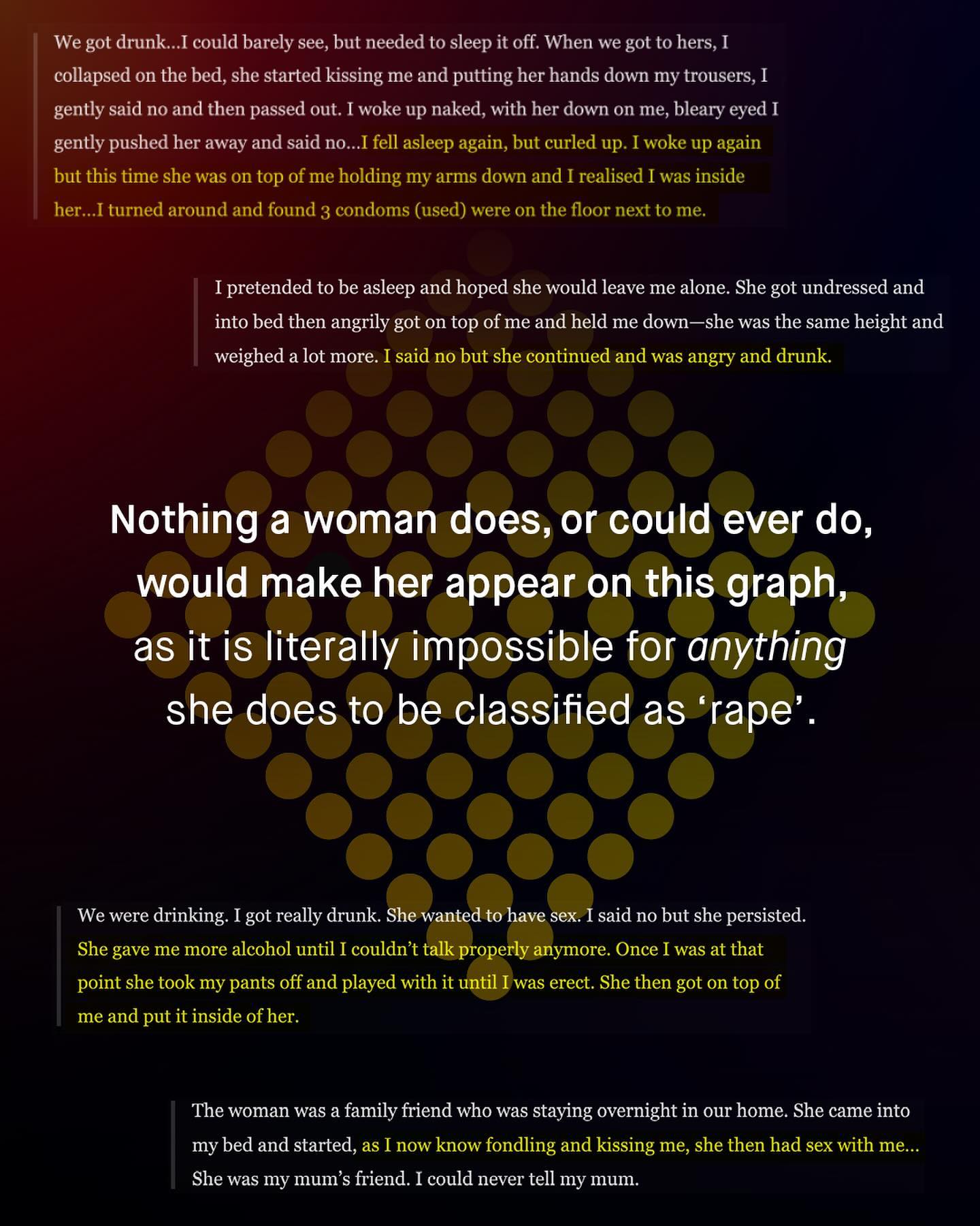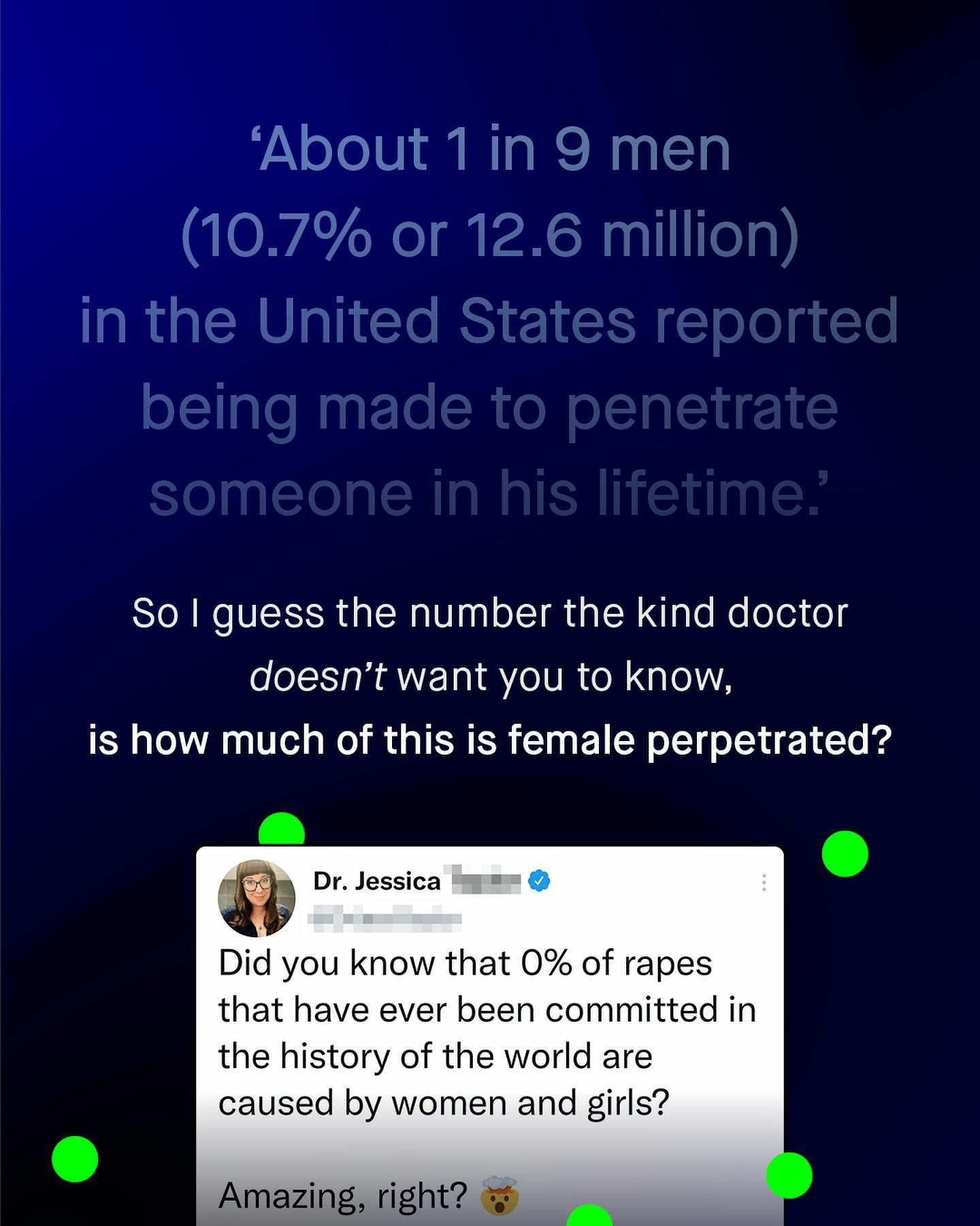 The conversation of sexual violence continues to be had in misleading, and incomplete ways. Within it, you’ll often see thrown around facts claiming that “99%” or even “100%” of r*psts are men. We’ve all had the alarming diagrams thrust into our face. That giant wedge of the sexual violence pie chart, labelled ‘male perpetrators’, with a tiny, almost imperceptible slither allocated to females. And so in lieu of such terrifying stats, understandably, ‘r*pe’ becomes an issue that is seen as almost exclusively done by men. But whilst the finer details of such claims can change, one thing remains the same – they never mention the fact that within academia, data collection, and even by law, women cannot even commit rape. That’s right. Nothing she does will make her appear in that statistic. She can do whatever she likes, to whoever she wants, in whatever manner she chooses, and it will not be classed as ‘r*pe’. For to commit ‘r*pe’, the perpetrator must have a penis. So yes, saying ’99% of rapists are men’, is not so different to saying ’99% of people who get kicked in the balls’ are men. But alas, you won’t see such context within the angry yells and explosions of social justice rhetoric. Luckily things have started to change. In America, which previously shared this highly gendered definition of ‘r*pe’, the CDC has begun capturing a broader, and gender neutral picture of sexual violence. One that adds a few new slices to that pie chart, and ones you’ll likely have never seen before. This new high definition insight into sexual violence is not as popular as the infamous ’99% men’ one; but it’s far more accurate, more useful, and more inclusive. So let’s take a look, and ask, how have our sexual violence ‘experts’ been hiding the truth? And where can we do better? What do you think? ~ NISVS  ONS Scientific American  Images by Nick Hillier, Codioful and Jakob Owens #mensmentalhealth #sa #fyp #malesuicideawareness