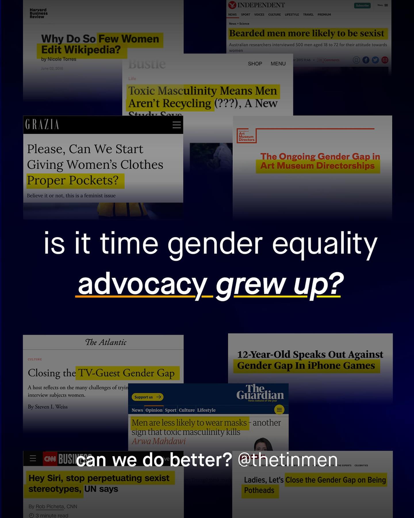 Like so many areas of social media, the conversation of gender equality has fallen down a rabbit hole of juvenile bickering, pedantry, and cringey catchphrases most appropriate for playground bullies. The war drum of the self-righteous beats on. Once a noble movement, steadfast in securing women’s financial freedom, their right to vote and work, their bodily integrity, and other non-negotiable rights, each essential for women to be seen as fully autonomous humans… The baton has since been passed to an army of terminally-online social-media-nit-wits, narcissists, and overgrown babies, who have lost sight of their own priorities, and turned the baton into a steel bat to hit men with. For many the the battle has changed too – Women don’t have enough pockets. Siri is misogynistic. Are bearded men more sexist? I’m not saying such issues should be ignored; but over here, the boys are dying younger in every country, in every age group, are behind at every stage of western education, and the cavalry have still not arrived. But yes let’s close the gap on iPhone games. On Wikipedia editors. On pot smokers. So, whilst many advocate for equal pockets, men are left to die, fighting for the basic right just to live as long as women. Have we lost sight of our priorities? Have we ceded the steering wheel of advocacy to a corrupt captain? And what might it look like, if I were to adopt such a world view? What do you think? ~ Images by Getty, Adrian Infernus, Codioful, Arms Anthony Tran