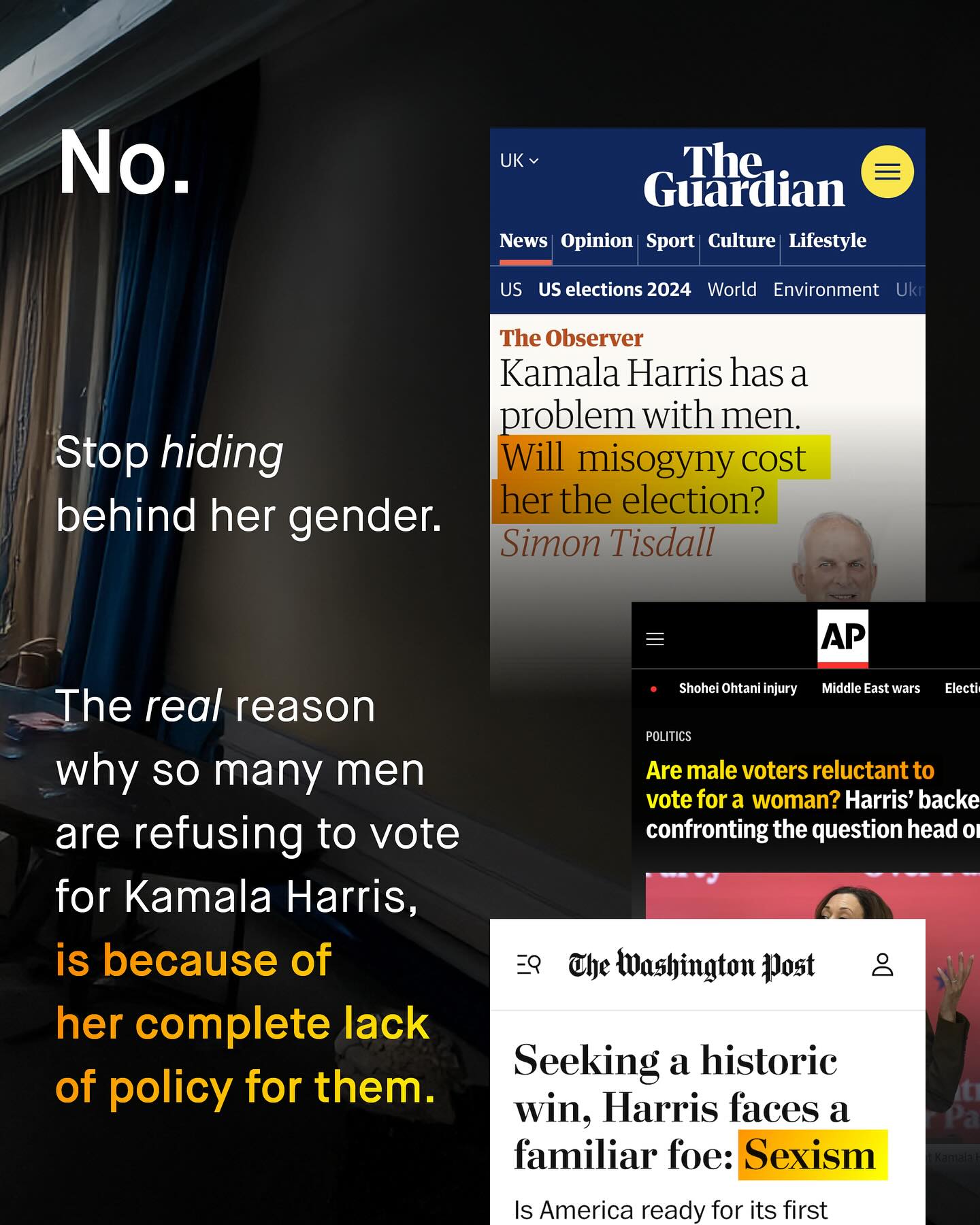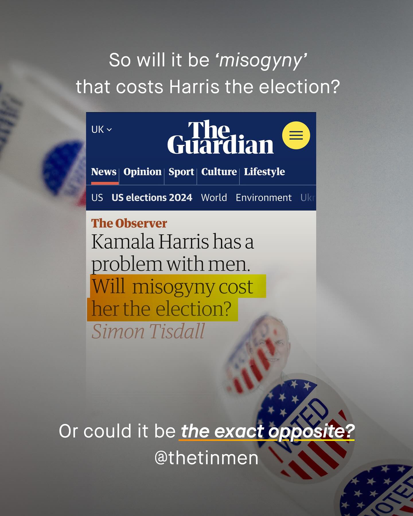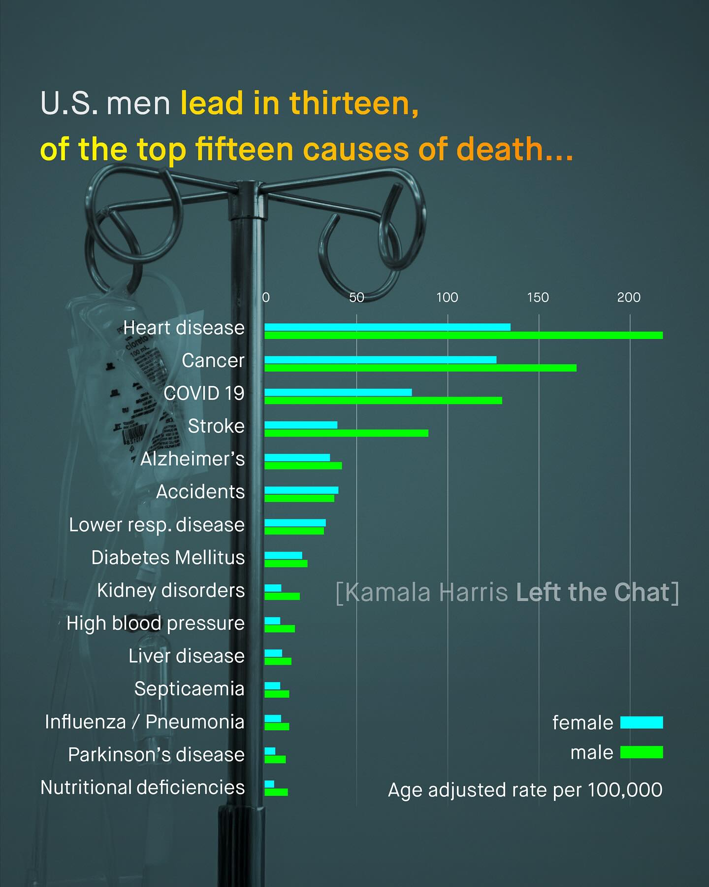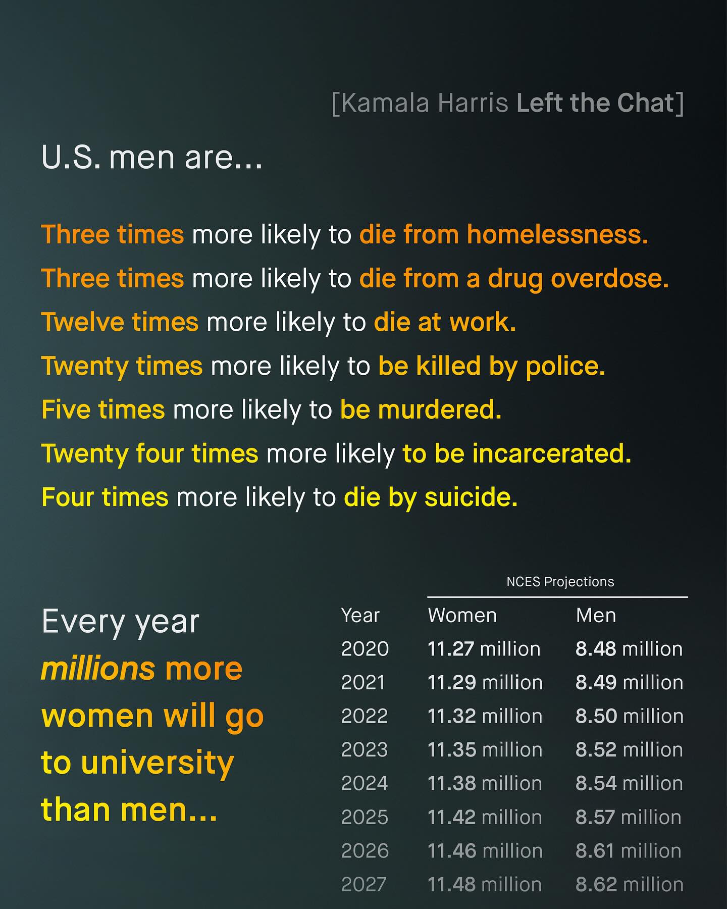 The biggest election, perhaps in our life time, is right around the corner. Not only the biggest in terms of potential impact, but also the most divided by gender. More men vote Republican than ever. And more women vote Democrat. Cards on the table – I don’t get a vote, but if I did, I would vote for Harris. But don’t get me wrong, I would not be skipping down to the voting booth, singing The Star Spangled Banner, full of excitement for what the future holds. As for Harris, I think it holds much of the same. Sadly the reason I’d vote Democrat is more to keep the other out of power, than to put her in. And no. Saying I don’t like Harris doesn’t make me a misogynist, or a racist, as the media continually tries to tell me. The reason why I am so put off by Harris, is simply because she has no policies that are directly appealing to me, or interest in the issues which I post and care so deeply about. This is not new. Nor is it an America only problem. In the UK, in the last election, it was the first time I spoiled my ballot, and I imagine it won’t be the last. And neither am I alone in feeling this way. There is a growing army of disaffected, politically homeless young men like me, who lean left, but refuse to vote along parties lines, because we feel betrayed. We are not listened to, only mocked, and branded with more insults; consequently pushed further and further into the political hinterland that is now our home. So I wonder, will this short sightedness and dogmatism cost the Democrats the election? And if it does, will it finally be the wake up call, we’ve been yelling about for so many years? What do you think? #kamala #kamalaharris #democrats #vote ~ Images by Marcelo Leal, Eduard Dezlqettd, NCES Mens Health Causes of death
