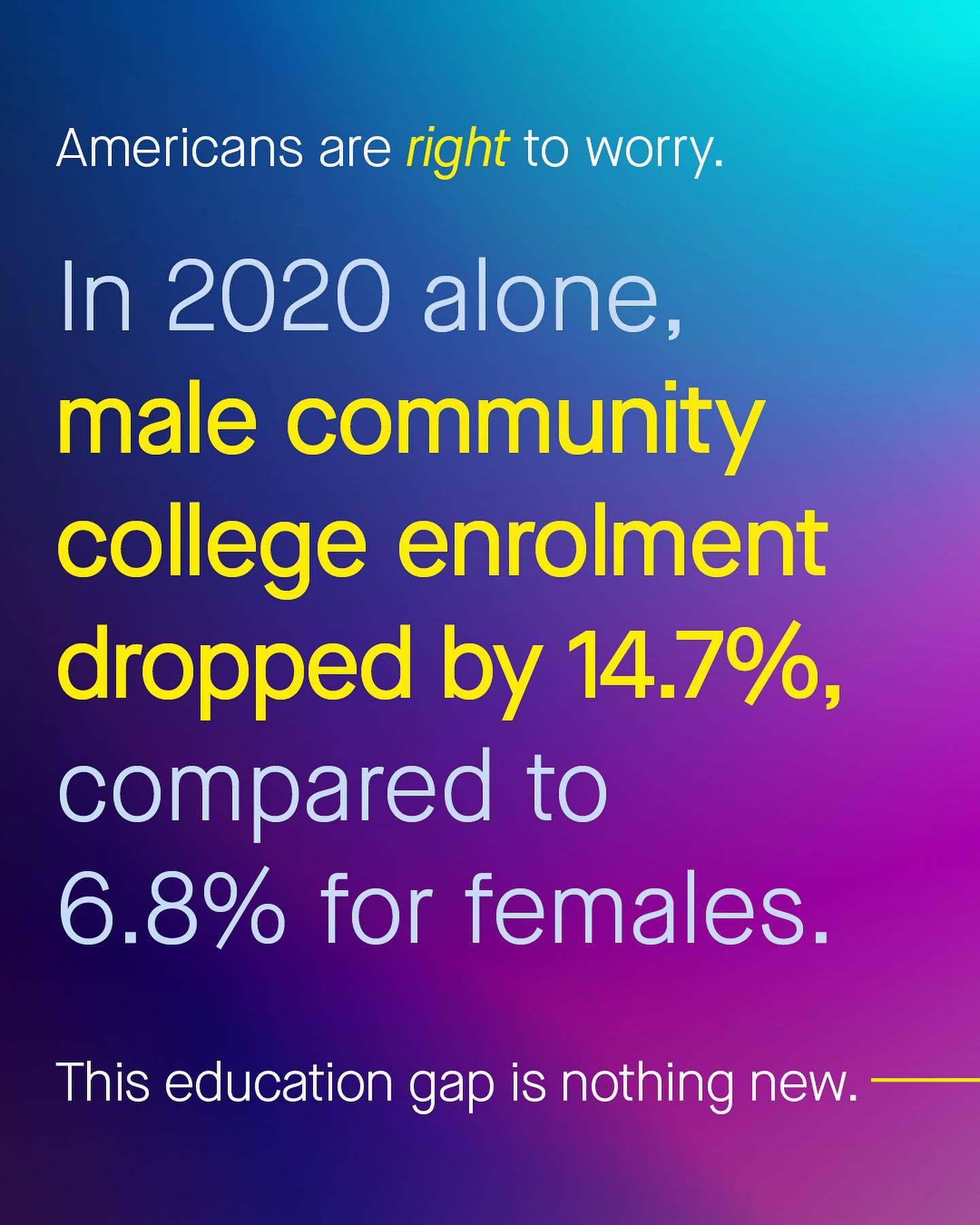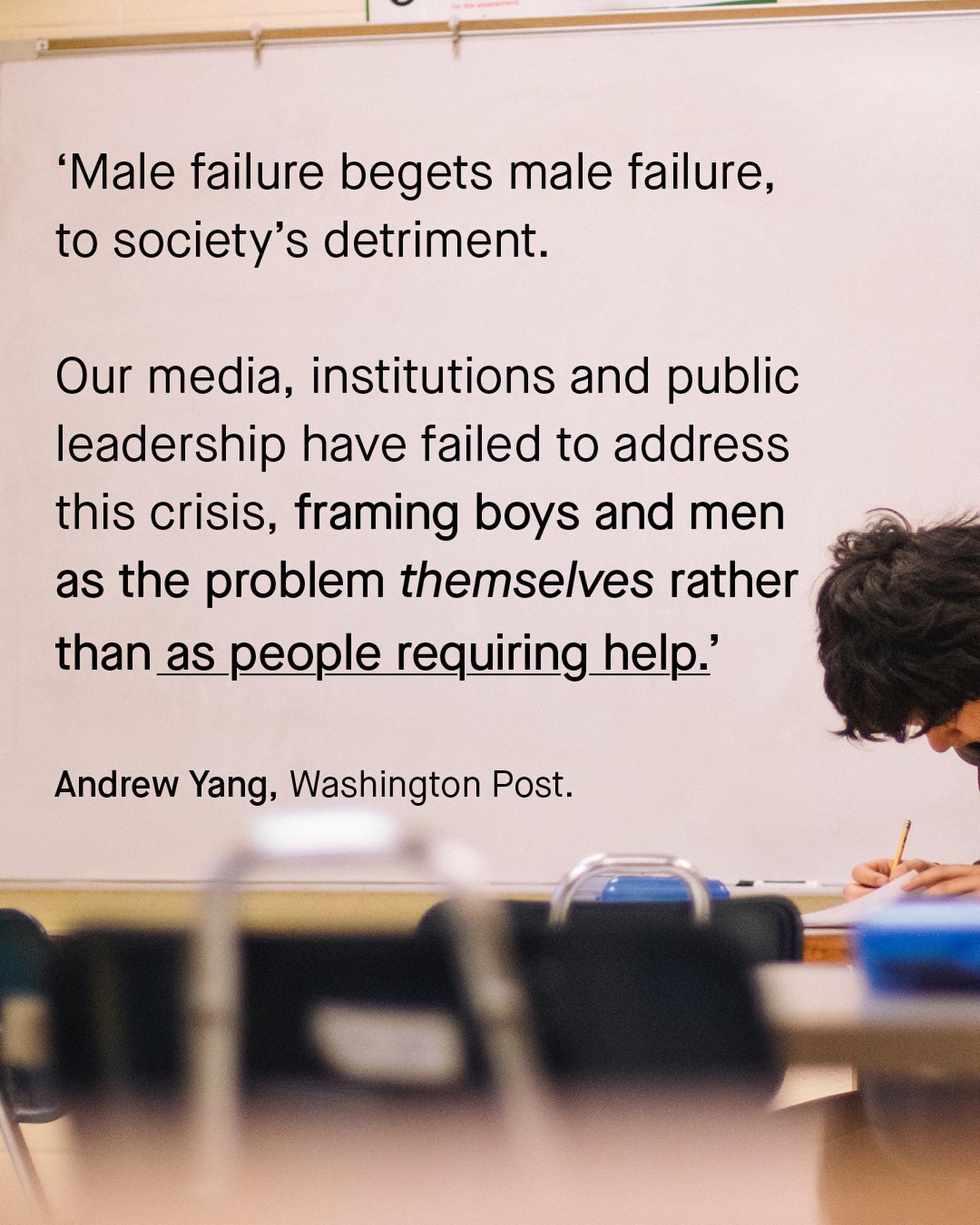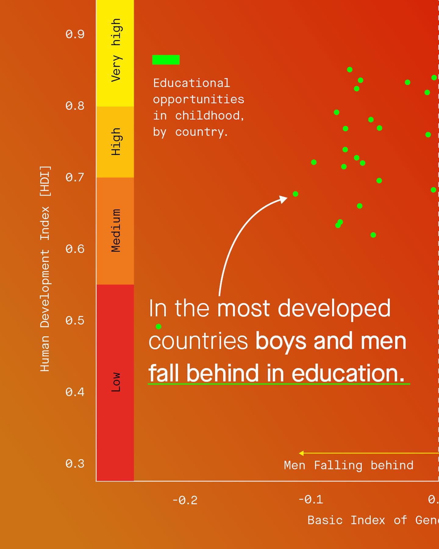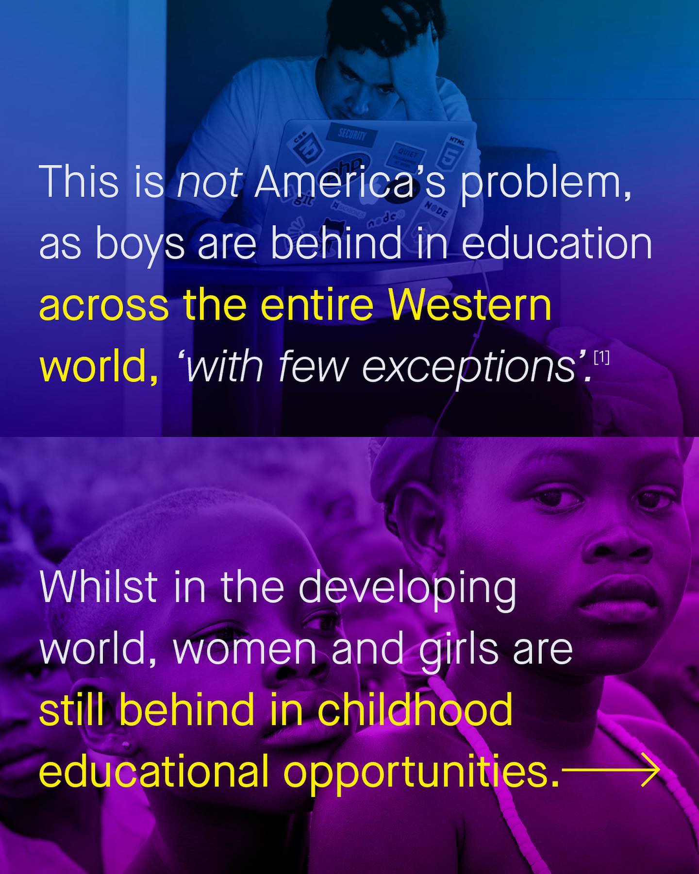 There’s a strange phenomenon that exists within global childhood educational opportunities. In the least developed nations we all know that it is women and girls who are disadvantaged in school; and work is being done to help alleviate the problem (largely around empowering reproductive control and lowering mortality rates in childbirth). But did you know, as a country moves up the developmental index, the problem flips and boys and men start to fall behind? Yes, across virtually the entire Western world, boys are behind in education, at every age group and at every stage. You won’t hear about this crisis much, but it exists none the less, and has done so for decades. It is here that we need to have two thoughts at the same time, and start to understand that boys and girls are both simultaneously disadvantaged in education, depending on where we are. But whilst this cognitive dissonance is too much for some, I do see some progress being made. So much so that public concern over boys is one of the few political stances that every body seems aligned on. Because when asked – the left, the right, women and men, all agreed, we’re more worried about our sons, than our daughters. So where is the action? ~ Source More worried about sons https://tinyurl.com/4xknnktz Enrolment drop COVID 19 https://tinyurl.com/3pxn5rvb Enrolment over time https://tinyurl.com/7fd7tkjj Basic Index of Gender Inequality https://tinyurl.com/3xkc7swu [1] https://tinyurl.com/hc36vyyn Andrew Yang https://tinyurl.com/yc2jv43r ~ Images by Dan Cristian Padure, Gradienta, Jeswin Thomas, Tim Gout and Amevi Wisdom from Unsplash.