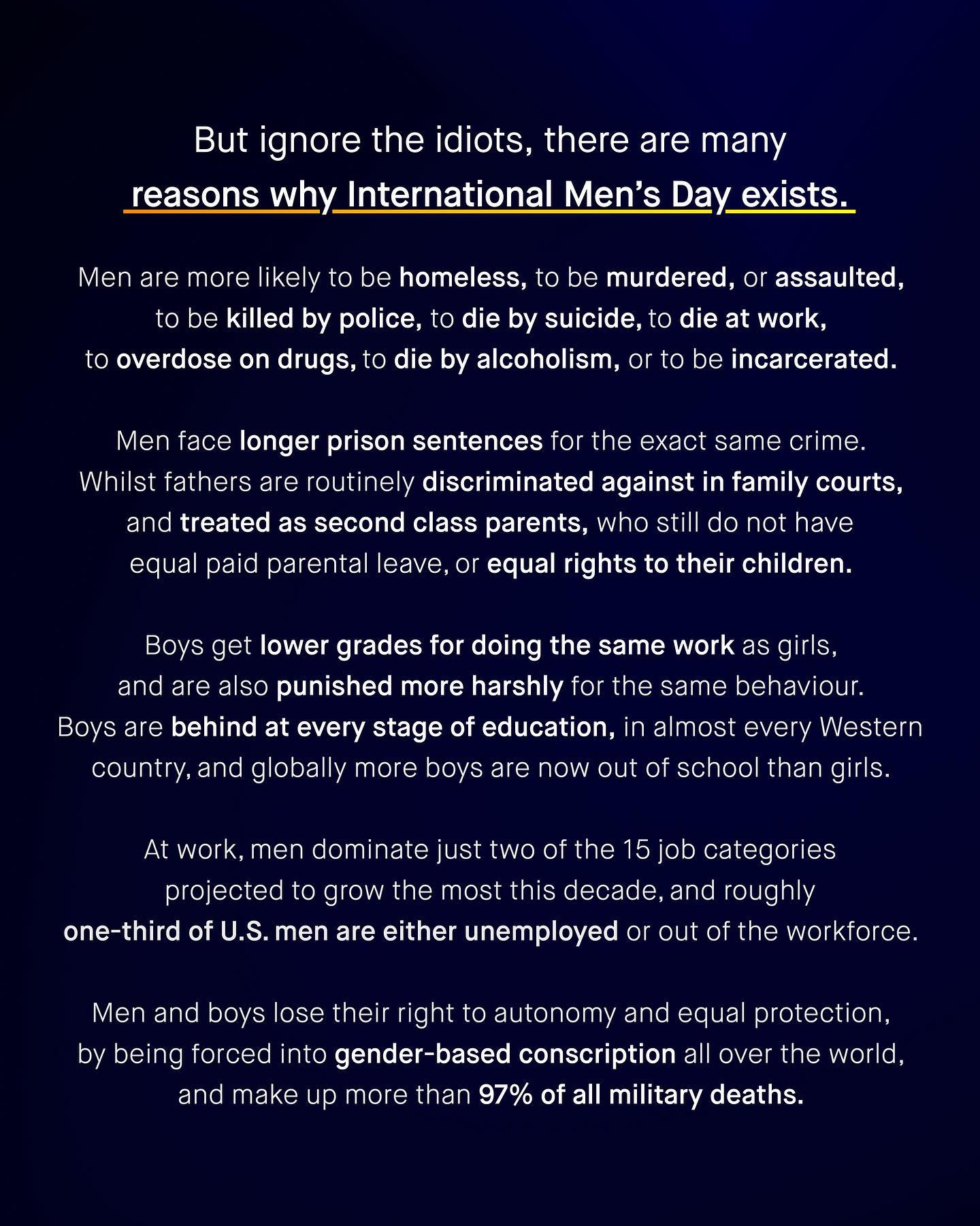 Happy #InternationalMensDay to all my fellow ‘lottery winners’. To those who have it all, in every conceivable way, who supposedly live life on ‘easy mode’, and for whom the idea of a day of thanks and awareness ‘serves no useful function’ – today is for you. Men who keep the water running, lights on, and the supermarkets full; who plough the fields, climb the scaffolding and pylons, and traverse the sewers. The men who journey into the oceans on fishing boats, who lay brick, who dig deep beneath the earth, fight fires, defend those in need, and who drive unfathomable distances, to keep society working, and their families safe and supported – Happy International Men’s Day. No doubt today you’ll hear the usual social media whinos talking about how unnecessary men are, and how the world would be ‘better off without them’; but deep down, we all know that society as we know it would come to a catastrophic and immediate halt, if such a thing were to happen. To the men who suffer in silence. To the men who have such little space to talk. To the men who are hurting, who feel lost, or lonely; you are not alone, you are valid, and we see you. I urge you to keep going, because the world needs you more than it knows, or will ever dare to admit. So look past the naysayers, look past the non-believers and bigots, look past those who are too fragile to make these acknowledgements; you do not need the validation of such lowlifes and losers. Men, you are no less important than the world’s women, and this day is for you. Always remember it is okay to be a man, or a boy, and that you are not toxic, broken, or defective. You are not oppressors, tyrants, or patriarchs. You are who you are, men, in whatever way you chose to be, and that’s all that matters. So to all the men, and those who love them, happy International Mens Day. ~ Images by Codioful, Earl Wilcox, Leira Cavia, Jason Leung, from Unsplash. #internationalmensday2023 #mensday #menaregood #malesuicideawareness #mensmentalhealth #genderequality