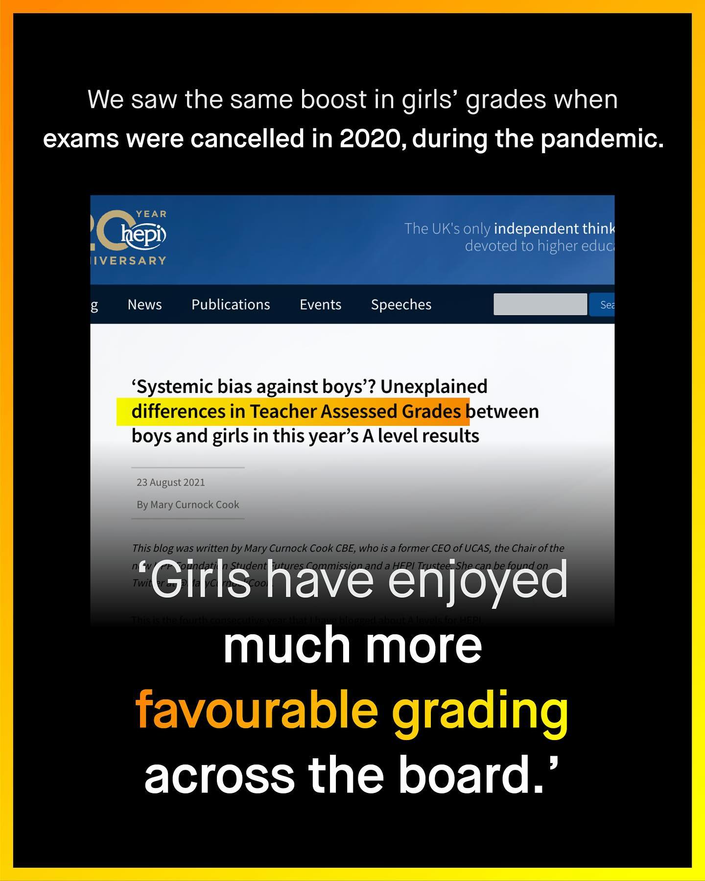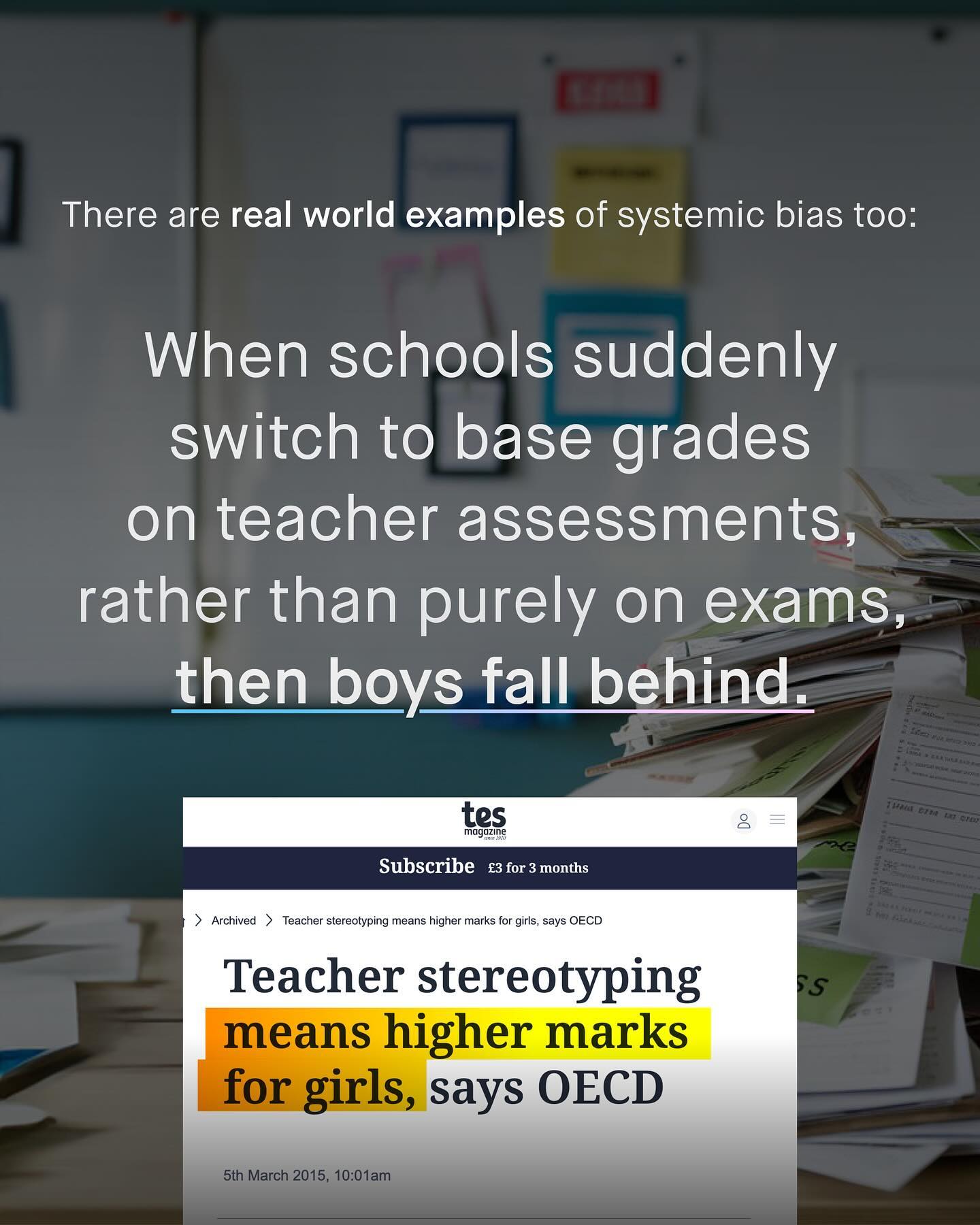 The last 50 years have seen the scrutinisation and overhaul of our workplaces to make them more accommodating to women. It’s the field of ‘systemic bias’. 80% of board directors are men, and such men, through no fault of their own, will more often design a working environment, and style of work, that is naturally more suitable to other men. Seems straightforward enough. And now; from air-conditioning, to flexible working hours, maternity leave, to more equitable toilets, changes have been made across the board, to fill in the blanks of how to better support women at work. But the job is not done. For there are other spaces and styles, that may also be systemically biased, but in the opposite way, and for the opposite reasons. If 80% of boardrooms being men leads to inequitable male working environments, then what is to be said about classrooms, where 80% of teachers are female? Is there an argument we are seeing the same phenomenon; but this time centering girls’ learning, nurturing their learning styles, and problematising boys’ so called ‘misbehaviour’. Might this bias make up a sizeable chunk of the educational attainment gap that has seen boys languishing for generations? These are important albeit unpopular questions. How can boys ever catch up with girls, if data continues to show us that they are being marked lower, for the same work? What if our educational system is biased against boys, in the same way that our workplace was bias against women… Is it time we looked inside the education gap, and at ourselves, before we wag the finger at boys for ‘not trying hard enough’? What do you think? ~ Full write up by William Collins at Empathy Gap HEPI Report by Mary Curnook Cook Images by Phillippe Bout