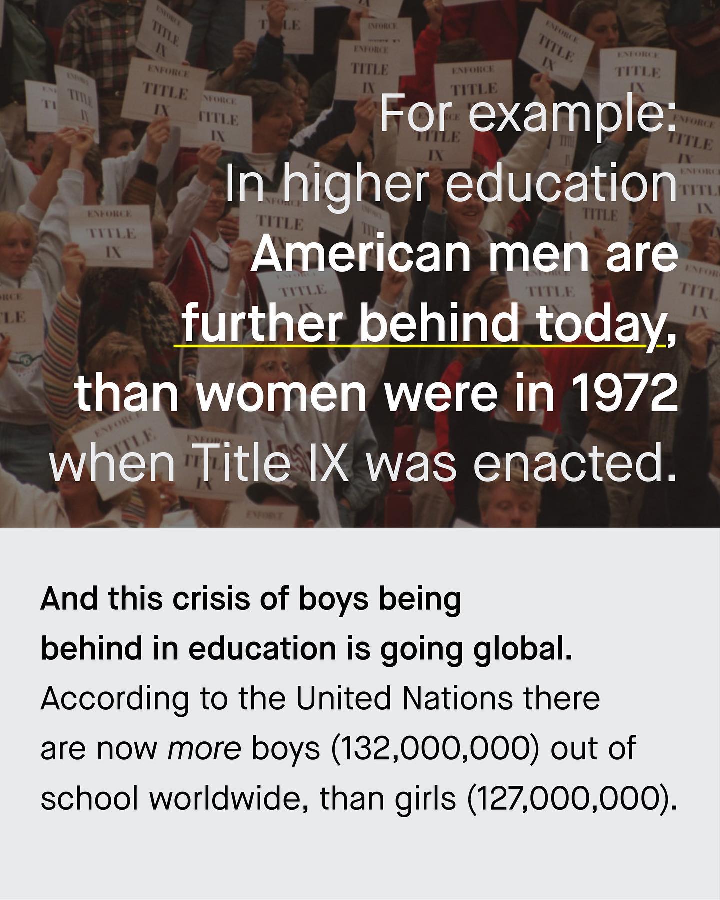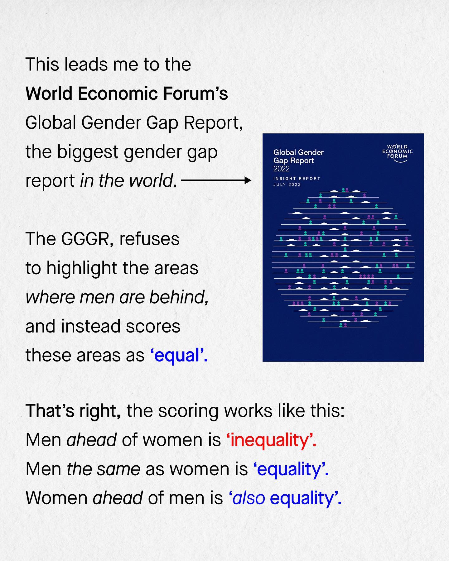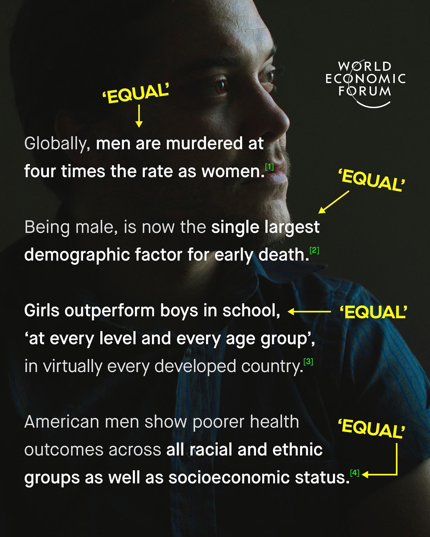 Whenever I talk about the stark disadvantages faced by men and boys, someone is quick to wave it away as some kind of ‘catching up exercise’, often involving pendulums. ‘Well men were advantaged for millennia, now it’s our turn!’ Said the sassy thirty year old, who never experienced such a society. And I gotta say – this piggy backing off of the suffering of our ancestors; who we never knew, and whose lives we never lived, has to stop. You were not there. And neither was I. So I want to talk about this concept of ‘women catching up’, as a means of justifying mens disadvantages today. As over the last fifty years, women have done miraculously well in running after men, closing the gap, and have since, in many areas, blasted straight past them. Whilst women were disadvantaged in education and health historically, but the story of today is now inverted, with women now enjoying better outcomes in both of thee things, than many men. So what is enough? And when do we stop swinging the pendulum? American men lead in nine of the top ten causes of death, are you holding out for all ten out of ten, before the checkered flag is waved? Who is catching up here exactly? Boys are behind at every stage of education, in almost every developed country, and have been so for more than thirty years, is that enough revenge or 'pendulum swinging' for you? When do we stop punishing today's men and boys, for the actions of their ancestors? When do we rewrite the book on equality? When is the so-called patriarchy smashed? And when do we actually allow ourselves to help everybody who needs it? ~ [1] [2][3][4] United Nations ESCO Mens health WEF Global Gender Gap Report 2022 Images by Black Kiwi Hug, Gradienta, Fabio Alves, Agreen and Kiwi Hug from Unsplash #genderequality