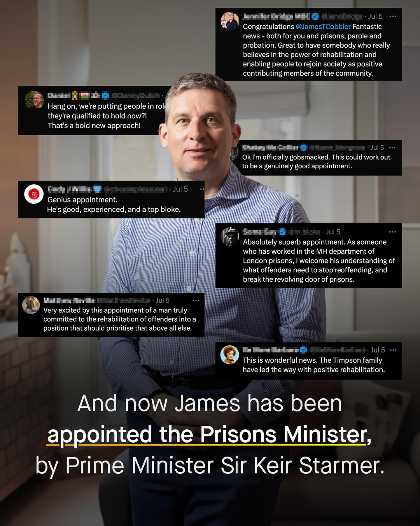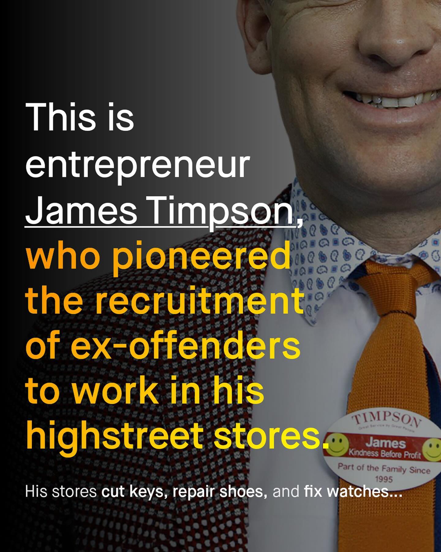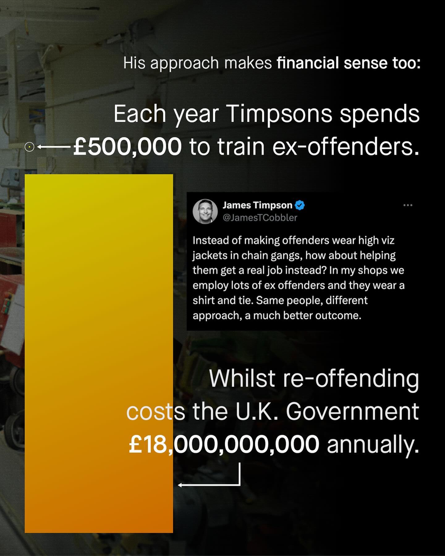 I’ve been pretty vocal about leaving the Labour party, feeling disenfranchised by the political system, and most recently, spoiling my ballot. But I am all too happy to point out, and congratulate, good news and positive action too. And Prime Minister Keir Starmer’s announcement of James Timpson as the new UK Prisons Minister, is a giant pat on the back, that I am all too happy to give. I have always been a fan of James Timpson; of his innovative business model, his iconic stores, his undying love of kindness, and most of all, his track record of employing thousands of ex-prisoners in his hundreds of Timpson stores. In fact, I actually gave him (one of just three) TheTinMen Tin Heart Awards, many years ago. But James is not a philanthropist, and his business is not a charity. James unequivocally asserts that his employment of ex-prisoners is good for profits, and makes absolute commercial sense too. ‘Timpsons’ is a £200,000,000 business juggernaut, and an iconic, trusted brand to the British high street, and the British people. But what James has shown the world is infinitely more valuable than anything measured in pounds and pense; and that is the power of a second chance. Incredibly, of his 1,500 formerly incarcerated employees, only 4 (!!) have gone back to prison – a recidivism rate of 0.26%. And so with that, I literally cannot think of anyone more worthy of the role of Prisoners Minister, a position that can transform the very tectonics of how the carceral system works, and how prisoners are rehabilitated. It is no secret that our prison system, with more than 95% of incarnated people being men, is broken; usually making criminality worse, trapping people inside a vicious cycle of incarceration, violence, addiction, and neglect. But this could be about to change. So I would like to share my support for James, and Prime Minister Starmer, for making the bold move of appointing such an impressive pioneer of prison reform. Good luck @jamestimpsoncobbler