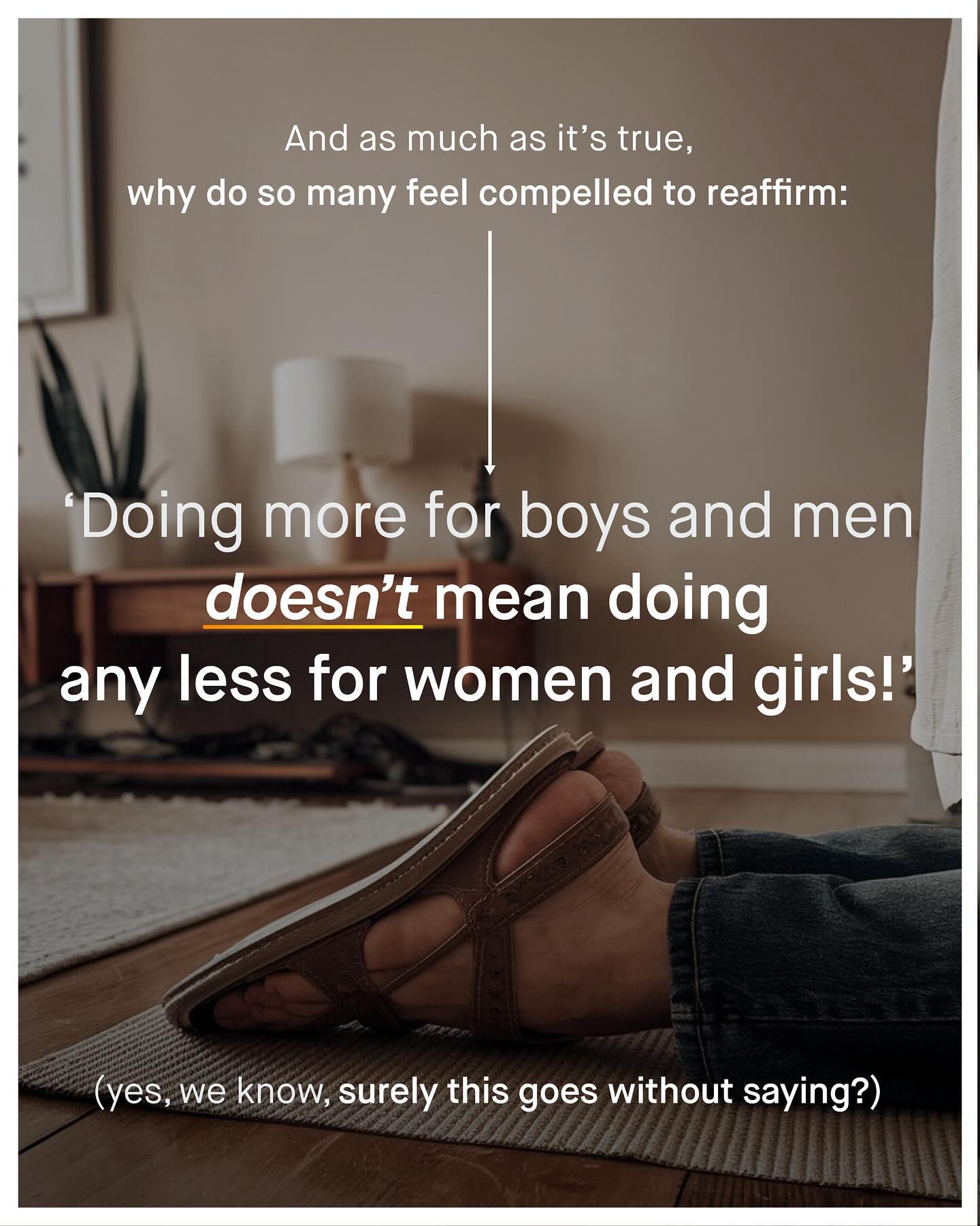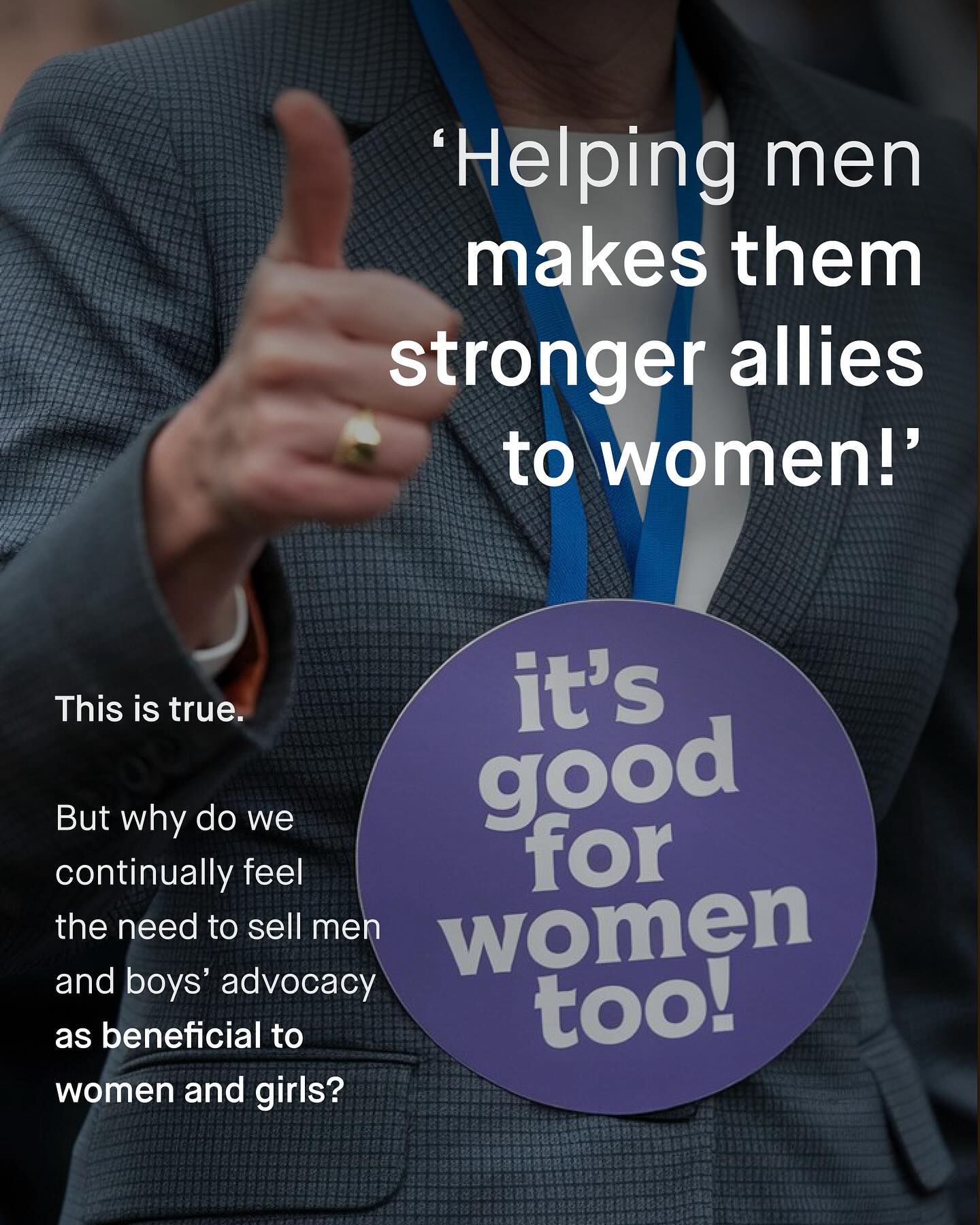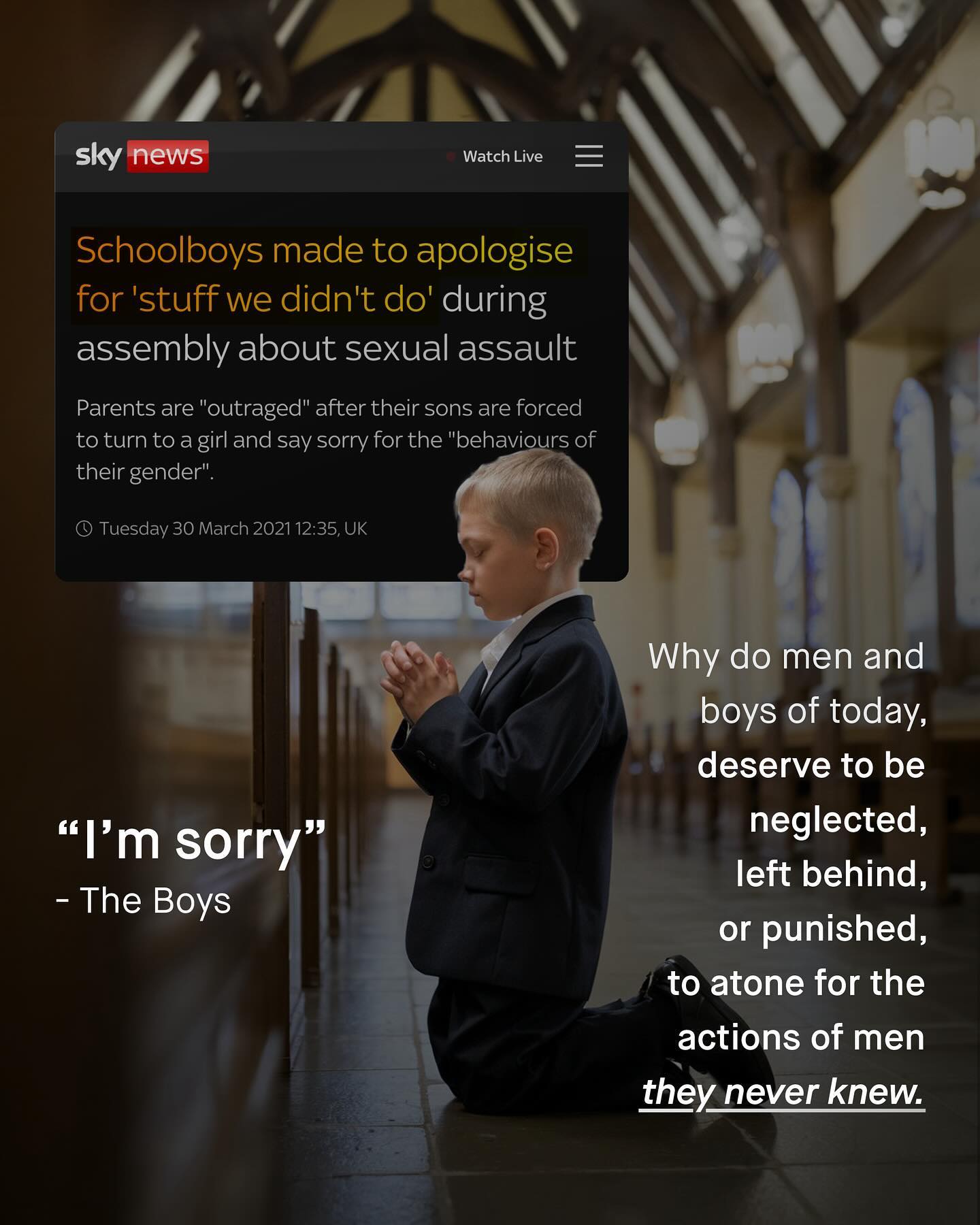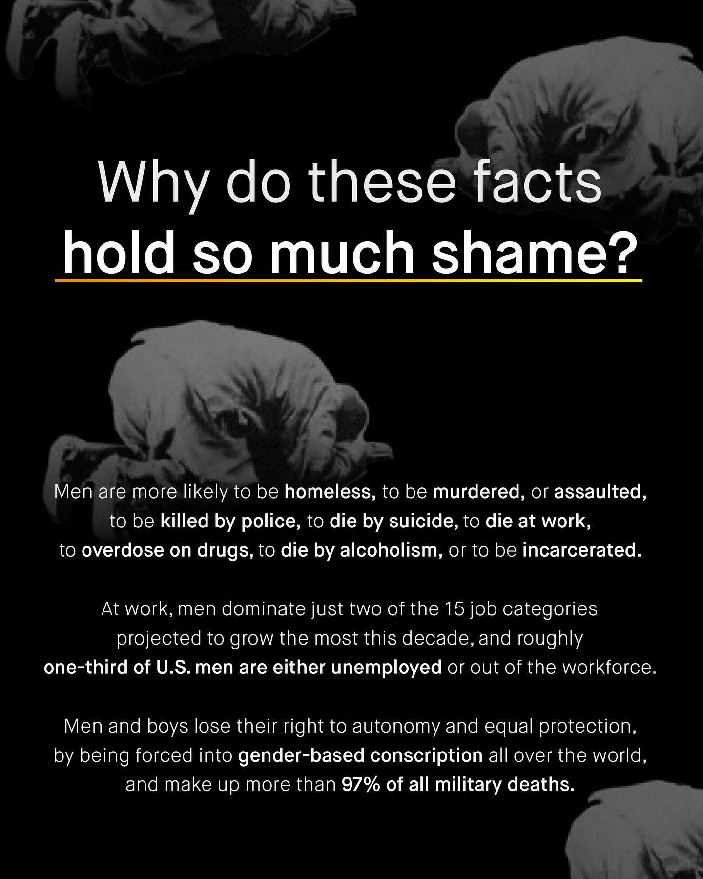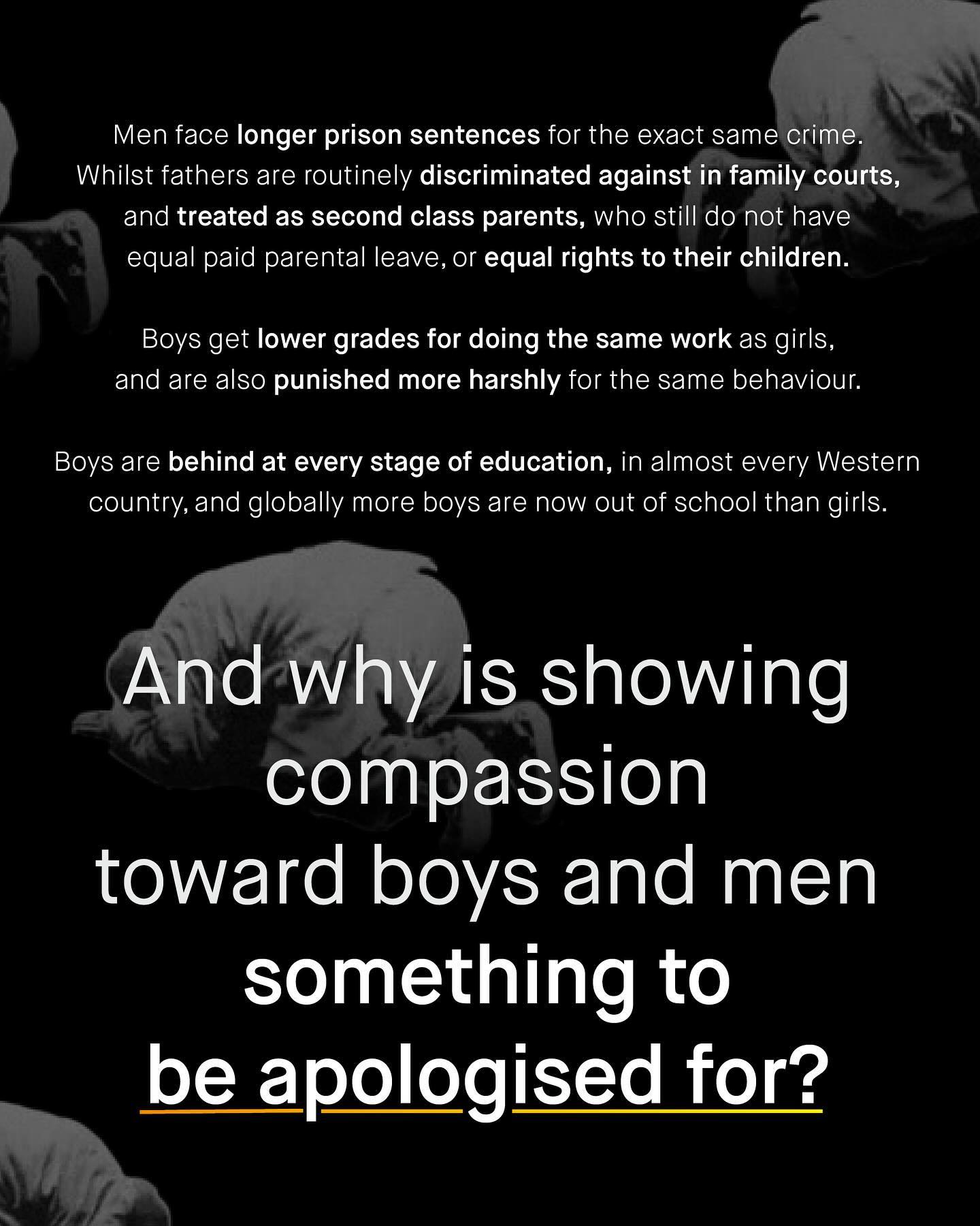 Why are the words of men and boys’ advocacy whispered, as if some kind of dirty secret? Why does speaking kindly, or with compassion about men and boys, so often feel like walking on egg shells? Why does the conversation around these issues come with a series of clumsy apologies and spluttering disclaimers; like some kind of shame-laden small print, to round off the edges and water down the conversation? And to whom are we making these concessions? No. Stop it. Sharing the harsh and too often ignored reality of men and boys, does not need to be apologised for, or approved by others. So stand up, dust yourself down, and stop kowtowing to your gender equality overlords. It’s a sad reality how many feel their hands are tied, who otherwise might be able to reach out and help. So we stand on the sidelines instead. Men and boys fall behind, drop out, and disappear in darkness; the world watches on, wanting to help, but also, not wanting to be *seen* helping. Meanwhile, those who lift their head about the parapet to reach out a hand, are yelled at and shouted down; harassed, threatened, and pilloried, somehow compared to Neo N*zis, “the Alt-Right”, and White Supremacists. And it works. The slandering of such an area of advocacy has been tremendously successful, shocking, and of course, highly exaggerated. And so, nothing changes. The things urgently needing discussion, are not discussed. The information that desperately needs sharing, is not being shared. And the lives that can be saved, are not. Too many are afraid to disagree, push back, or openly support men and boys; understandably scared to follow, share, speak out, or stand up. So why the asymmetry? For many of us bang the drum loudly for women, marching together, and holding aloft our demands for change. But when asked to do the same for men and boys, the world turns stoney faced, or looks at its feet sheepishly. So where did the strong voice of advocacy go? Why the shame and unease, the endless pleading, penance paying and apologia? And when will it stop? What do you think? - Images by Michael Tucker and JSB Co
