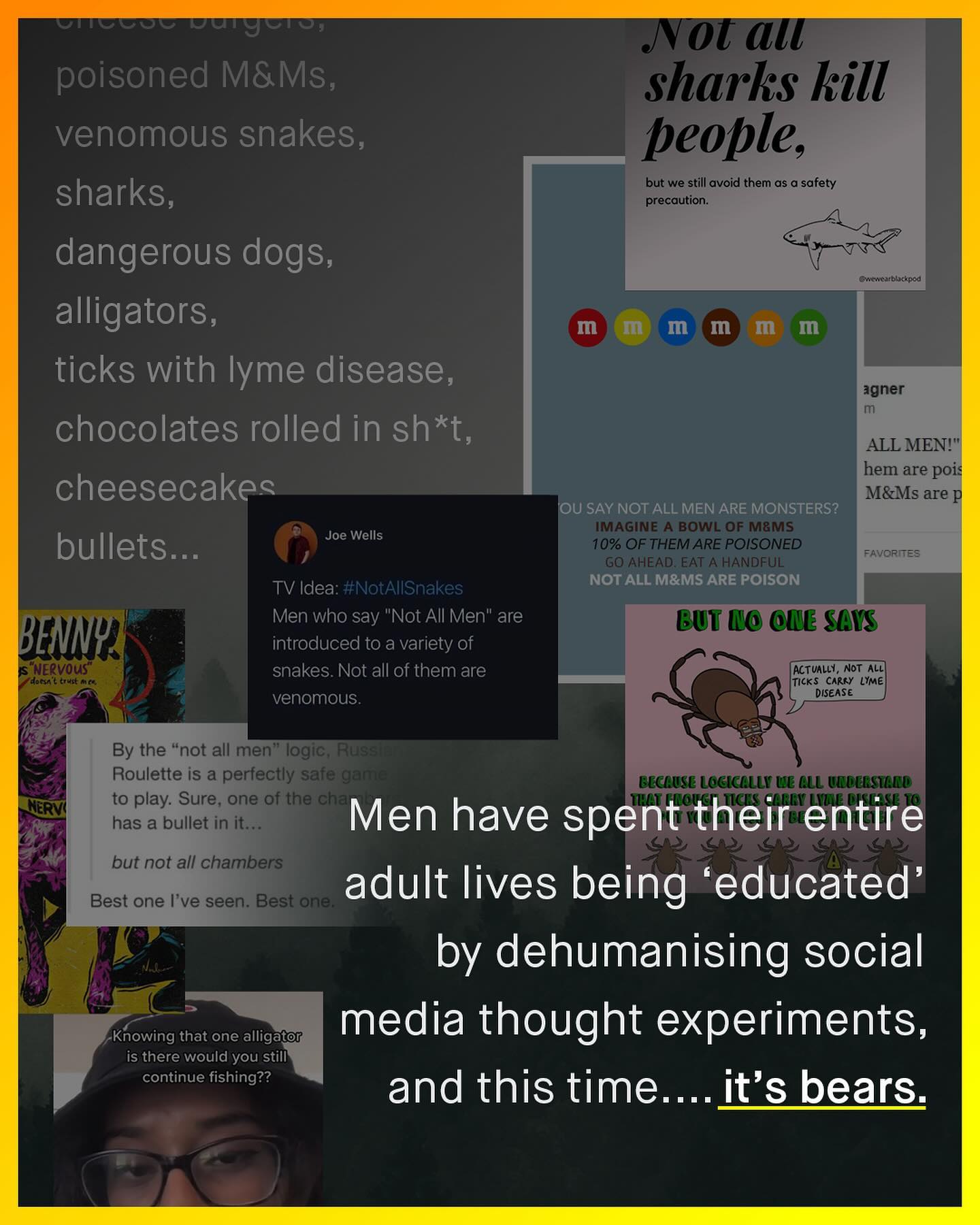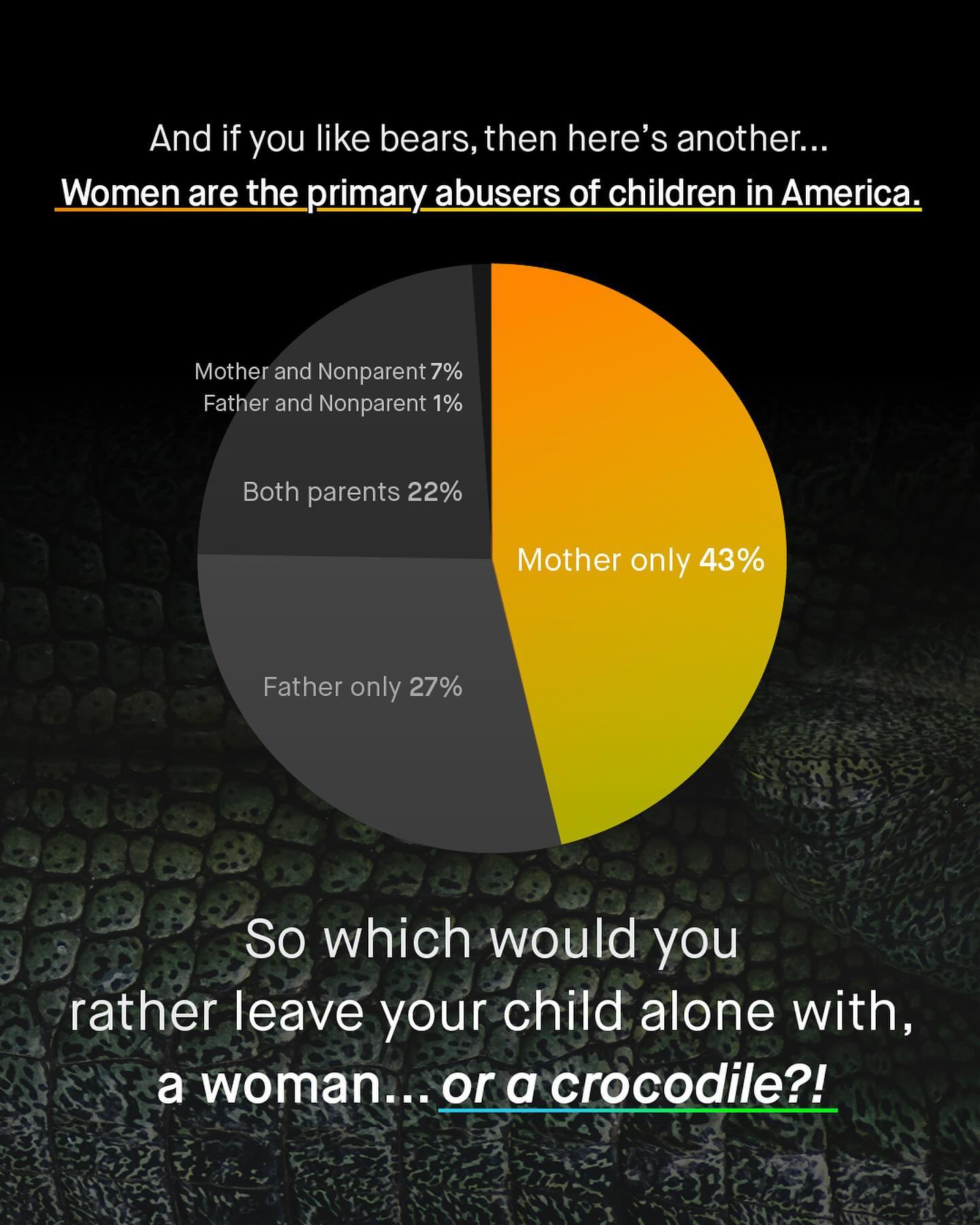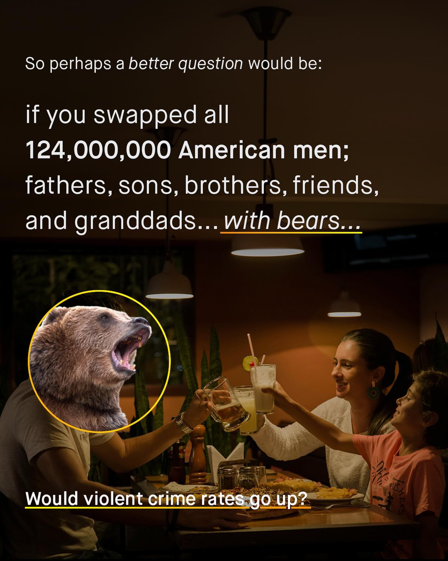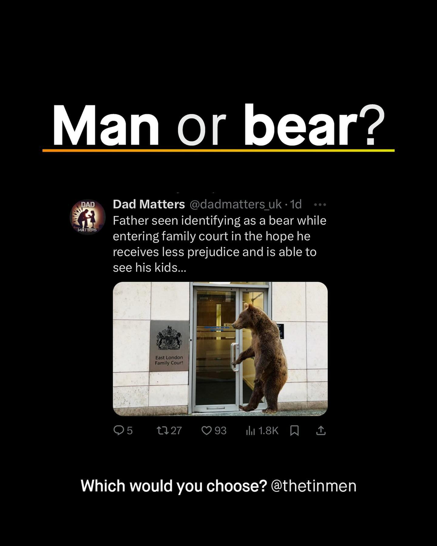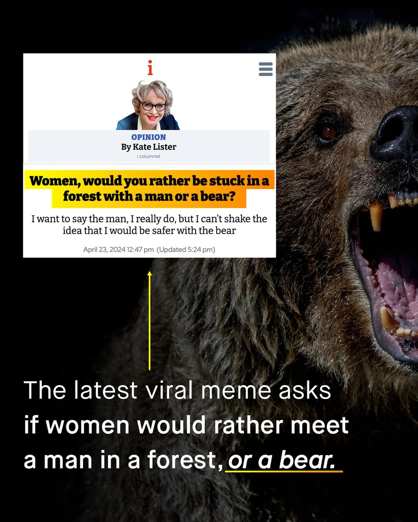 As per usual, I’m late to the party; and like Goldy Locks, Winnie the Pooh, and other children’s stories… this party includes bears. I’m not slow to such meme wars because I’m unaware, or unable to respond to them, but because I always hope I don’t need to – and that the common sense of humanity will prevail. But it rarely does. And more often, the grasping hands pull us all down into the mud of stupidity, to sploosh about in what is yet another race to the bottom. Yes. A shrill army of TikTokkers are making the claim that women would rather meet a bear in the forest, than a man. And not Paddington with his marmalade sandwiches… but a literal bear. A bear, that can weigh 600 lbs and stands at 8 feet tall, that will eat you alive, is the womens’ preference over some random man, who is probably eating a sandwich and just as startled as you are. To those who chose ‘bear’, I don’t believe you. Nor do I believe such an idea makes an important rhetorical point either. Such low IQ memes make no well intended attempt to address the causes of violence, risk factors, ways of mitigating them, or indeed those most at risk. No… instead we’ve chosen to talk about bears. Here’s a question, do you think if we swapped every single man in America, with a bear, rates of violence would increase, or decrease? Has a bear ever saved you from a burning building, a flood, an accident; stepping in to help you, or protecting you from danger? Or better yet… if you live your life terminally online, marinated and immiserated within TikTok outrage, are you really the best person to comment on violent crime rates at all? So what is the point of such thought experiments, if not simply to divide us further? What do you think? Man or bear? ~ U.S. Department of Health and Human Services FBI Statistics U.S. Department of Justice 2020 #bear #fyp #manvsbear #bearorman