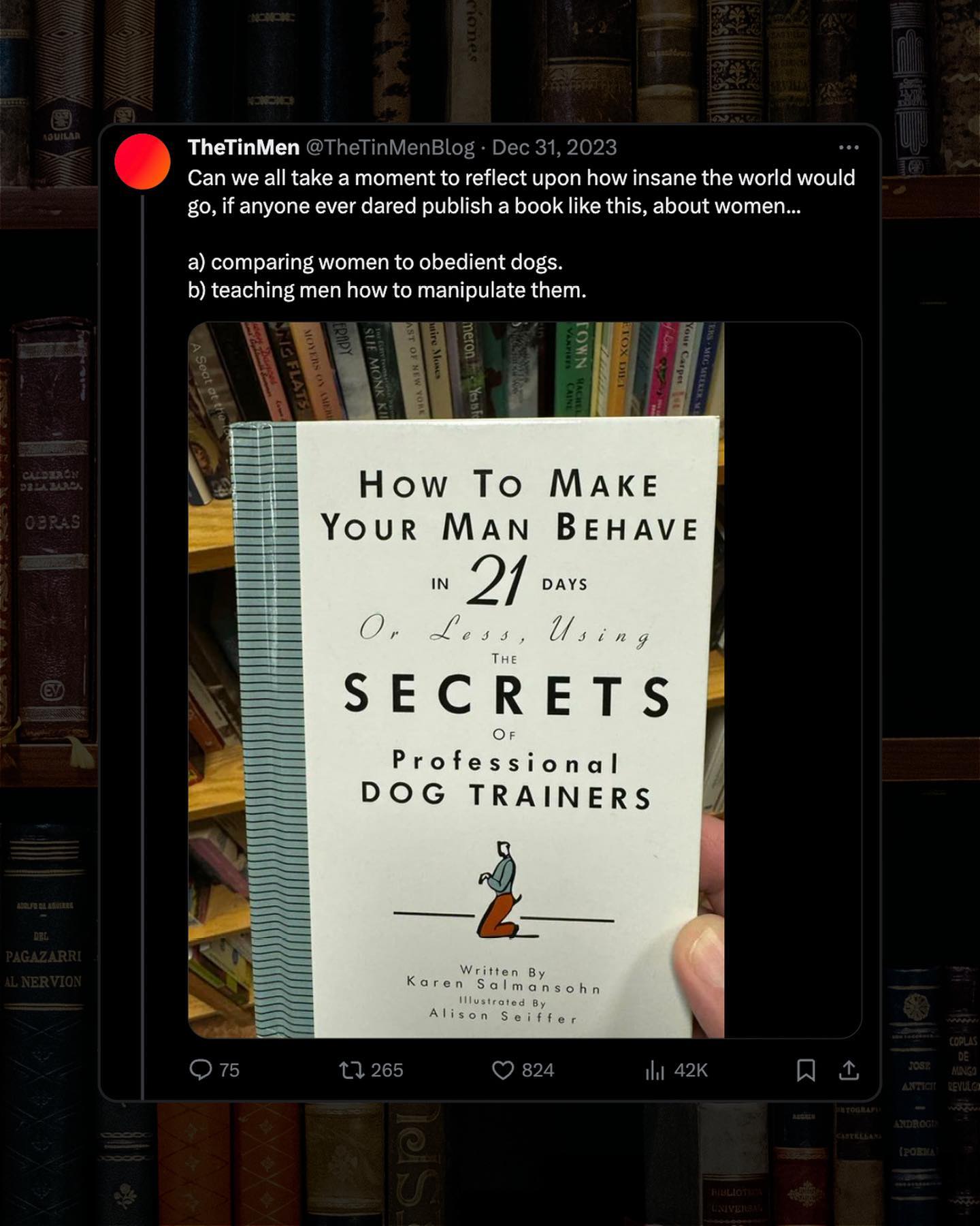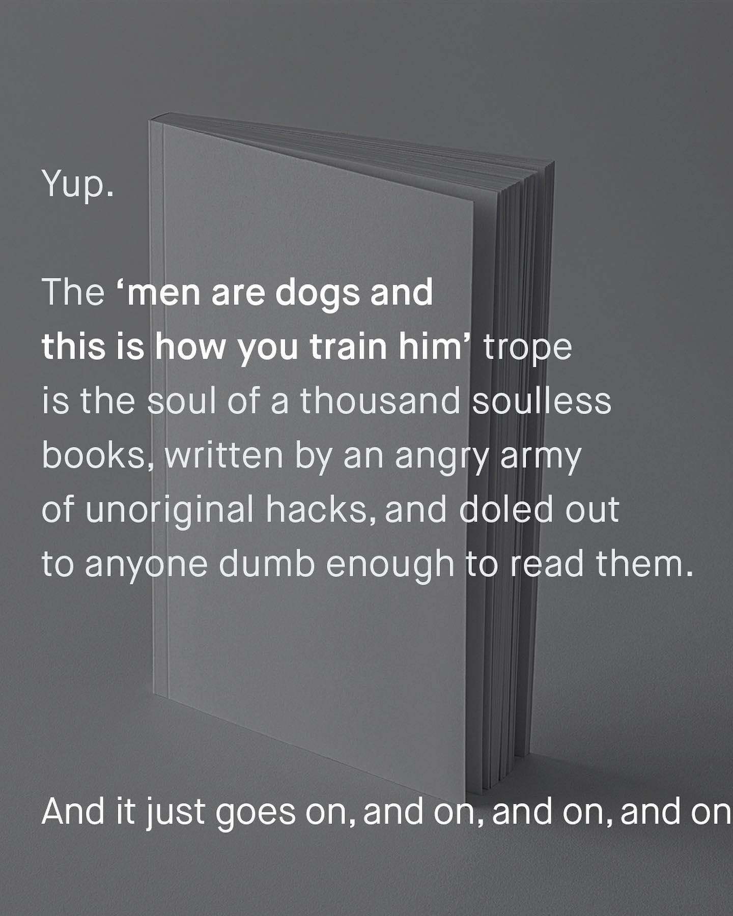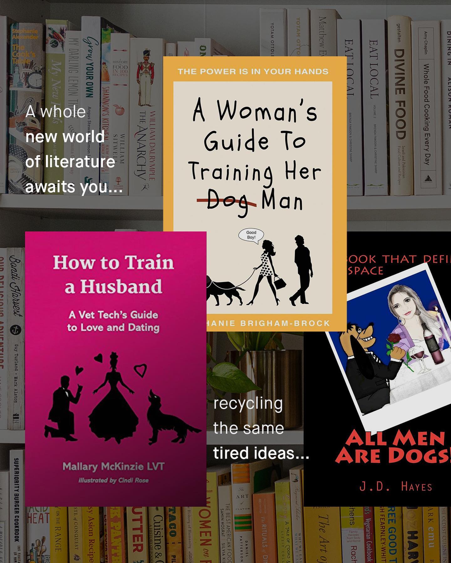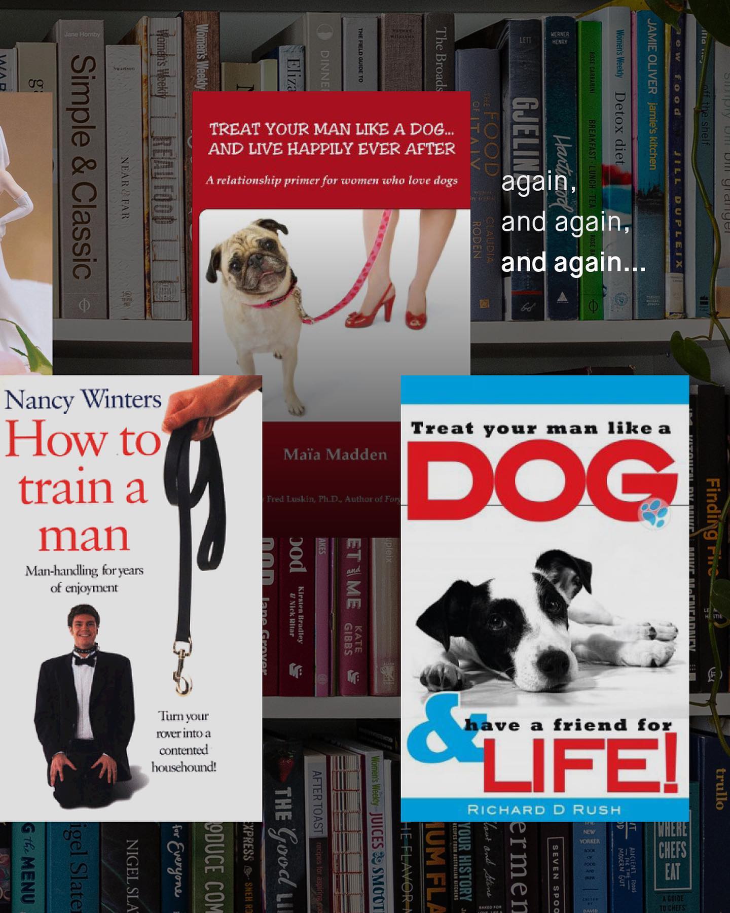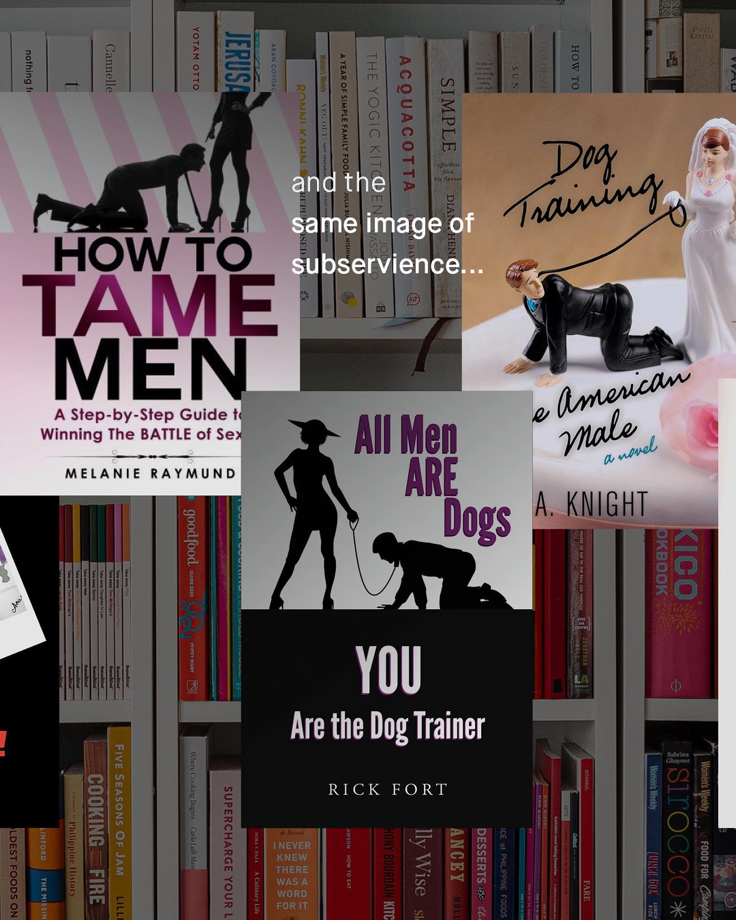 The world has started to wake up to the harmful and dehumanising language aimed at women and girls, and whilst work still needs to be done – we are at least doing something. The same cannot be said about the language thrown at men and boys, that is openly tweeted, printed, and published, to very little resistance, and even “yas kween” back slapping applause. Trash, pigs, toxic, sharks, ticks, chocolates rolled in shit… The list of brain dead thought experiments, masquerading as ‘advocacy’, is a list that seemingly knows no end. Even ‘the patriarchy’, the allusive tyrannical oppressor class of ‘men’, has an undeniable whiff of dehumanising rhetoric to it. So what about “dogs”? The animal to which so many women have been compared historically, is now becoming the new symbol of men; to be trained, and coerced into utter obedience, written and bragged about, by an army of angry authors. ‘Why men are dogs!’, ‘All men are dogs!’, ‘How to train your man, like a dog!’, ‘Dog training, but for men!’…. it goes on and on, dozens of books pedalling this trash have popped up, to fill what is clearly an burgeoning new market of some kind. So I ask, would these books be acceptable if they were teaching men how to train their wives into subservience? Would a cover image of a women with a leash around her neck, kneeling by a man’s side even get printed, let alone stocked by book stores? I don’t know. But what I do know, is if you see any of these books on the shelves, or bed side tables of the women you’re dating, I’d suggest you reconsider knowing them. What do you think? ~ Images by Karen Winegeart, Luisa Brimble, Thought Catalogue Victor Grabberczyk, and Inaki Del Olmo.