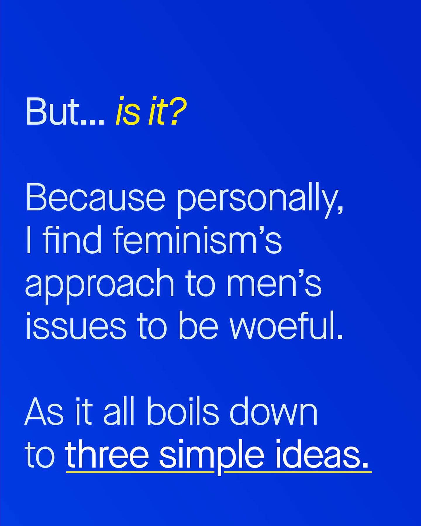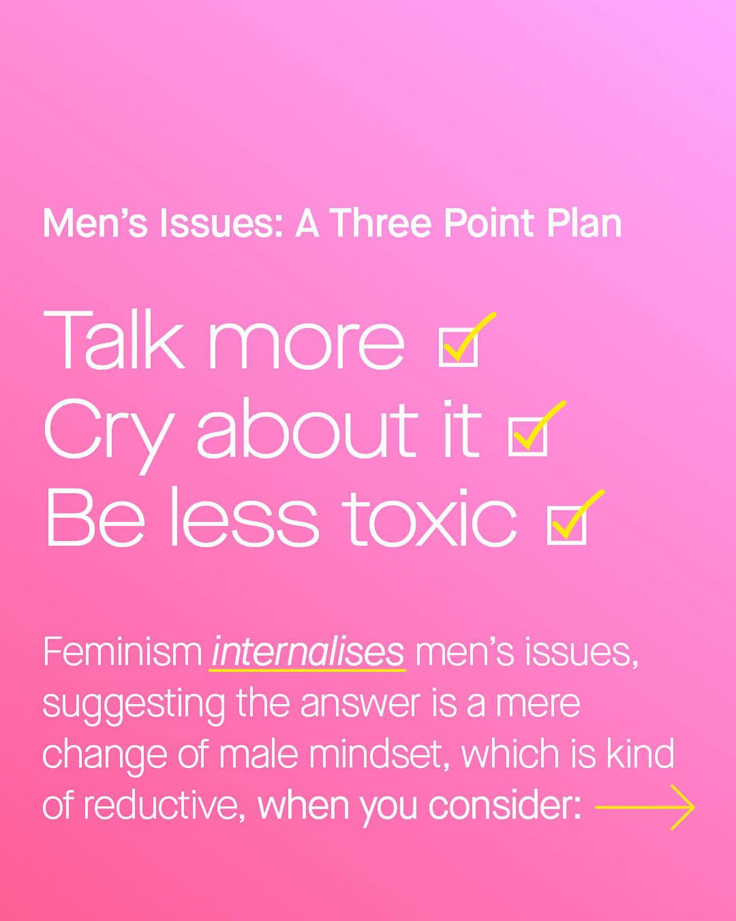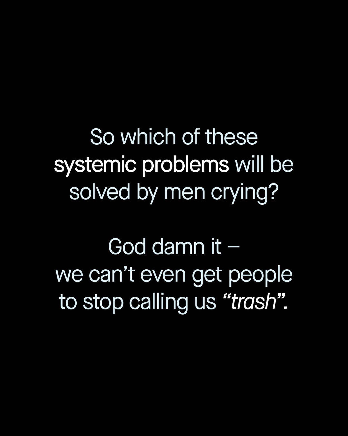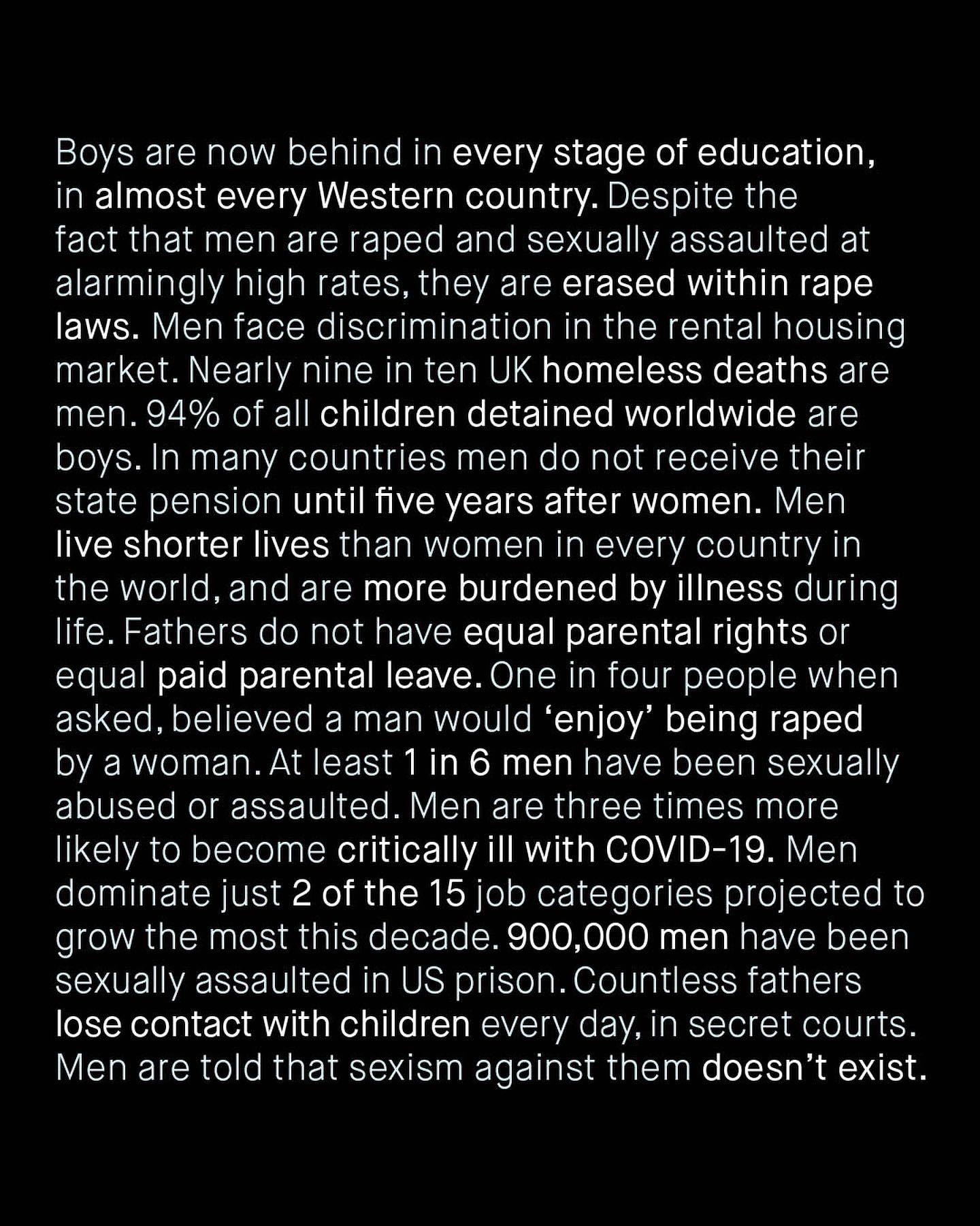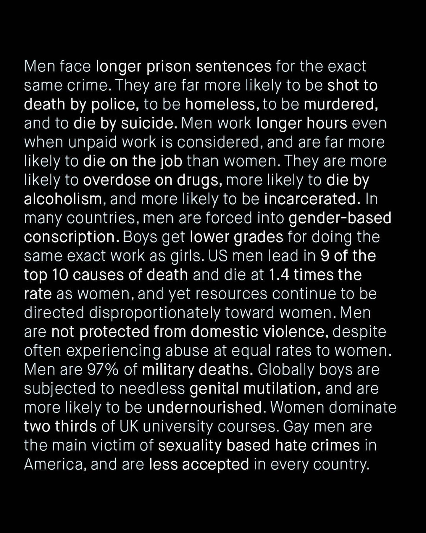 No caption today, as I need all 2,200 characters for my sources – which I suppose is kind of the point. Sources Men get longer prison sentences 96% of police killings 85% of the homeless 87% of homeless deaths 75% of suicides 81% of homicides 96% of the incarcerated 92% of workplace deaths 94% of detained children 70% of alcohol deaths 72% of drug deaths 97% of military deaths 62% of sexuality based hate crime victims <1% of abuse refuge Fathers losing contact with children Gay men less accepted Men work longer hours Male Conscription Lower marks for the same work Higher death rates (US) Equal rates of abuse 900,000+ US men sexaully assaulted in prison Undernourished boys Male Circumcision Women dominate ⅔ of university courses Boys behind in all areas of education Male rape survivors erased by law Unequal pension ages Discrimination in housing markets Men live shorter lives everywhere Fathers without rights Fathers without parental leave Men ‘enjoy’ being raped One in six men sexually abused More likely to become critically ill with COVID Men dominate just 2 careers expected to grow most Images by Chris Burns, Bruce Mars from Unsplash.