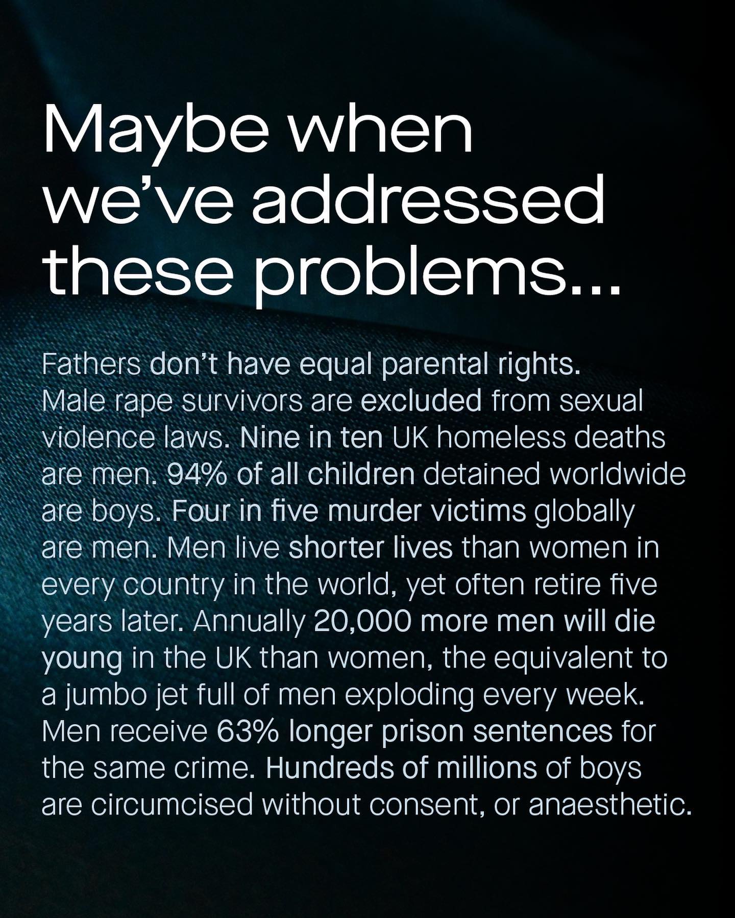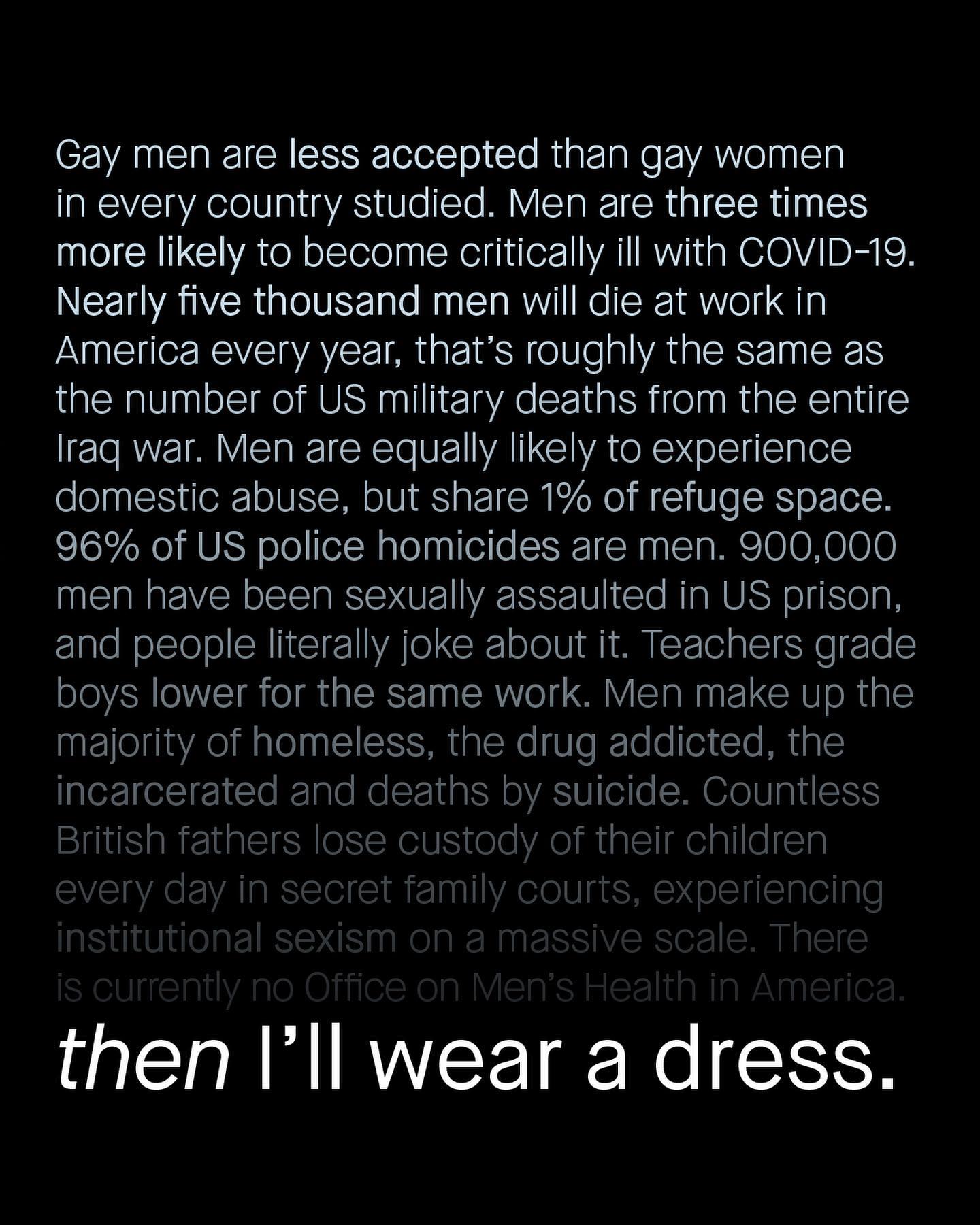 There’s more to the issues faced by men and boys, than not being able to wear a dress. And masculinity is infinitely more complex and deeper than any outfit, or item of clothing – and a dress worn, or not, neither adds nor takes away from it. Yet, I see so much of the conversation around the male experience, being reduced down to these seemingly trivial dress-based thought experiments. And honestly, I don’t care about dresses. Sorry. Yes, Harry looks great in a dress, but unless beneath it he’s hiding a few thousand refuge beds for the erased male victims of abuse, then it’s not really important to me. Unless Harry’s dress will help our boys in school, or win fathers back parental rights, or improve the health, happiness and life expectancy of men worldwide, or find solutions to the epidemic of male suicide, then I don’t really care. Give the cover of Vogue to the fathers losing kids in corrupt family courts, the forgotten veterans dying by suicide, or the men left in the cold. Put those dying to addiction and homelessness in dresses, if it means we’ll care more about them. So am I missing something? Why is male-dress-wearing placed at the top of the agenda? What do you think? Images – henry-co, andrej-lisakov, jackson-david, mariabeatrice-alonz, julissa-santana and pawel-czerwinski from Unsplash