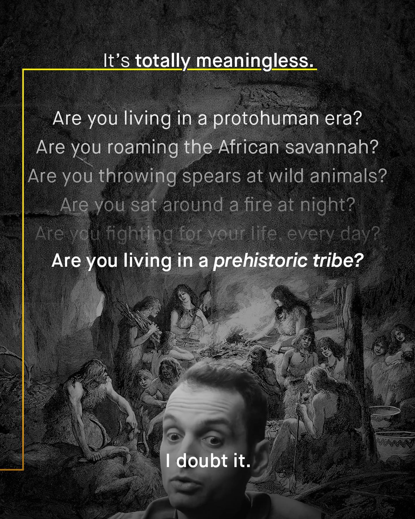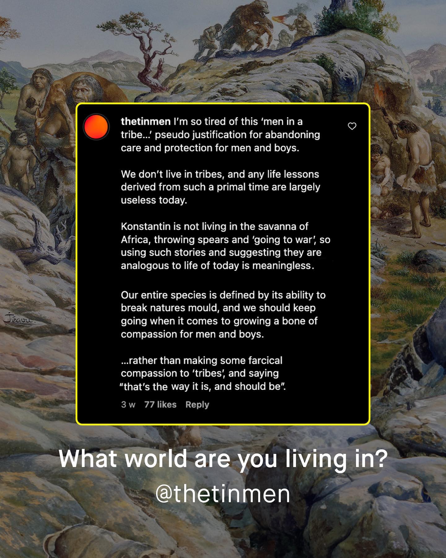 More and more you’ll see political pundits dip their toes into the treacherous waters of ‘men and boys advocacy’; with each wrestling words to give a quippy answer to ‘why don’t we care about men’? It’s a good question. Why, when they make up the majority of the homeless, the addicted, incarcerated, homicide victims, early deaths, and suicides; do we care so little about men and boys lives? Why do we so often step over, walk past, or look though men’s pain? And why are we so repulsed by the concept of ‘mens issues’? Often the answer pundits trot out, is the trope of ‘women’s greater reproductive value’, typically followed by a strange prehistoric analogy involving “tribes” going to war, quite literally borrowed from an era tens of thousands of years ago. Okay cool. But the year is 2024. And guess what; the spear-chucking, mud-hut-living, fireside-dancing, proto-human way of life, is long gone… So I ask – if you are a proponent of this ‘men in tribes’ meme, that aims to justify male disposability as “rightly so”, then why end there? Why not subscribe wholesale to the primitive cave man life style? I’m serious. Watching political commentators buy into the ‘men in tribes’ world view, quite literally tweeting it out from an iPhone, sat in their cushty centrally heated home, feet up, and watching TV, is a level of peak irony I’ve rarely experienced. So ask yourself – Are you living in a tribe? Are you flinging shit across your living room? Are you fighting bears, wolves, and wild boar with primitive weapons? No. Neither am I. So put the flat white down, look around you, and forgo your super-cool ‘tribes’ analogy. Let’s do better. We’re not living in caves anymore. What do you think? ~ Images by Getty