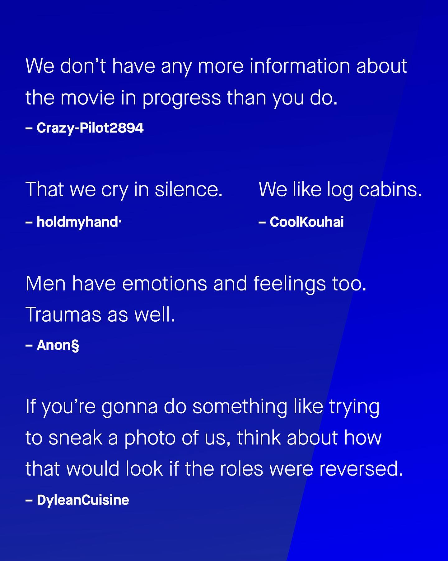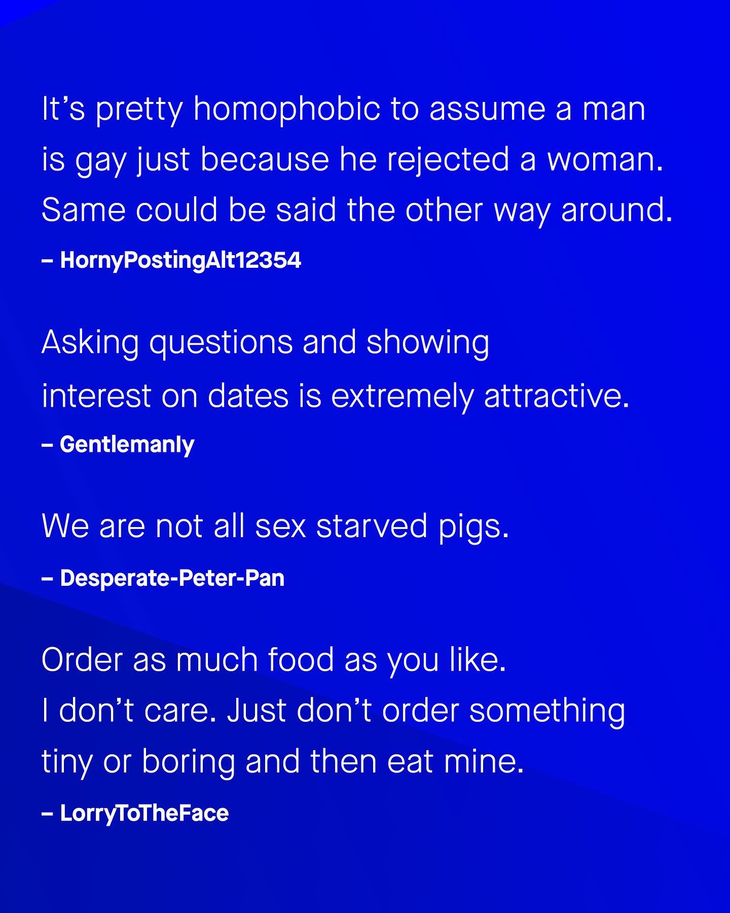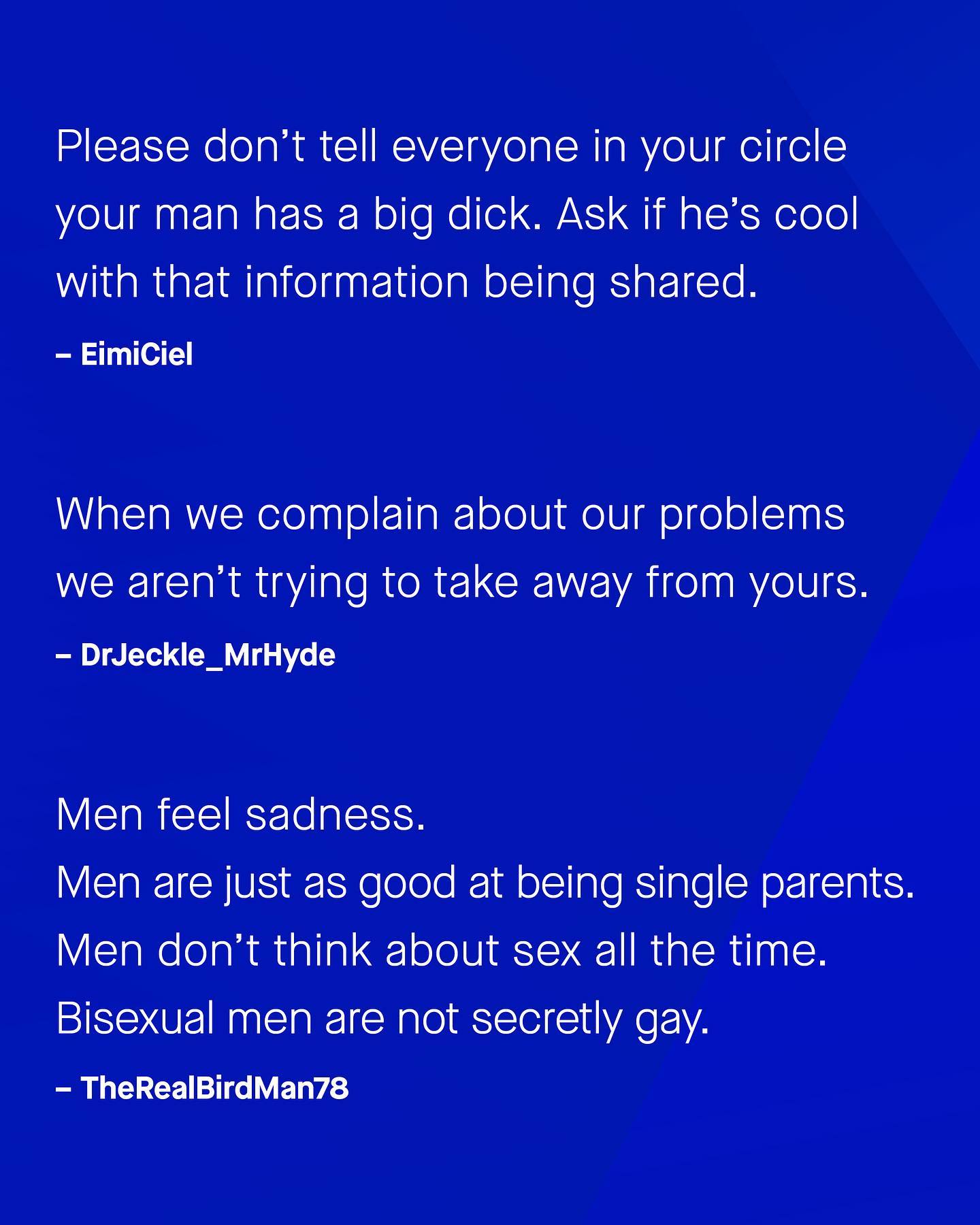 If change is possible, it will not come through pie charts, infographics, political sabre rattling or virtuous social justice campaigns. It will come through normal people, speaking about their own experiences, and everyone taking the time to listen to them. So remember, grant good faith, make subtle distinctions and listen carefully. So guys, what’s one thing all women should know?