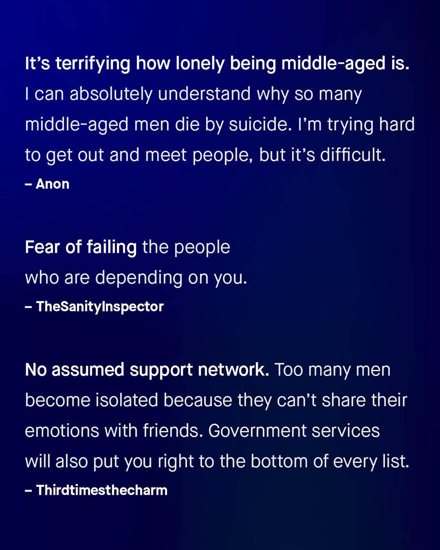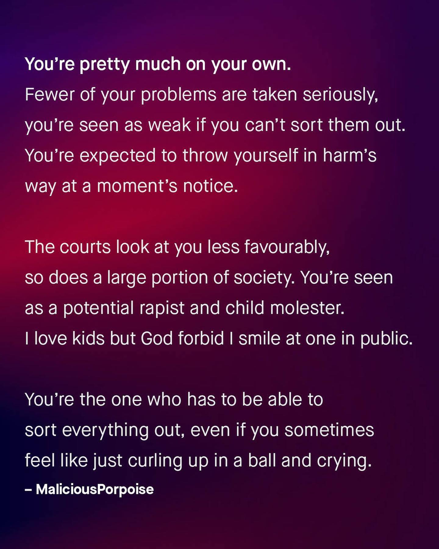 Whether it’s loneliness, the pressure to provide, or walking home at night; being a man often comes with a very real and valid set of fears. Sadly, to so many men, fear is one of the countless emotions that seems off-limits to them. For you cannot be afraid if you need to provide and protect, fight the fire, or slay the dragon; and few will look kindly at the traumatised knight in shining armour, whimpering in the corner. If there’s a war to be fought… we send the men. A bump in the night… we send the men. A knife-wielding lunatic… we send the men. The history of the world, and its greatest wonders, have been built upon the lives, sacrifices and stolen fears of such men – bought, buried, or blown up – for millennia. And so, we have come to see men as robots, and not as fellow humans, each capable of feeling and fearing as anyone else. Yes, men can be afraid too. So I want to ask the guys, what is it you fear, and how can we better support you in fighting it? ~ #mensmentalhealth #malesuicideawareness #malesuicide #guytalk #mensmentalhealthawareness #mensmentalhealthmatters