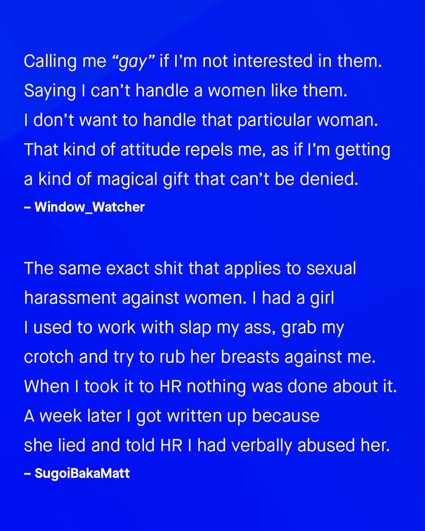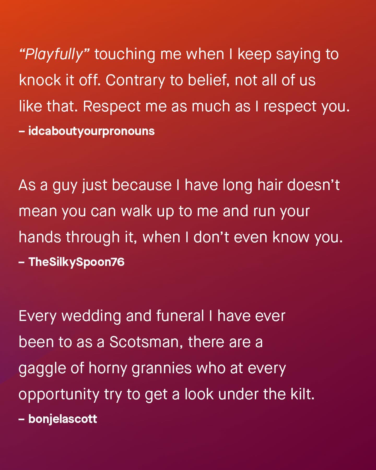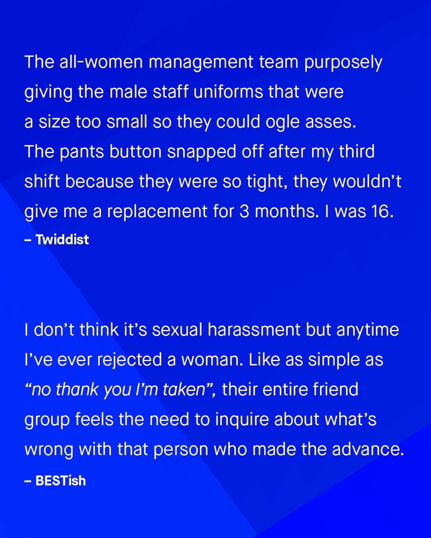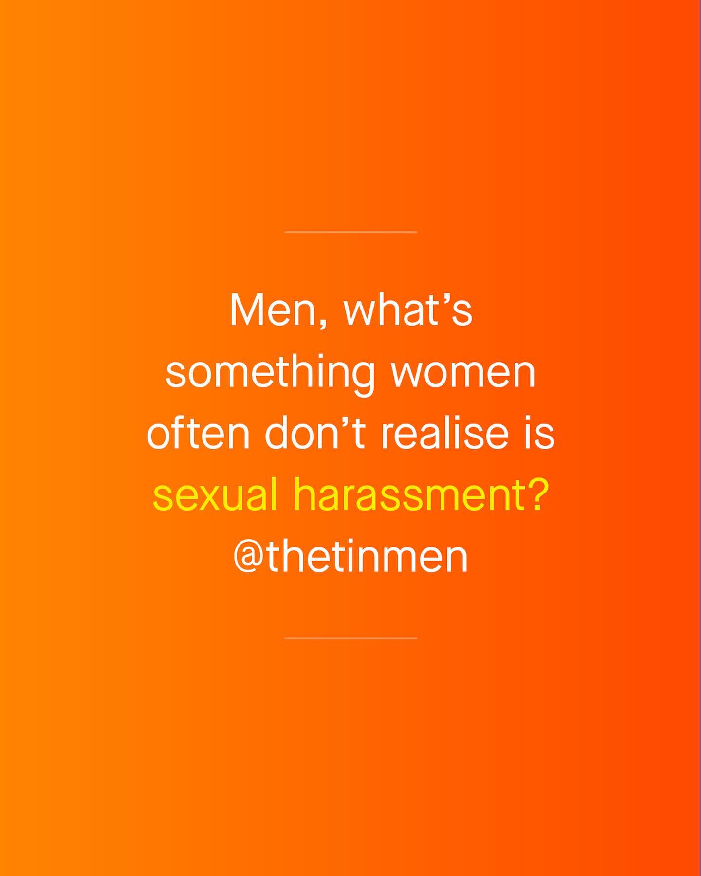 What a lot of people don’t realise, is how sexual harassment is often a two way street. As the conversation around calling out and discussing harassment continues its worthy march forward, it’s important we don’t leave men behind - whose experiences are often laughed at, ignored, or waved away. “I’m just be playful!”, “It’s a compliment!”, “Don’t be silly!” So guys, what are some of the things you’ve experienced, that others don’t realise is sexual harassment? ~ #sexualharassment