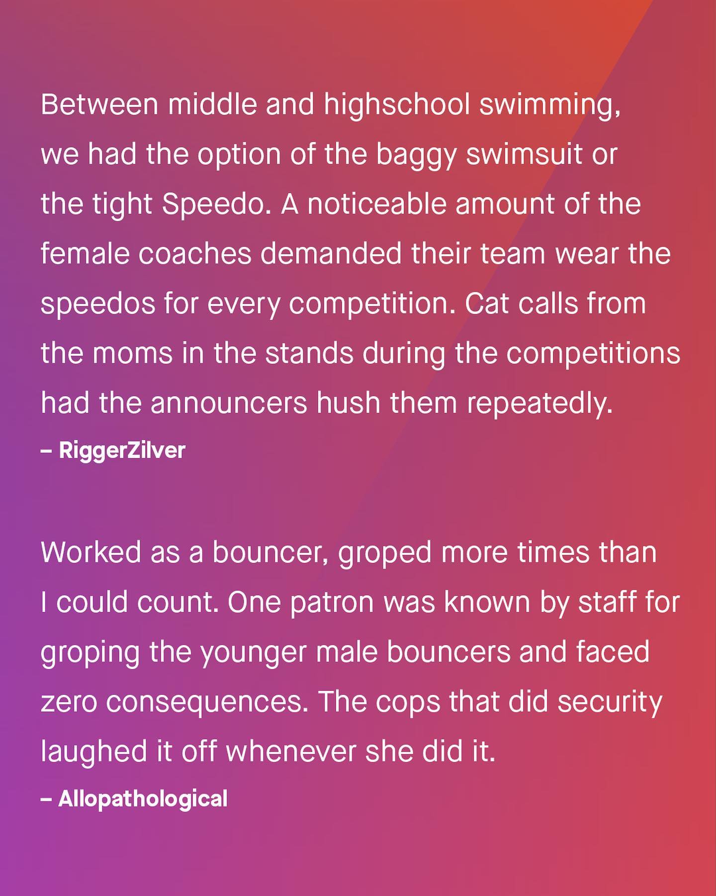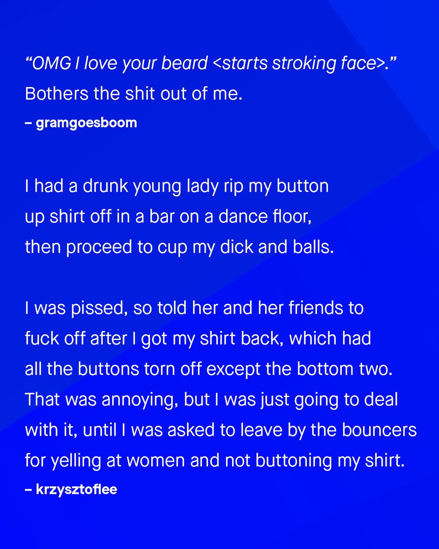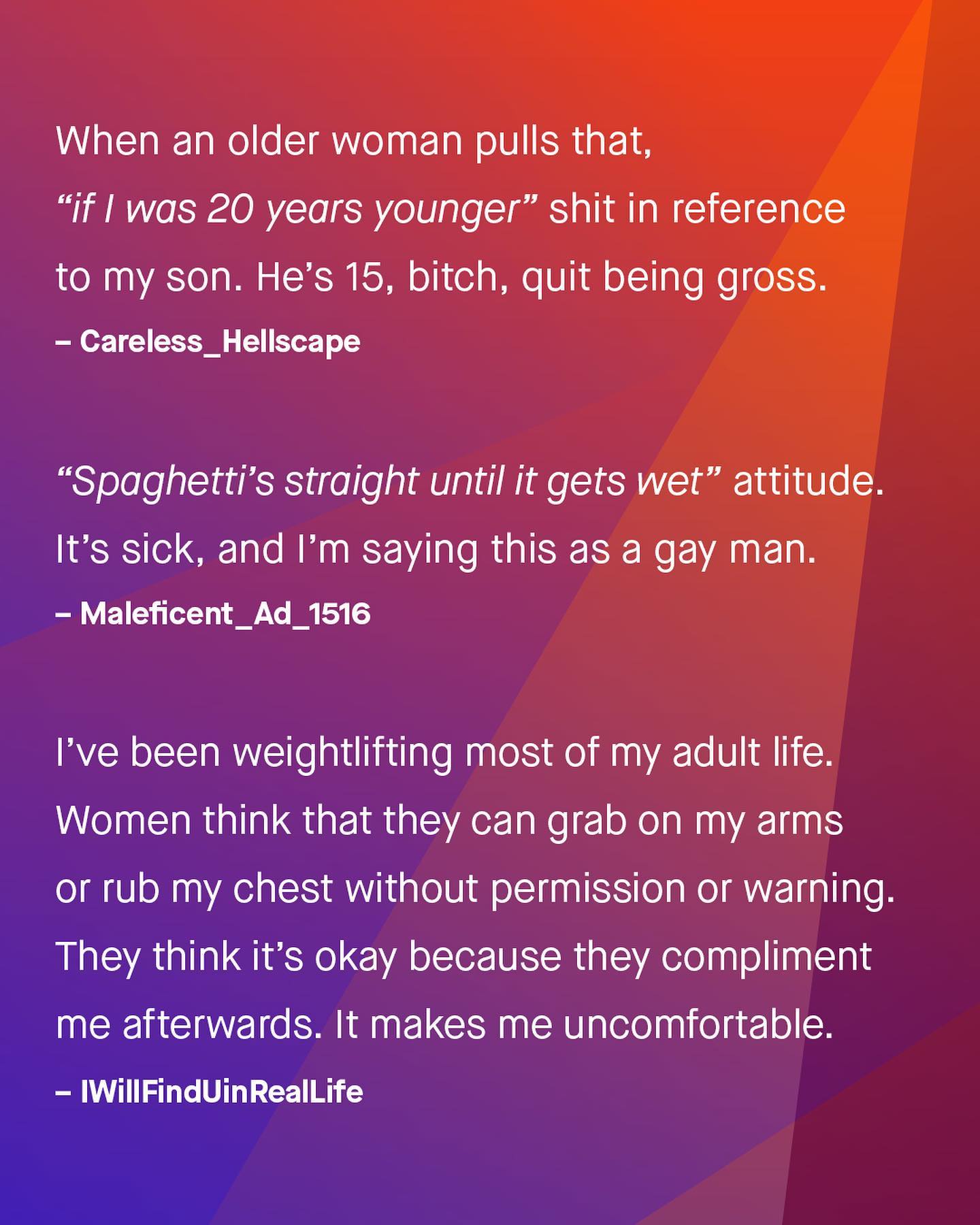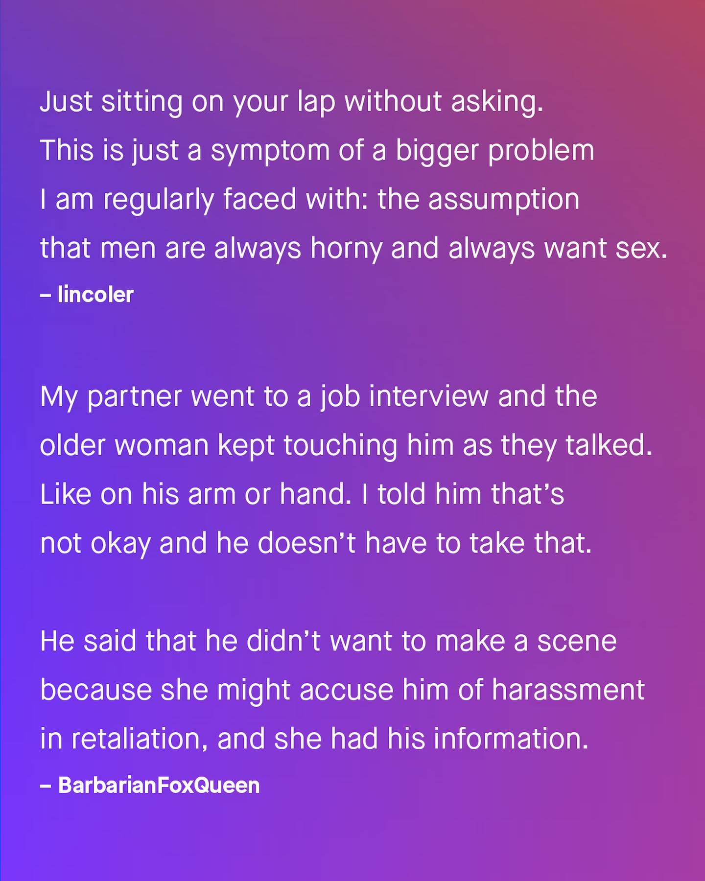What a lot of people don’t realise, is how sexual harassment is often a two way street. As the conversation around calling out and discussing harassment continues its worthy march forward, it’s important we don’t leave men behind - whose experiences are often laughed at, ignored, or waved away. “I’m just be playful!”, “It’s a compliment!”, “Don’t be silly!” So guys, what are some of the things you’ve experienced, that others don’t realise is sexual harassment? ~ #sexualharassment