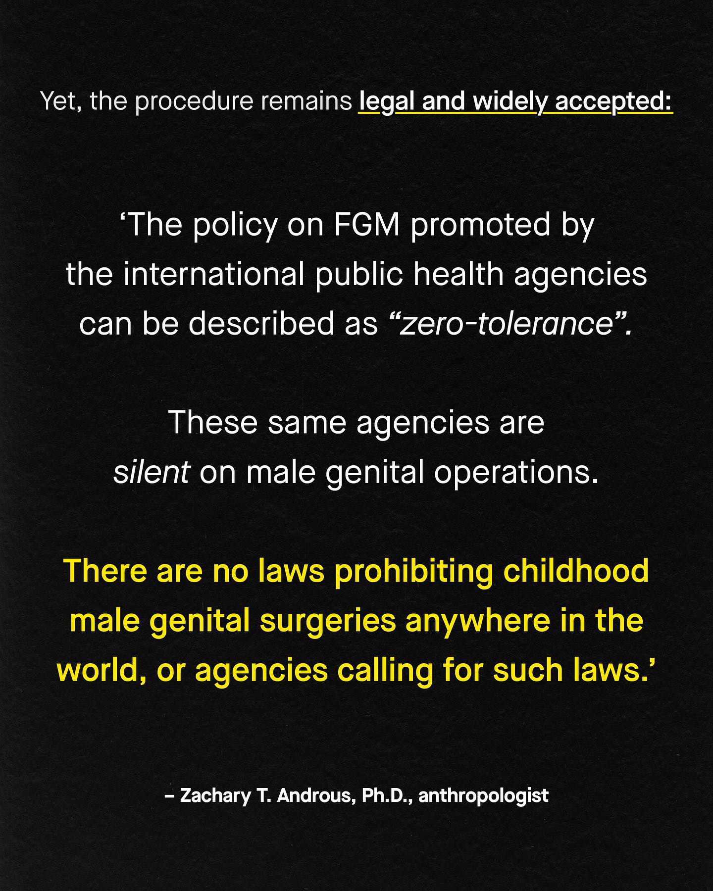 The concept of #bodilyautonomy might seem alien to the discussion of men and boys, until you consider that most American boys have theirs violated in their first days of life. I am talking about male circumcision, which remains widely socially accepted around the world. By no means is this just in America, as over a billion men and boys have been circumcised across the globe; a procedure with few (if any) medical benefits, that is usually carried out for a mix of cultural, religious and aesthetic reasons. Often times these procedures, especially some of those in the developing world, can be truly horrifying, and genuinely traumatising to boys – yet there is not one single law criminalising the procedure. Why not? Is this not a glaring violation of bodily integrity and human rights? Meanwhile, the data continues to stack up against it, with spurious studies that spread misinformation overturned. For example, Abraham Wolbarst's promotional claims that circumcision prevented penile cancer ‘were false and mislead the medical community for decades.’ More and more national medical organisations speak out against male circumcision – describing it as ‘an assault’, or ‘a violation’ on a boy’s ‘right to make decision about his own body’. But will things ever change within public attitudes, and when? To be clear, public acceptance of circumcision is waning – 10% of Americans opposed it in 2010, in 2019 it had grown to 15.9% – but is this fast enough? So what are your thoughts? Are boys not entitled to the same right, choice and autonomy as girls? [1] [2] [3] [4] [5] [6] [7] [8] Zachary Androus PhD Circumcision trends Images by Gradienta, Black Kiwi Hug, Haithem Ferdi, JC Gellidon, Ray Zhou and Taisia Shestopal from Unsplash. #mybodymychoice #bodilyautonomy #intactivist #intactivism #intact #humanrights