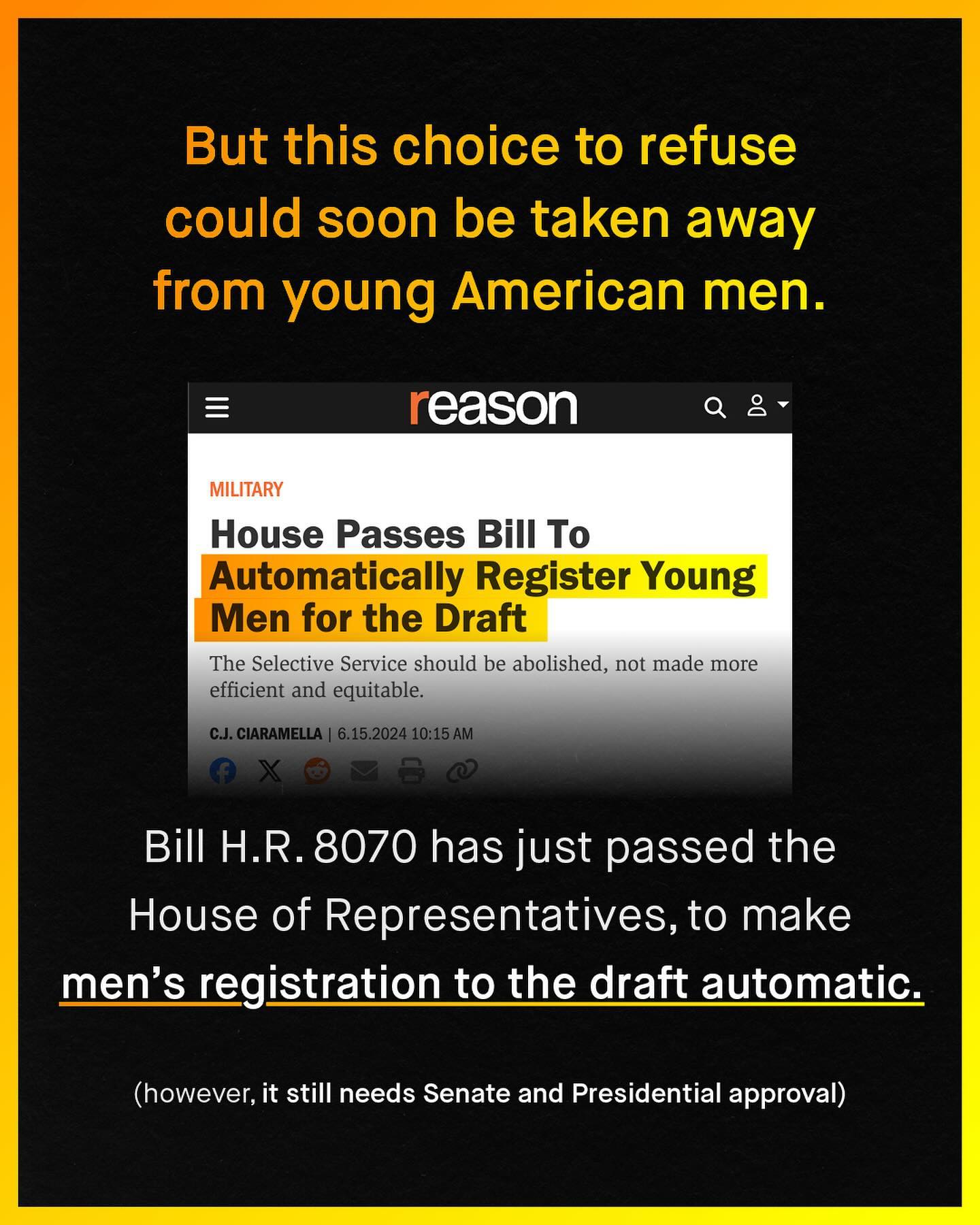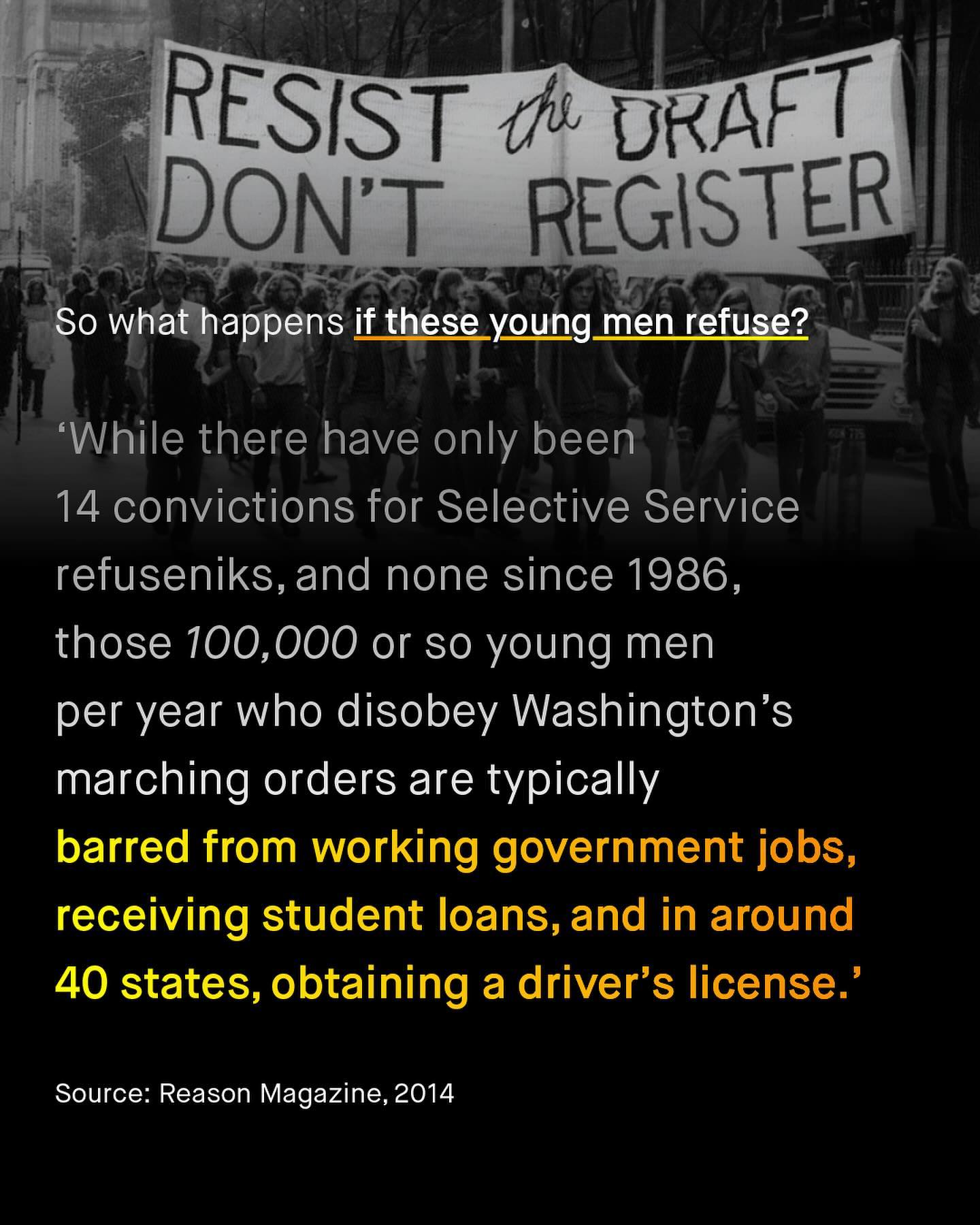 The right to bodily autonomy is one of the most fundamental human rights a person can have. Your life is your own, to do with as you choose. It does not belong to another person, or government; and such a right supersedes any religious doctrine, political campaign, or national need. Many have learnt this when it comes to women’s bodies; capturing the sentiment through the iconic words of ‘my body, my choice’. Such words are held aloft in protests, yelled in streets, and demanded in the highest courts in the land. But few extend them to men and boys. Men and boys, whose body and life is not their own, as hundreds of millions have to sign it away to the government, to shield a nation in times of war; a life not sacrosanct, but simply cannon fodder to by shot at, more meat for the military machine. The military draft claimed tens of millions of male lives in the 20th century, in both world wars, and more recently in Vietnam. We’ve heard the stories, men and boys whose numbers were called up, shipped away to die in the most horrific circumstances one can imagine. And the mechanism of such a hellish thing still exists today. Every young man in America must sign up to Selective Service when he turns eighteen, and whilst this was something many could refuse… this may soon not be an option either. A Bill has been passed in the House of Representatives, that makes registration to Selective Service for young men automatic, in a change that somehow has made their lack of bodily autonomy even worse. So who will stand against such a bill? Who will expand the belief of autonomy to boys and men? Who truly believes: my body, my choice?