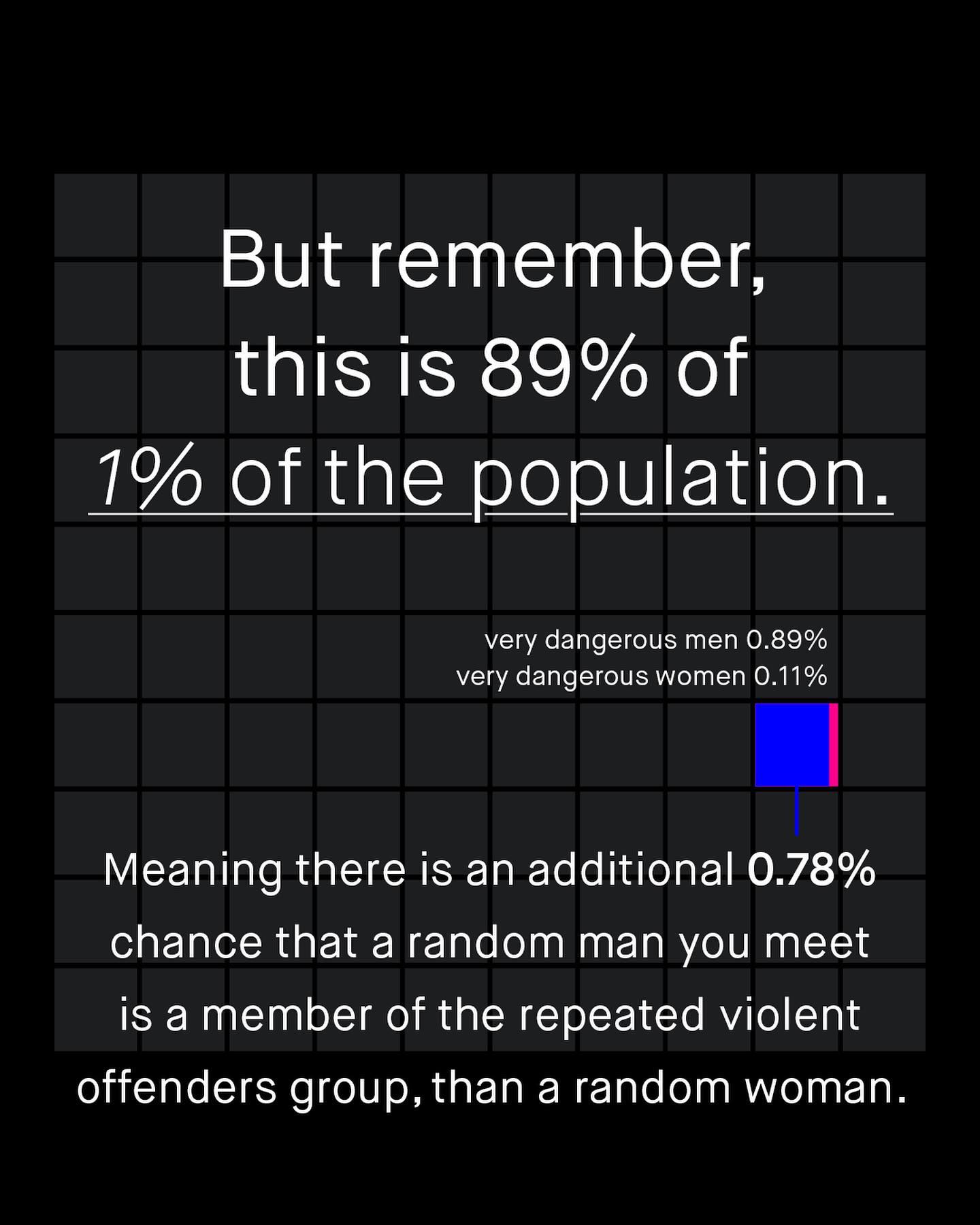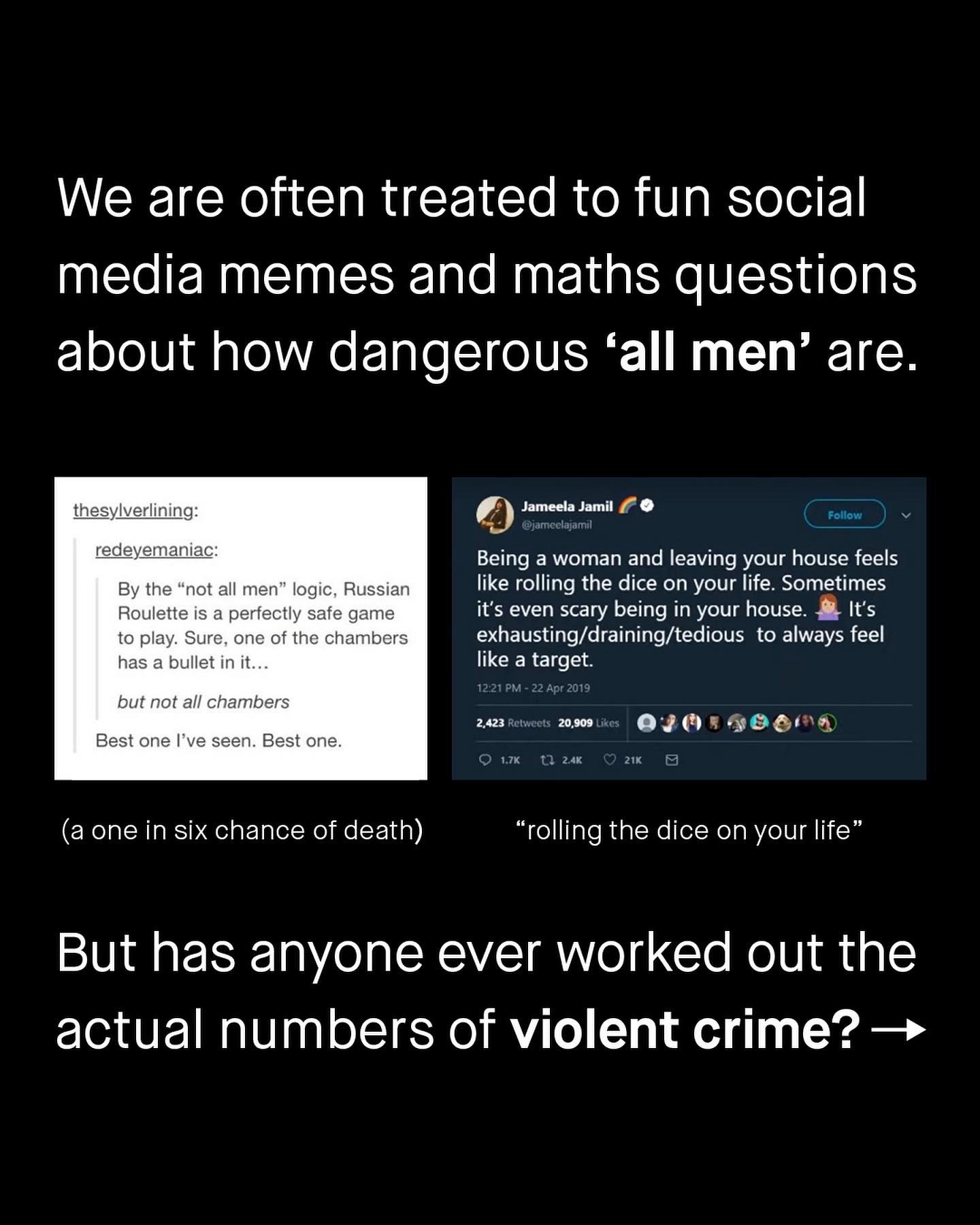 There is a meme out there that literally compares meeting a man to playing Russian Roulette. Yes, that’s right. The suggestion that simply by meeting a man, on any given day, you have a one in six chance of dying immediately. I don’t think I am alone in classifying such an idea as ‘a bit much’. And in fact, such a meme will not help women ‘feel safe’, but in fact feel terrified. So why has nobody ever done the maths to actually work out how dangerous men as a group are? How many legitimately violent and dangerous people are out there? Because let’s be clear on one thing – just because 90% of violent criminals are men, does not mean 90% of men are violent criminals. The majority of violent crime is perpetrated my a small minority of people, who yes, are mostly men. But outside of this, the vast majority of men are perfectly lovely, and no more or less dangerous than an average woman. And yet, such ideas remain boring to the shrill cries of gender advocacy, whose angry shrieks continue to explode all around us, causing a moral panic around men. Voices that compare any male interaction to, as Jamela Jamil calls it – ‘like rolling the dice with your life’. ...are you serious? Going outside in modern Britain, as a woman, is ‘like rolling the dice with your life.’ So I ask again, how are such words going to make women feel safer? And what do such dramatic, fear mongering and dehumanising thought experiments do for the mental health of our men and boys? I’d say it’s a lose lose. So let’s try again. Here are the numbers… ~ Study #notallmen