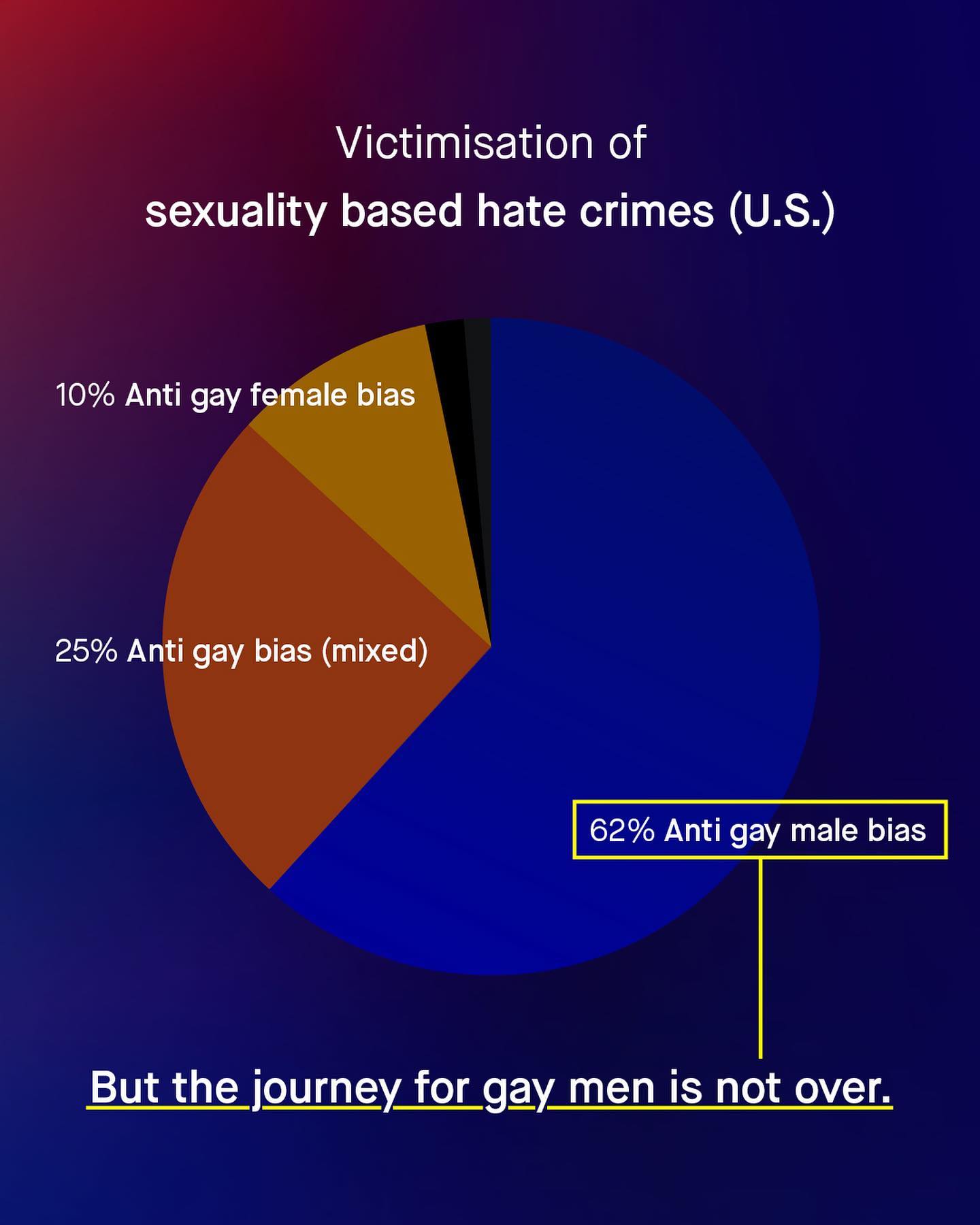 In a world of intersectionality, of representation and pride, I have always wondered why so few discuss the unique experiences of gay men. Because the way society sees and responds to gay men, is different to how it treats lesbian Society and its sexist views of women see them as less competent, weak and without agency, meaning we see women as innocently gay – to be trivialised and leered over, and just ‘a phase’ to grow out of. But society’s sexist views of men, are different. Society sees men as inherently guilty, as dangerous, and as instigators. And this takes them down a different road of homophobia. Not a phase at all, but ‘an abomination’ and an ‘outrage of decency’. That’s right. Men are not innocent, but ‘guilty’ of being gay, and I mean that quite literally. Few people know that most of the laws that criminalised homosexual relationships, including those in the U.K., specifically criminalised gay male relationships only. And whilst society did not condone lesbian women, it didn’t persecute them in the same way, or to the same degree. So the uniquely tragic and endlessly painful experiences of history’s gay men are forgotten, rolled into the ‘LGBT’ monolith, and overlooked. Worse, many gay men in LGBT communities are now being seen as as ‘the white men of LGBT’, increasingly unwelcome and somehow made to feel like the most privileged letter in the acronym. But history continues, and today the experiences of gay men are still not the same. They are less accepted in every country than lesbian women, more uncomfortable walking the streets with their partner, and experience hate crimes at several times the rate of lesbian women. Why is that? Is there any room to talk about how homophobia and anti male bigotry intersect? Is there no space for conversation about the uniquely devastating experiences of gay men? ~ Sources FBI Hate Crimes (2019) Lesbian women more accepted Images by Ha Nguy, Gradienta, Tiago Barleta, Codioiful, Ray Zhou, #gayrights #gaypride #lgbt #gaymenofinstagram